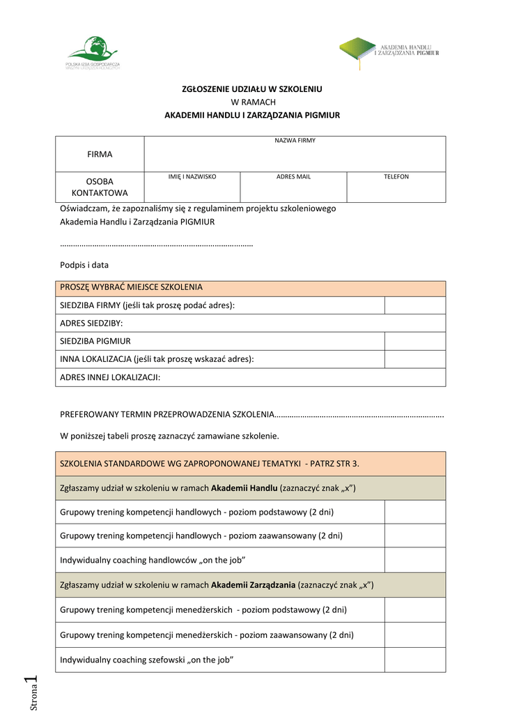 ZGŁOSZENIE UDZIAŁU W SZKOLENIU W RAMACH AKADEMII HANDLU I ZARZĄDZANIA PIGMIUR NAZWA FIRMY FIRMA OSOBA KONTAKTOWA IMIĘ I NAZWISKO ADRES MAIL TELEFON Oświadczam, że zapoznaliśmy się z regulaminem projektu szkoleniowego Akademia Handlu i Zarządzania PIGMIUR ……………………………………………………………………………… Podpis i data PROSZĘ WYBRAĆ MIEJSCE SZKOLENIA SIEDZIBA FIRMY (jeśli tak proszę podać adres): ADRES SIEDZIBY: SIEDZIBA PIGMIUR INNA LOKALIZACJA (jeśli tak proszę wskazać adres): ADRES INNEJ LOKALIZACJI: PREFEROWANY TERMIN PRZEPROWADZENIA SZKOLENIA……………………………………………………………………. W poniższej tabeli proszę zaznaczyć zamawiane szkolenie. SZKOLENIA STANDARDOWE WG ZAPROPONOWANEJ TEMATYKI - PATRZ STR 3. Zgłaszamy udział w szkoleniu w ramach Akademii Handlu (zaznaczyć znak „x”) Grupowy trening kompetencji handlowych - poziom podstawowy (2 dni) Grupowy trening kompetencji handlowych - poziom zaawansowany (2 dni) Indywidualny coaching handlowców „on the job” Zgłaszamy udział w szkoleniu w ramach Akademii Zarządzania (zaznaczyć znak „x”) Grupowy trening kompetencji menedżerskich - poziom podstawowy (2 dni) Grupowy trening kompetencji menedżerskich - poziom zaawansowany (2 dni) Strona 1 Indywidualny coaching szefowski „on the job” Jesteśmy zainteresowani zorganizowaniem szkolenia wg naszych indywidualnych potrzeb. Interesuje nas następująca tematyka: Grupowy trening kompetencji handlowych Proces i techniki skutecznej sprzedaży, Aktywne słuchanie Typologia klienta Profesjonalna obsługa klienta i telemarketing Zarządzanie czasem Różne modele negocjacji Taktyki, gry i style negocjacyjne Asertywność Reguły wywierania wpływu społecznego w negocjacjach BATNA Radzenie sobie ze stresem Indywidualny coaching handlowców „on the job” Inne tematy – proszę podać jakie: Grupowy trening kompetencji menedżerskich Expose szefa Aktywne słuchanie, udzielanie informacji zwrotnej – model FUO Motywowanie pracowników (nagradzanie, karanie, zwalnianie) Skuteczne rekrutowanie Zarządzanie przez cele – targety, czyli SMART w praktyce Diagnoza stylu kierowania Prezentacje i wystąpienia publiczne Zarządzanie jakością i innowacyjnością Proces grupowy i budowanie zespołu Delegowanie zadań, uprawnień i odpowiedzialność podwładnym Negocjacje i asertywność szefa Rozwój – coaching podwładnych Radzenie sobie ze stresem i wypaleniem zawodowym podwładnych Strona 2 Zarządzanie zmianą i konfliktem System ocen okresowych Indywidualny coaching szefowski „on the job” Inne tematy – proszę podać jakie: TEMATYKA SZKOLEŃ STANDARDOWYCH AKADEMIA HANDLU 1. Grupowy trening kompetencji handlowych - poziom podstawowy (2 dni): a) b) c) d) e) f) Proces i techniki skutecznej sprzedaży, Aktywne słuchanie, Typologia klienta, Profesjonalna obsługa klienta i telemarketing, Merchandising, Zarządzanie czasem. 2. Grupowy trening kompetencji handlowych - poziom zaawansowany (2 dni): a) b) c) d) e) f) Różne modele negocjacji, Taktyki, gry i style negocjacyjne, Asertywność, Reguły wywierania wpływu społecznego w negocjacjach, BATNA, Radzenie sobie ze stresem. AKADEMIA ZARZĄDZANIA 1. Grupowy trening kompetencji menedżerskich - poziom podstawowy (2 dni): a) b) c) d) e) f) g) h) Expose szefa, Aktywne słuchanie, udzielanie informacji zwrotnej – model FUO, Motywowanie pracowników (nagradzanie, karanie, zwalnianie), Skuteczne rekrutowanie, Zarządzanie przez cele – targety, czyli SMART w praktyce, Diagnoza stylu kierowania, Prezentacje i wystąpienia publiczne, Zarządzanie jakością i innowacyjnością. Strona 3 2. Grupowy trening kompetencji menedżerskich - poziom zaawansowany (2 dni): a) b) c) d) e) f) g) h) Proces grupowy i budowanie zespołu, Delegowanie zadań, uprawnień i odpowiedzialność podwładnym, Negocjacje i asertywność szefa, Rozwój – coaching podwładnych, Radzenie sobie ze stresem i wypaleniem zawodowym podwładnych, Zarządzanie zmianą i konfliktem, System ocen okresowych, Analiza strategiczna i/lub finansowa firmy.