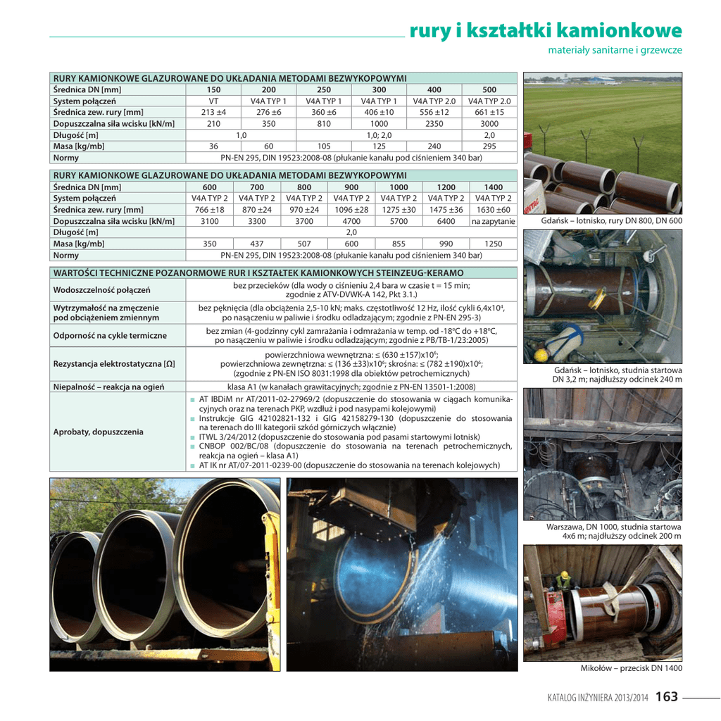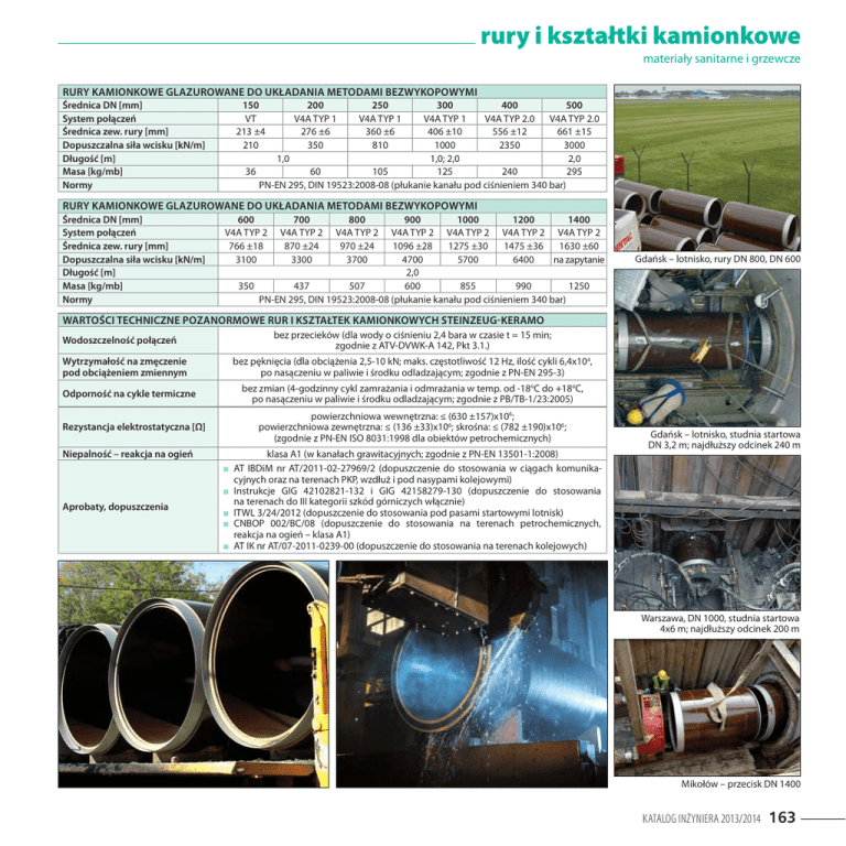 rury i kształtki kamionkowe materiały sanitarne i grzewcze RURY KAMIONKOWE GLAZUROWANE DO UKŁADANIA METODAMI BEZWYKOPOWYMI Średnica DN [mm] System połączeń Średnica zew. rury [mm] Dopuszczalna siła wcisku [kN/m] Długość [m] Masa [kg/mb] Normy 150 VT 213 ±4 210 200 V4A TYP 1 276 ±6 350 250 V4A TYP 1 360 ±6 810 300 400 500 V4A TYP 1 V4A TYP 2.0 V4A TYP 2.0 406 ±10 556 ±12 661 ±15 1000 2350 3000 1,0 1,0; 2,0 2,0 36 60 105 125 240 295 PN-EN 295, DIN 19523:2008-08 (płukanie kanału pod ciśnieniem 340 bar) RURY KAMIONKOWE GLAZUROWANE DO UKŁADANIA METODAMI BEZWYKOPOWYMI Średnica DN [mm] System połączeń Średnica zew. rury [mm] Dopuszczalna siła wcisku [kN/m] Długość [m] Masa [kg/mb] Normy 600 V4A TYP 2 766 ±18 3100 700 V4A TYP 2 870 ±24 3300 800 V4A TYP 2 970 ±24 3700 900 1000 1200 1400 V4A TYP 2 V4A TYP 2 V4A TYP 2 V4A TYP 2 1096 ±28 1275 ±30 1475 ±36 1630 ±60 4700 5700 6400 na zapytanie 2,0 350 437 507 600 855 990 1250 PN-EN 295, DIN 19523:2008-08 (płukanie kanału pod ciśnieniem 340 bar) Gdańsk – lotnisko, rury DN 800, DN 600 WARTOŚCI TECHNICZNE POZANORMOWE RUR I KSZTAŁTEK KAMIONKOWYCH STEINZEUG-KERAMO bez przecieków (dla wody o ciśnieniu 2,4 bara w czasie t = 15 min; zgodnie z ATV-DVWK-A 142, Pkt 3.1.) Wodoszczelność połączeń bez pęknięcia (dla obciążenia 2,5-10 kN; maks. częstotliwość 12 Hz, ilość cykli 6,4x104, po nasączeniu w paliwie i środku odladzającym; zgodnie z PN-EN 295-3) Wytrzymałość na zmęczenie pod obciążeniem zmiennym bez zmian (4-godzinny cykl zamrażania i odmrażania w temp. od -18oC do +18oC, po nasączeniu w paliwie i środku odladzającym; zgodnie z PB/TB-1/23:2005) Odporność na cykle termiczne powierzchniowa wewnętrzna: ≤ (630 ±157)x106; powierzchniowa zewnętrzna: ≤ (136 ±33)x106; skrośna: ≤ (782 ±190)x106; (zgodnie z PN-EN ISO 8031:1998 dla obiektów petrochemicznych) Rezystancja elektrostatyczna [Ω] Niepalność – reakcja na ogień ■ ■ Aprobaty, dopuszczenia ■ ■ ■ klasa A1 (w kanałach grawitacyjnych; zgodnie z PN-EN 13501-1:2008) AT IBDiM nr AT/2011-02-27969/2 (dopuszczenie do stosowania w ciągach komunikacyjnych oraz na terenach PKP, wzdłuż i pod nasypami kolejowymi) Instrukcje GIG 42102821-132 i GIG 42158279-130 (dopuszczenie do stosowania na terenach do III kategorii szkód górniczych włącznie) ITWL 3/24/2012 (dopuszczenie do stosowania pod pasami startowymi lotnisk) CNBOP 002/BC/08 (dopuszczenie do stosowania na terenach petrochemicznych, reakcja na ogień – klasa A1) AT IK nr AT/07-2011-0239-00 (dopuszczenie do stosowania na terenach kolejowych) Gdańsk – lotnisko, studnia startowa DN 3,2 m; najdłuższy odcinek 240 m Warszawa, DN 1000, studnia startowa 4x6 m; najdłuższy odcinek 200 m Mikołów – przecisk DN 1400 KATALOG INŻYNIERA 2013/2014 163