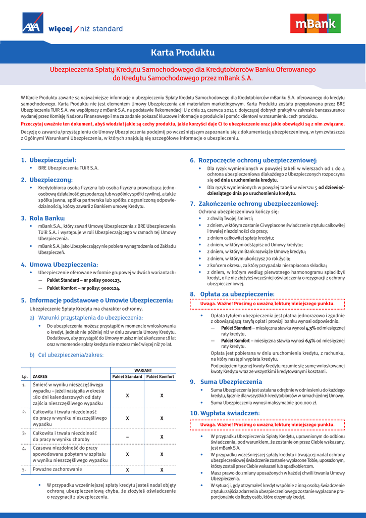 Karta Produktu Ubezpieczenia Spłaty Kredytu Samochodowego dla Kredytobiorców Banku Oferowanego do Kredytu Samochodowego przez mBank S.A. W Karcie Produktu zawarte są najważniejsze informacje o ubezpieczeniu Spłaty Kredytu Samochodowego dla Kredytobiorców mBanku S.A. oferowanego do kredytu samochodowego. Karta Produktu nie jest elementem Umowy Ubezpieczenia ani materiałem marketingowym. Karta Produktu została przygotowana przez BRE Ubezpieczenia TUiR S.A. we współpracy z mBank S.A. na podstawie Rekomendacji U z dnia 24 czerwca 2014 r. dotyczącej dobrych praktyk w zakresie bancassurance wydanej przez Komisję Nadzoru Finansowego i ma za zadanie pokazać kluczowe informacje o produkcie i pomóc klientowi w zrozumieniu cech produktu. Przeczytaj uważnie ten dokument, abyś wiedział jakie są cechy produktu, jakie korzyści daje Ci to ubezpieczenie oraz jakie obowiązki są z nim związane. Decyzję o zawarciu/przystąpieniu do Umowy Ubezpieczenia podejmij po wcześniejszym zapoznaniu się z dokumentacją ubezpieczeniową, w tym zwłaszcza z Ogólnymi Warunkami Ubezpieczenia, w których znajdują się szczegółowe informacje o ubezpieczeniu. 1. Ubezpieczyciel: • 6. Rozpoczęcie ochrony ubezpieczeniowej: BRE Ubezpieczenia TUiR S.A. • Dla ryzyk wymienionych w powyżej tabeli w wierszach od 1 do 4 ochrona ubezpieczeniowa dlakażdego z Ubezpieczonych rozpoczyna się od dnia uruchomienia kredytu. • Dla ryzyk wymienionych w powyżej tabeli w wierszu 5 od dziewięćdziesiątego dnia po uruchomieniu kredytu. 2. Ubezpieczony: • Kredytobiorca osoba fizyczna lub osoba fizyczna prowadząca jednoosobową działalność gospodarczą lub wspólnicy spółki cywilnej, a także spółka jawna, spółka partnerska lub spółka z ograniczoną odpowiedzialnością, którzy zawarli z Bankiem umowę Kredytu. 3. Rola Banku: • mBank S.A., który zawarł Umowę Ubezpieczenia z BRE Ubezpieczenia TUiR S.A. i występuje w roli Ubezpieczającego w ramach tej Umowy Ubezpieczenia. • mBankS.A. jako Ubezpieczający nie pobiera wynagrodzenia od Zakładu Ubezpieczeń. 4. Umowa Ubezpieczenia: • Ubezpieczenie oferowane w formie grupowej w dwóch wariantach: — Pakiet Standard – nr polisy 9000123, 7. Zakończenie ochrony ubezpieczeniowej: Ochrona ubezpieczeniowa kończy się: • z chwilą Twojej śmierci; • z dniem, w którym zostanie Ci wypłacone świadczenie z tytułu całkowitej i trwałej niezdolności do pracy; • z dniem całkowitej spłaty kredytu; • z dniem, w którym odstąpisz od Umowy kredytu; • z dniem, w którym Bank rozwiąże Umowę kredytu; • z dniem, w którym ukończysz 70 rok życia; • z końcem okresu, za który przypadała niezapłacona składka; • z dniem, w którym według pierwotnego harmonogramu spłaciłbyś kredyt, o ile nie złożyłeś wcześniej oświadczenia o rezygnacji z ochrony ubezpieczeniowej. — Pakiet Komfort – nr polisy: 9000124. 8. Opłata za ubezpieczenie: 5. Informacje podstawowe o Umowie Ubezpieczenia: Uwaga. Ważne! Prosimy o uważną lekturę niniejszego punktu. Ubezpieczenie Spłaty Kredytu ma charakter ochronny. • a) Warunki przystąpienia do ubezpieczenia: • Do ubezpieczenia możesz przystąpić w momencie wnioskowania o kredyt, jednak nie później niż w dniu zawarcia Umowy Kredytu. Dodatkowo, aby przystąpićdo Umowy musisz mieć ukończone 18 lat oraz w momencie spłaty kredytu nie możesz mieć więcej niż 70 lat. b) Cel ubezpieczenia/zakres: WARIANT Pakiet Standard Pakiet Komfort Lp. ZAKRES 1. Śmierć w wyniku nieszczęśliwego wypadku – jeżeli nastąpiła w okresie 180 dni kalendarzowych od daty zajścia nieszczęśliwego wypadku X Całkowita i trwała niezdolność do pracy w wyniku nieszczęśliwego wypadku X Całkowita i trwała niezdolność do pracy w wyniku choroby – X • Czasowa niezdolność do pracy spowodowana pobytem w szpitalu w wyniku nieszczęśliwego wypadku X X • Poważne zachorowanie X X 2. 3. 4. 5. • Opłata tytułem ubezpieczenia jest płatna jednorazowo i zgodnie z obowiązującą taryfą opłat i prowizji banku wynosi odpowiednio: — Pakiet Standard – miesięczna stawka wynosi 4,3% od miesięcznej raty kredytu, — Pakiet Komfort – miesięczna stawka wynosi 6,5% od miesięcznej raty kredytu. Opłata jest pobierana w dniu uruchomienia kredytu, z rachunku, na który nastąpi wypłata kredytu. Pod pojęciem łącznej kwoty Kredytu rozumie się sumę wnioskowanej kwoty Kredytu wraz ze wszystkimi kredytowanymi kosztami. 9. Suma Ubezpieczenia • X • X Suma Ubezpieczenia jest ustalana odrębnie w odniesieniu do każdego kredytu, łącznie dla wszystkich kredytobiorców w ramach jednej Umowy. Suma Ubezpieczenia wynosi maksymalnie 300.000 zł. 10. Wypłata świadczeń: Uwaga. Ważne! Prosimy o uważną lekturę niniejszego punktu. W przypadku wcześniejszej spłaty kredytu jesteś nadal objęty ochroną ubezpieczeniową chyba, że złożyłeś oświadczenie o rezygnacji z ubezpieczenia. • • W przypadku Ubezpieczenia Spłaty Kredytu, uprawnionym do odbioru świadczenia, pod warunkiem, że zostanie on przez Ciebie wskazany, jest mBankS.A. W przypadku wcześniejszej spłaty kredytu i trwającej nadal ochrony ubezpieczeniowej świadczenie zostanie wypłacone Tobie, uposażonym, którzyzostali przez Ciebie wskazani lub spadkobiercom. Masz prawo do zmiany uposażonych w każdej chwili trwania Umowy Ubezpieczenia. W sytuacji, gdy otrzymałeś kredyt wspólnie z inną osobą świadczenie z tytułu zajścia zdarzenia ubezpieczeniowego zostanie wypłacone proporcjonalnie do liczby osób, które otrzymały kredyt. • W przypadku wystąpienia zdarzenia ubezpieczeniowego zostanie wypłacone: Śmierć w wyniku nieszczęśliwego wypadku oraz całkowita i trwała niezdolność do pracy w wyniku choroby lub nieszczęśliwego wypadku Czasowa niezdolność do pracy spowodowana pobytem w wyniku nieszczęśliwego wypadku Poważne zachorowanie równowartość salda pozostającego do spłaty, tj. wysokość kap