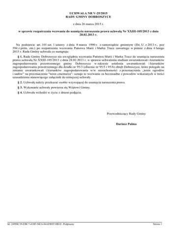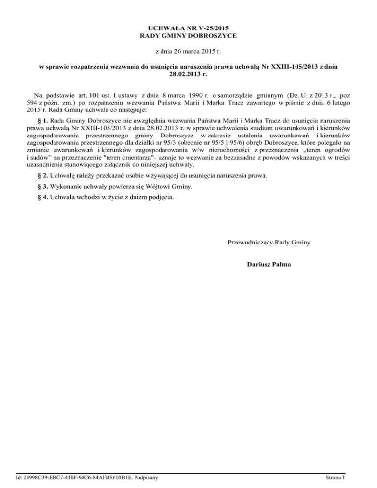UCHWAŁA NR V-25/2015 RADY GMINY DOBROSZYCE z dnia 26 marca 2015 r. w sprawie rozpatrzenia wezwania do usunięcia naruszenia prawa uchwalą Nr XXIII-105/2013 z dnia 28.02.2013 r. Na podstawie art. 101 ust. 1 ustawy z dnia 8 marca 1990 r. o samorządzie gminnym (Dz. U. z 2013 r., poz 594 z późn. zm.) po rozpatrzeniu wezwania Państwa Marii i Marka Tracz zawartego w piśmie z dnia 6 lutego 2015 r. Rada Gminy uchwala co następuje: § 1. Rada Gminy Dobroszyce nie uwzględnia wezwania Państwa Marii i Marka Tracz do usunięcia naruszenia prawa uchwalą Nr XXIII-105/2013 z dnia 28.02.2013 r. w sprawie uchwalenia studium uwarunkowań i kierunków zagospodarowania przestrzennego gminy Dobroszyce w zakresie ustalenia uwarunkowań i kierunków zagospodarowania przestrzennego dla działki nr 95/3 (obecnie nr 95/5 i 95/6) obręb Dobroszyce, które polegało na zmianie uwarunkowań i kierunków zagospodarowania w/w nieruchomości z przeznaczenia „teren ogrodów i sadów” na przeznaczenie "teren cmentarza"- uznaje to wezwanie za bezzasadne z powodów wskazanych w treści uzasadnienia stanowiącego załącznik do niniejszej uchwały. § 2. Uchwałę należy przekazać osobie wzywającej do usunięcia naruszenia prawa. § 3. Wykonanie uchwały powierza się Wójtowi Gminy. § 4. Uchwała wchodzi w życie z dniem podjęcia. Przewodniczący Rady Gminy Dariusz Palma Id: 24998C39-EBC7-410F-94C6-84AFB5F10B1E. Podpisany Strona 1 Załącznik do Uchwały Nr V-25/2015 Rady Gminy Dobroszyce z dnia 26 marca 2015 r. Uzasadnienie Uchwałą Nr XXIII-105/2013 z dnia 28.02.2013 r. rada Gminy Dobroszyce uchwaliła Studium uwarunkowań i kierunków zagospodarowania przestrzennego gminy Dobroszyce. Podjęcie uchwały poprzedzone było: - uchwałą Rady Gminy o przystąpieniu do sporządzenia studium, - obwieszczeniem ogłoszonym w prasie miejscowej o podjęciu uchwały o przystąpieniu do sporządzenia studium oraz o możliwości składania wniosków dot. studium w terminie 21dni, - obwieszczeniem ogłoszonym w prasie miejscowej oraz w sposób zwyczajowo przyjęty o wyłożeniu projektu studium do publicznego wglądu oraz o możliwości zgłaszania uwag do projektu w terminie 21 dni od zakończenia okresu wyłożenia, - wyłożeniem projektu studium do publicznego wglądu na okres 21 dni. Do projektu studium nie zgłoszono ani wniosków, ani uwag w zakresie objętym wezwaniem Państwa Marii i Marka Tracz. Uchwała dotycząca studium w wymaganym terminie została przesłana Wojewodzie Dolnośląskiemu sprawującemu ustawowy nadzór nad aktami prawnymi wydawanymi przez organy gmin. Wojewoda ani w okresie 30 dni od doręczenia uchwały ani w późniejszym postępowaniu przed Wojewódzkim Sądem Administracyjnym nie stwierdził naruszenia obowiązujących przepisów przez ustalenia Studium w zakresie objętym wezwaniem Państwa Marii i Marka Tracz odnośnie działki 95/3 (obecnie 95/5, 95/6). Należy również podkreślić że Państwo Maria i Marek Tracz nie posiadali i nie posiadają żadnych praw do działki gruntu nr 95/3 (obecnie 95/5, 95/6). Przewodniczący Rady Gminy Dariusz Palma Id: 24998C39-EBC7-410F-94C6-84AFB5F10B1E. Podpisany Strona 1