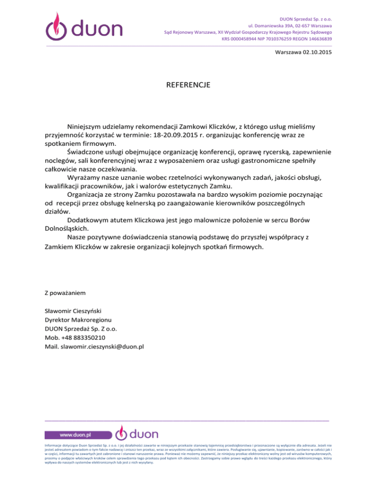DUON Sprzedaż Sp. z o.o. ul. Domaniewska 39A, 02-657 Warszawa Sąd Rejonowy Warszawa, XII Wydział Gospodarczy Krajowego Rejestru Sądowego KRS 0000458944 NIP 7010376259 REGON 146636839 _______________________________________________________________________________________________________________________________________________________ Warszawa 02.10.2015 REFERENCJE Niniejszym udzielamy rekomendacji Zamkowi Kliczków, z którego usług mieliśmy przyjemność korzystać w terminie: 18-20.09.2015 r. organizując konferencję wraz ze spotkaniem firmowym. Świadczone usługi obejmujące organizację konferencji, oprawę rycerską, zapewnienie noclegów, sali konferencyjnej wraz z wyposażeniem oraz usługi gastronomiczne spełniły całkowicie nasze oczekiwania. Wyrażamy nasze uznanie wobec rzetelności wykonywanych zadań, jakości obsługi, kwalifikacji pracowników, jak i walorów estetycznych Zamku. Organizacja ze strony Zamku pozostawała na bardzo wysokim poziomie poczynając od recepcji przez obsługę kelnerską po zaangażowanie kierowników poszczególnych działów. Dodatkowym atutem Kliczkowa jest jego malownicze położenie w sercu Borów Dolnośląskich. Nasze pozytywne doświadczenia stanowią podstawę do przyszłej współpracy z Zamkiem Kliczków w zakresie organizacji kolejnych spotkań firmowych. Z poważaniem Sławomir Cieszyński Dyrektor Makroregionu DUON Sprzedaż Sp. Z o.o. Mob. +48 883350210 Mail. [email protected] __________________________________________________________________________________ Informacje dotyczące Duon Sprzedaż Sp. z o.o. i jej działalności zawarte w niniejszym przekazie stanowią tajemnicę przedsiębiorstwa i przeznaczone są wyłącznie dla adresata. Jeżeli nie jesteś adresatem powiadom o tym fakcie nadawcę i zniszcz ten przekaz, wraz ze wszystkimi załącznikami, które zawiera. Posługiwanie się, ujawnianie, kopiowanie, zarówno w całości jak i w części, informacji tu zawartych jest zabronione i stanowi naruszenie prawa. Ponieważ nie możemy zapewnić, że niniejszy przekaz elektroniczny wolny jest od wirusów komputerowych, prosimy o podjęcie właściwych kroków celem sprawdzenia tego przekazu pod kątem ich obecności. Zastrzegamy sobie prawo wglądu do treści każdego przekazu elektronicznego, który wpływa do naszych systemów elektronicznych lub jest z nich wysyłany.
