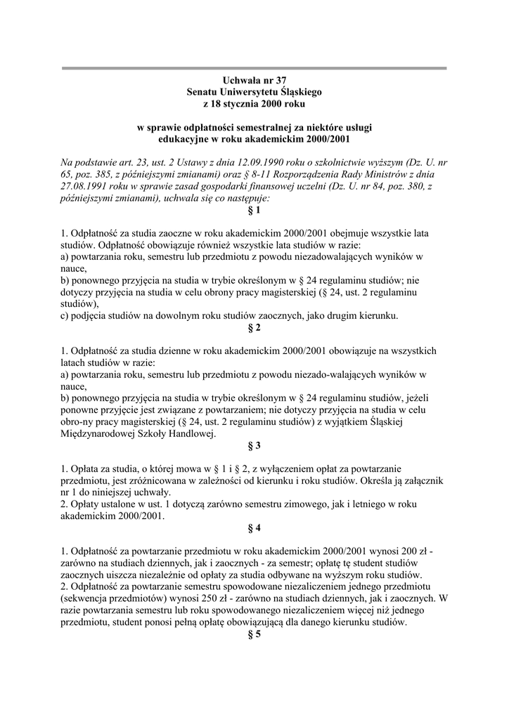Uchwała nr 37 Senatu Uniwersytetu Śląskiego z 18 stycznia 2000 roku w sprawie odpłatności semestralnej za niektóre usługi edukacyjne w roku akademickim 2000/2001 Na podstawie art. 23, ust. 2 Ustawy z dnia 12.09.1990 roku o szkolnictwie wyższym (Dz. U. nr 65, poz. 385, z późniejszymi zmianami) oraz § 8-11 Rozporządzenia Rady Ministrów z dnia 27.08.1991 roku w sprawie zasad gospodarki finansowej uczelni (Dz. U. nr 84, poz. 380, z późniejszymi zmianami), uchwala się co następuje: §1 1. Odpłatność za studia zaoczne w roku akademickim 2000/2001 obejmuje wszystkie lata studiów. Odpłatność obowiązuje również wszystkie lata studiów w razie: a) powtarzania roku, semestru lub przedmiotu z powodu niezadowalających wyników w nauce, b) ponownego przyjęcia na studia w trybie określonym w § 24 regulaminu studiów; nie dotyczy przyjęcia na studia w celu obrony pracy magisterskiej (§ 24, ust. 2 regulaminu studiów), c) podjęcia studiów na dowolnym roku studiów zaocznych, jako drugim kierunku. §2 1. Odpłatność za studia dzienne w roku akademickim 2000/2001 obowiązuje na wszystkich latach studiów w razie: a) powtarzania roku, semestru lub przedmiotu z powodu niezado-walających wyników w nauce, b) ponownego przyjęcia na studia w trybie określonym w § 24 regulaminu studiów, jeżeli ponowne przyjęcie jest związane z powtarzaniem; nie dotyczy przyjęcia na studia w celu obro-ny pracy magisterskiej (§ 24, ust. 2 regulaminu studiów) z wyjątkiem Śląskiej Międzynarodowej Szkoły Handlowej. §3 1. Opłata za studia, o której mowa w § 1 i § 2, z wyłączeniem opłat za powtarzanie przedmiotu, jest zróżnicowana w zależności od kierunku i roku studiów. Określa ją załącznik nr 1 do niniejszej uchwały. 2. Opłaty ustalone w ust. 1 dotyczą zarówno semestru zimowego, jak i letniego w roku akademickim 2000/2001. §4 1. Odpłatność za powtarzanie przedmiotu w roku akademickim 2000/2001 wynosi 200 zł zarówno na studiach dziennych, jak i zaocznych - za semestr; opłatę tę student studiów zaocznych uiszcza niezależnie od opłaty za studia odbywane na wyższym roku studiów. 2. Odpłatność za powtarzanie semestru spowodowane niezaliczeniem jednego przedmiotu (sekwencja przedmiotów) wynosi 250 zł - zarówno na studiach dziennych, jak i zaocznych. W razie powtarzania semestru lub roku spowodowanego niezaliczeniem więcej niż jednego przedmiotu, student ponosi pełną opłatę obowiązującą dla danego kierunku studiów. §5 Studenci studiów zaocznych wykonujący zawód nauczyciela wnoszą opłatę za studia w wysokości określonej dla danego kierunku studiów. Student otrzymujący dotację z MEN uiszcza opłatę w takim zakresie, w jakim ustalona opłata dla danego kierunku przekracza kwotę dotacji. §6 1. Ulgi w opłatach za studia mogą być przyznawane: a) studentom wyróżniającym się wynikami w nauce, b) studentom studiów dziennych podejmującym drugi kierunek studiów na studiach zaocznych, c) studentom będącym w wyjątkowo trudnej sytuacji życiowej. 2. Zasady przyznawania ulg studentom studiów zaocznych wyróżniającym się wynikami w nauce ustala Rada Wydziału. 3. Ulgi, o których mowa w ust. 1, pkt. a), b) nie mogą przekraczać połowy obowiązującej opłaty dla danego kierunku studiów. Skutki ulg, o których mowa w ust. 1, pkt. a) niniejszego paragrafu zalicza się w ciężar środków, które w myśl Zarządzenia Rektora nr 40/98 z 29 września 1998 roku w sprawie zasad gospodarowania środkami finansowymi uzyskiwanymi przez Uniwersytet z opłat za niektóre zajęcia dydaktyczne, pozostają w dyspozycji wydziału. Skutki ulg, o których mowa w ust. 1, pkt. b), c) zalicza się w połowie w ciężar środków pozostających w dyspozycji wydziału. 4. Ulgi, o których mowa w ust. 1, pkt. a) przyznaje Dziekan. 5. Ulgi, o których mowa w ust. 1, pkt. b), c) przyznaje Rektor po zasięgnięciu opinii Dziekana. Postanowienie to nie narusza § 7 niniejszej uchwały. §7 1. Rektor może przyznać osobie niepełnosprawnej studiującej na studiach zaocznych ulgę lub zwolnić ją z opłaty za studia. 2. Rektor może przyznać pracownikowi Uniwersytetu studiującemu na studiach zaocznych ulgę w wysokości 50% opłaty obowiązującej w danym semestrze. 3. Ulgi, o których mowa w ust. 1 i 2 zalicza się w połowie w ciężar środków pozostających w dyspozycji wydziału. 4. Ulgi lub zwolnienie z opłat przyznawane są na wniosek studenta. 5. Osobie niepełnosprawnej ulga lub zwolnienie z opłaty mogą być przyznane także na wniosek dziekana lub uczelnianego albo wydziałowego organu samorządu studenckiego. §8 1. Opłaty za studia powinny być uiszczane przed rozpoczęciem semestru w terminach: a) do 25 lipca - za semestr zimowy: studenci pierwszych lat studiów na kierunkach, na których przyjęcie następuje w formie zapisu według kolejności zgłoszeń; dotyczy kierunków: prawo i administracja oraz do 31 lipca w przypadku bibliotekoznawstwa i informacji naukowej dla absolwentów pomatural-nych szkół bibliotekarstwa i księgarstwa. b) do 29 września - za semestr zimowy: studenci, których nie dotyczy pkt. a); c) do 17 marca - za semestr letni. 2. W przypadku rozpoczęcia zajęć przed dniem 2 października 2000 roku, termin wniesienia opłaty określa dziekan wydziału. 3. W wyjątkowych, szczególnie uzasadnionych przypadkach dzie-kan może rozłożyć studentowi opłatę na raty. Ostatnia rata za semestr zimowy powinna być uiszczona do 15 grudnia. Ostatnia rata za semestr letni powinna być uiszczona do 19 maja. §9 Warunki zwrotu uiszczonej opłaty za studia w przypadku rezygnacji ze studiów zostały uregulowane odrębnym zarządzeniem Rektora. § 10 Uniwersytet nie pobiera od studentów studiów zaocznych opłaty za wydanie legitymacji studenckiej; mieści się ona w opłacie za studia. Pozostałe opłaty za wydanie dokumentów studentom studiów zaocznych pobiera się zgodnie z przepisami Zarządzenia Ministra Ed