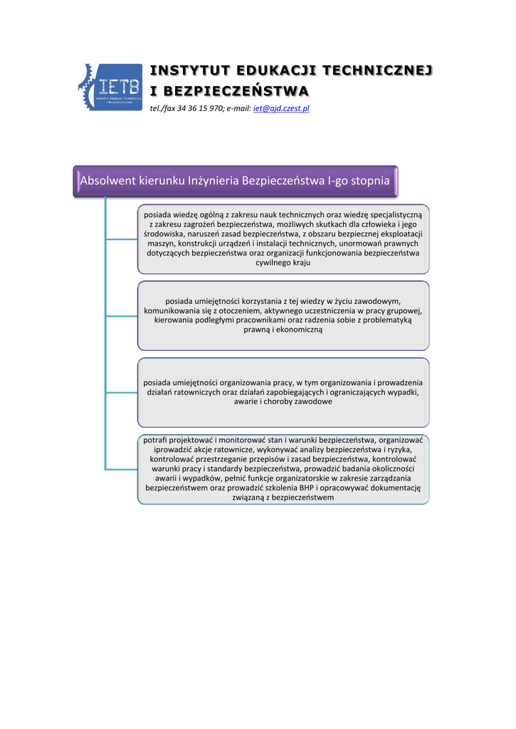 INSTYTUT EDUKACJI TECHNICZNEJ I BEZPIECZEŃSTWA tel./fax 34 36 15 970; e-mail: [email protected] Absolwent kierunku Inżynieria Bezpieczeństwa I-go stopnia posiada wiedzę ogólną z zakresu nauk technicznych oraz wiedzę specjalistyczną z zakresu zagrożeń bezpieczeństwa, możliwych skutkach dla człowieka i jego środowiska, naruszeń zasad bezpieczeństwa, z obszaru bezpiecznej eksploatacji maszyn, konstrukcji urządzeń i instalacji technicznych, unormowań prawnych dotyczących bezpieczeństwa oraz organizacji funkcjonowania bezpieczeństwa cywilnego kraju posiada umiejętności korzystania z tej wiedzy w życiu zawodowym, komunikowania się z otoczeniem, aktywnego uczestniczenia w pracy grupowej, kierowania podległymi pracownikami oraz radzenia sobie z problematyką prawną i ekonomiczną posiada umiejętności organizowania pracy, w tym organizowania i prowadzenia działań ratowniczych oraz działań zapobiegających i ograniczających wypadki, awarie i choroby zawodowe potrafi projektować i monitorować stan i warunki bezpieczeństwa, organizować iprowadzić akcje ratownicze, wykonywać analizy bezpieczeństwa i ryzyka, kontrolować przestrzeganie przepisów i zasad bezpieczeństwa, kontrolować warunki pracy i standardy bezpieczeństwa, prowadzić badania okoliczności awarii i wypadków, pełnić funkcje organizatorskie w zakresie zarządzania bezpieczeństwem oraz prowadzić szkolenia BHP i opracowywać dokumentację związaną z bezpieczeństwem Specjalności realizowane na kierunku Inzynieria Bezpieczenśtwa I-go śtopnia Zarządzanie Bezpieczeństwem i Higieną Pracy •Absolwent będzie posiadał wiedzę specjalistyczną z zakresu zarządzania środowiskiem pracy i systemami bezpieczeństwa, analizy i oceny stanu środowiska pracy, poziomu bezpieczeństwa i stosowanych technologii, bezpieczeństwa eksploatacji urządzeń technicznych, organizacji pracy służb BHP, jak również stosowania technik informatycznych w zarządzaniu bezpieczeństwem i higieną pracy (Komputerowy System STER Wspomagający Zarządzanie Bezpieczeństwem i Higieną Pracy) oraz wdrażania norm w BHP. Bezpieczeństwo Pracy i Środowiska •Absolwent będzie posiadał wiedzę specjalistyczną z zakresu bezpieczeństwa zawodowego i środowiskowego, w szczególności będzie przygotowany do diagnozowania zagrożeń oraz ryzyka i zawodowego, organizowania i koordynacji działań podczas awarii, katastrof, klęsk żywiołowych i innych zdarzeń nadzwyczajnych, likwidacji skutków, zarządzania bezpieczeństwem ekologicznym i komunikowania się w sytuacjach kryzysowych także z zakresu bezpieczeństwa systemów komputerowych. Systemy Monitoringu i Kontroli Dostępu •Absolwent będzie posiadał wiedzę specjalistyczną z zakresu technicznego zabezpieczenie mienia, metod zabezpieczenia danych cyfrowych i kontroli dostępu, ochrony danych osobowych i informacji niejawnych, organizacji oraz taktyki działań monitoringu, bezpieczeństwa infrastruktury krytycznej, podstaw prawnych wykonywania zadań monitoringu i ochrony mienia, projektowania systemów zabezpieczeń m.in. z zastosowaniem telewizji przemysłowej i radiowych urządzeń przesyłania sygnałów video jak również monitoringu mobilnego i ochrony pojazdów.