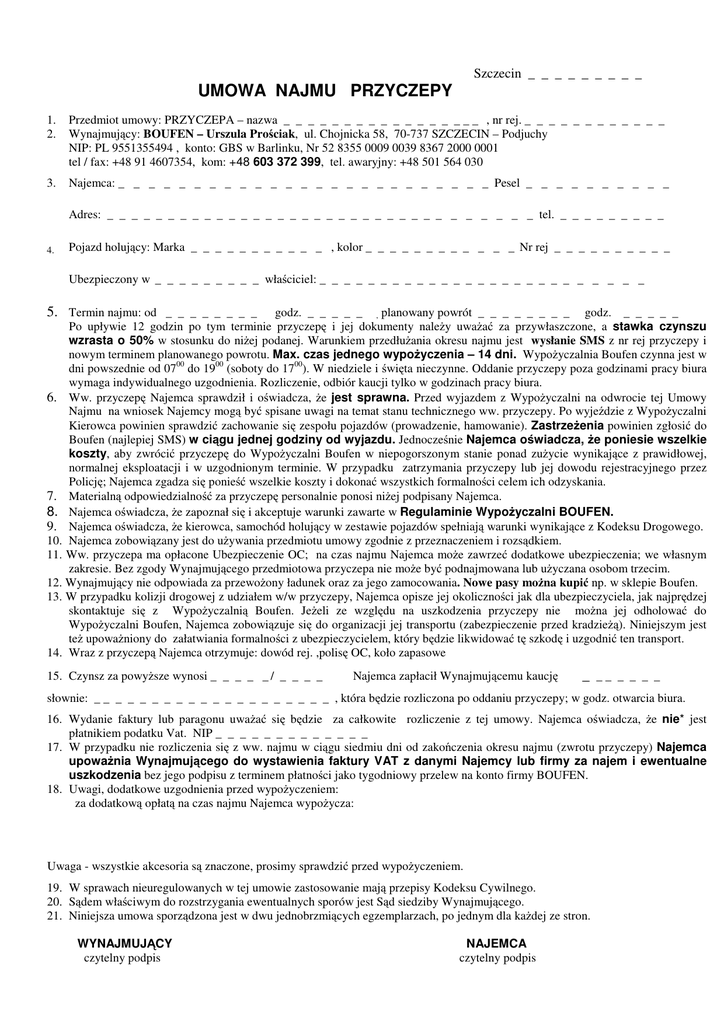 Szczecin _ _ _ _ _ _ _ _ _ UMOWA NAJMU PRZYCZEPY 1. 2. Przedmiot umowy: PRZYCZEPA – nazwa _ _ _ _ _ _ _ _ _ _ _ _ _ _ _ _ _ , nr rej. _ _ _ _ _ _ _ _ _ _ _ _ Wynajmujący: BOUFEN – Urszula Prościak, ul. Chojnicka 58, 70-737 SZCZECIN – Podjuchy NIP: PL 9551355494 , konto: GBS w Barlinku, Nr 52 8355 0009 0039 8367 2000 0001 tel / fax: +48 91 4607354, kom: +48 603 372 399, tel. awaryjny: +48 501 564 030 3. Najemca: _ _ _ _ _ _ _ _ _ _ _ _ _ _ _ _ _ _ _ _ _ _ _ _ _ Pesel _ _ _ _ _ _ _ _ _ _ Adres: _ _ _ _ _ _ _ _ _ _ _ _ _ _ _ _ _ _ _ _ _ _ _ _ _ _ _ _ _ _ _ _ _ _ tel. _ _ _ _ _ _ _ _ _ 4. Pojazd holujący: Marka _ _ _ _ _ _ _ _ _ _ _ , kolor _ _ _ _ _ _ _ _ _ _ _ _ Nr rej _ _ _ _ _ _ _ _ _ _ Ubezpieczony w _ _ _ _ _ _ _ _ _ właściciel: _ _ _ _ _ _ _ _ _ _ _ _ _ _ _ _ _ _ _ _ _ _ _ _ _ _ 5. Termin najmu: od _ _ _ _ _ _ _ _ godz. _ _ _ _ _ , planowany powrót _ _ _ _ _ _ _ _ godz. _ _ _ _ _ Po upływie 12 godzin po tym terminie przyczepę i jej dokumenty należy uważać za przywłaszczone, a stawka czynszu wzrasta o 50% w stosunku do niżej podanej. Warunkiem przedłużania okresu najmu jest wysłanie SMS z nr rej przyczepy i nowym terminem planowanego powrotu. Max. czas jednego wypożyczenia – 14 dni. Wypożyczalnia Boufen czynna jest w dni powszednie od 0700 do 1900 (soboty do 1700). W niedziele i święta nieczynne. Oddanie przyczepy poza godzinami pracy biura wymaga indywidualnego uzgodnienia. Rozliczenie, odbiór kaucji tylko w godzinach pracy biura. 6. Ww. przyczepę Najemca sprawdził i oświadcza, że jest sprawna. Przed wyjazdem z Wypożyczalni na odwrocie tej Umowy Najmu na wniosek Najemcy mogą być spisane uwagi na temat stanu technicznego ww. przyczepy. Po wyjeździe z Wypożyczalni Kierowca powinien sprawdzić zachowanie się zespołu pojazdów (prowadzenie, hamowanie). Zastrzeżenia powinien zgłosić do Boufen (najlepiej SMS) w ciągu jednej godziny od wyjazdu. Jednocześnie Najemca oświadcza, że poniesie wszelkie koszty, aby zwrócić przyczepę do Wypożyczalni Boufen w niepogorszonym stanie ponad zużycie wynikające z prawidłowej, normalnej eksploatacji i w uzgodnionym terminie. W przypadku zatrzymania przyczepy lub jej dowodu rejestracyjnego przez Policję; Najemca zgadza się ponieść wszelkie koszty i dokonać wszystkich formalności celem ich odzyskania. 7. Materialną odpowiedzialność za przyczepę personalnie ponosi niżej podpisany Najemca. 8. Najemca oświadcza, że zapoznał się i akceptuje warunki zawarte w Regulaminie Wypożyczalni BOUFEN. 9. Najemca oświadcza, że kierowca, samochód holujący w zestawie pojazdów spełniają warunki wynikające z Kodeksu Drogowego. 10. Najemca zobowiązany jest do używania przedmiotu umowy zgodnie z przeznaczeniem i rozsądkiem. 11. Ww. przyczepa ma opłacone Ubezpieczenie OC; na czas najmu Najemca może zawrzeć dodatkowe ubezpieczenia; we własnym zakresie. Bez zgody Wynajmującego przedmiotowa przyczepa nie może być podnajmowana lub użyczana osobom trzecim. 12. Wynajmujący nie odpowiada za przewożony ładunek oraz za jego zamocowania. Nowe pasy można kupić np. w sklepie Boufen. 13. W przypadku kolizji drogowej z udziałem w/w przyczepy, Najemca opisze jej okoliczności jak dla ubezpieczyciela, jak najprędzej skontaktuje się z Wypożyczalnią Boufen. Jeżeli ze względu na uszkodzenia przyczepy nie można jej odholować do Wypożyczalni Boufen, Najemca zobowiązuje się do organizacji jej transportu (zabezpieczenie przed kradzieżą). Niniejszym jest też upoważniony do załatwiania formalności z ubezpieczycielem, który będzie likwidować tę szkodę i uzgodnić ten transport. 14. Wraz z przyczepą Najemca otrzymuje: dowód rej. ,polisę OC, koło zapasowe 15. Czynsz za powyższe wynosi _ _ _ _ _ / _ _ _ _ Najemca zapłacił Wynajmującemu kaucję _ __ _ _ _ _ słownie: _ _ _ _ _ _ _ _ _ _ _ _ _ _ _ _ _ _ _ _ , która będzie rozliczona po oddaniu przyczepy; w godz. otwarcia biura. 16. Wydanie faktury lub paragonu uważać się będzie za całkowite rozliczenie z tej umowy. Najemca oświadcza, że nie* jest płatnikiem podatku Vat. NIP _ _ _ _ _ _ _ _ _ _ _ _ _ 17. W przypadku nie rozliczenia się z ww. najmu w ciągu siedmiu dni od zakończenia okresu najmu (zwrotu przyczepy) Najemca upoważnia Wynajmującego do wystawienia faktury VAT z danymi Najemcy lub firmy za najem i ewentualne uszkodzenia bez jego podpisu z terminem płatności jako tygodniowy przelew na konto firmy BOUFEN. 18. Uwagi, dodatkowe uzgodnienia przed wypożyczeniem: za dodatkową opłatą na czas najmu Najemca wypożycza: Uwaga - wszystkie akcesoria są znaczone, prosimy sprawdzić przed wypożyczeniem. 19. W sprawach nieuregulowanych w tej umowie zastosowanie mają przepisy Kodeksu Cywilnego. 20. Sądem właściwym do rozstrzygania ewentualnych sporów jest Sąd siedziby Wynajmującego. 21. Niniejsza umowa sporządzona jest w dwu jednobrzmiących egzemplarzach, po jednym dla każdej ze stron. WYNAJMUJĄCY czytelny podpis NAJEMCA czytelny podpis