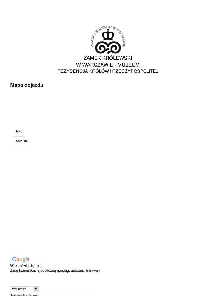 ZAMEK KRÓLEWSKI W WARSZAWIE - MUZEUM REZYDENCJA KRÓLÓW I RZECZYPOSPOLITEJ Mapa dojazdu Map Satellite Wskazówki dojazdu Jadę komunikacją publiczną (pociąg, autobus, tramwaj) Warszawa Nazwa ulicy, Numer Nazwa ulicy, Numer Szukaj --Wybierz-Mapa Zamek Królewski w Warszawie - Muzeum. Rezydencja Królów i Rzeczypospolitej. plac Zamkowy 4, 00-277 Warszawa informacja: tel. +48 22 35 55 170, fax +48 22 35 55 127 e-mail: informacja Zamek Królewski w Warszawie - Muzeum. Rezydencja Królów i Rzeczypospolitej www.zamek-krolewski.pl
