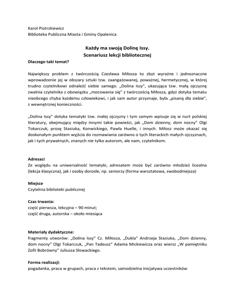 Karol Piotrzkiewicz Biblioteka Publiczna Miasta i Gminy Opalenica Każdy ma swoją Dolinę Issy. Scenariusz lekcji bibliotecznej Dlaczego taki temat? Największy problem z twórczością Czesława Miłosza to zbyt wyraźne i jednoznaczne wprowadzenie jej w obszary sztuki tzw. zaangażowanej, poważnej, hermetycznej, w której trudno czytelnikowi odnaleźd siebie samego. „Dolina Issy”, ukazująca tzw. małą ojczyznę zwalnia czytelnika z obowiązku „mocowania się” z twórczością Miłosza, gdyż dotyka tematu nieobcego chyba każdemu człowiekowi, i jak sam autor przyznaje, była „pisaną dla siebie”, z wewnętrznej konieczności. „Dolina Issy” dotyka tematyki tzw. małej ojczyzny i tym samym wpisuje się w nurt polskiej literatury, obejmujący między innymi takie powieści, jak „Dom dzienny, dom nocny” Olgi Tokarczuk, prozę Stasiuka, Konwickiego, Pawła Huelle, i innych. Miłosz może okazad się doskonałym punktem wyjścia do rozmawiania zarówno o tych literackich małych ojczyznach, jak i tych prywatnych, znanych nie tylko autorom, ale nam, czytelnikom. Adresaci Ze względu na uniwersalnośd tematyki, adresatem może byd zarówno młodzież licealna (lekcja klasyczna), jak i osoby dorosłe, np. seniorzy (forma warsztatowa, swobodniejsza) Miejsce Czytelnia biblioteki publicznej Czas trwania: częśd pierwsza, lekcyjna – 90 minut; częśd druga, autorska – około miesiąca Materiały dydaktyczne: fragmenty utworów: „Dolina Issy” Cz. Miłosza, „Dukla” Andrzeja Stasiuka, „Dom dzienny, dom nocny” Olgi Tokarczuk, „Pan Tadeusz” Adama Mickiewicza oraz wiersz „W pamiętniku Zofii Bobrówny” Juliusza Słowackiego. Forma realizacji: pogadanka, praca w grupach, praca z tekstem, samodzielna inicjatywa uczestników Cele ogólne: zapoznanie się z motywem „małej ojczyzny” na przykładzie wybranych tekstów literackich i filmowych; poznanie i zaprezentowanie innym swej własnej małej ojczyzny Cele szczegółowe: zebrani znają wybrane utwory literatury polskiej, opisujące małą ojczyznę; znają różne sposoby i style opisywania tego tematu; dostrzegają zabiegi mitologizujące „małe ojczyzny” wybranych autorów; potrafią sami określid swe własne małe ojczyzny; realizują własne prace (wiersz, proza, fotografia, film) ukazujące swoje „małe ojczyzny”. Orientacyjny kosztorys: zaletą owego scenariusza jest na pewno fakt, że jego realizacja nie wymaga dużych nakładów finansowych, jeśli tylko biblioteka posiada własną stronę internetową oraz miejsce, gdzie może zorganizowad wystawę prac, przedstawionych w drugiej części projektu. Natomiast najciekawsze prace uczestników powinny zostad wyróżnione nagrodami rzeczowymi. Najbardziej adekwatnymi byłby nagrody książkowe (tomiki poetyckie Miłosza, jego biografia autorstwa Andrzeja Franaszka), filmy dotykające tematyki „małej ojczyzny” („Wino truskawkowe” Dariusza Jabłooskiego, będące adaptacją „Opowieści galicyjskich” Andrzeja Stasiuka, filmy Jana Jakuba Kolskiego, bądź „Wszystko, co kocham” Jacka Borcucha). Ilośd nagród będzie zależed oczywiście od poziomu oraz ilości nadesłanych prac, lecz zakup nagród na pewno nie przekroczy kwoty 400-500 zł. Przebieg: Częśd I: Lekcja biblioteczna a) Wprowadzenie: osoba prowadząca pyta się zebranych, z czym kojarzy im się termin „mała ojczyzna”; po wypowiedziach uczestników, prowadzący cytuje wypowiedź Leszka Kołakowskiego: Mała ojczyzna „to miasto, czy wieś w której się urodziliśmy, to środek świata. To przestrzeo niewielka, w której się obracamy – nasze domy, ulice, cmentarze, kościoły, to przestrzeo niewielka wielkim wysiłkiem ludzkim zabudowana, przez wojny niszczona i odbudowywana, to centrum świata”. kolejne pytania: Czym, prócz miejsca, w którym się urodziliśmy, wychowaliśmy, może byd jeszcze „mała ojczyzna”? Do jakiego miejsca wracacie myślami najchętniej, gdy wspominacie najmilsze chwile waszego życia? po odpowiedziach, należy podkreślid, że właśnie wszystkie wymienione miejsca, są zapewne „małymi ojczyznami” rozmówców. wskazanie, że takim samym miejscem była dla Czesława Miłosza tytułowa „Dolina Issy” b) Fragmenty z Miłosza: rozdanie zebranym 3 fragmentów „Doliny Issy” (załącznik 1), którzy mają je przeczytad, po czym scharakteryzowad przestrzeo, opisywaną w utworze Miłosza. W przytoczonych fragmentach okolice Issy zostają ukazane z sentymentem, ale też z dużą ilością folkloru, grozy i makabry. A co najważniejsze – owa przestrzeo ulega u Miłosza zabiegowi mityzacji. Na wszystkie te elementy należy zwrócid uwagę. fragment 1 ukazuje krainę opisywaną przez Czesława Miłosza jako zamieszkiwaną przez diabły: Osobliwością doliny Issy jest większa niż gdzie indziej ilość diabłów. Być może spróchniałe wierzby, młyny, chaszcze na brzegach są szczególnie wygodne dla istot, które ukazują się oczom ludzkim tylko wtedy, kiedy same sobie tego życzą. Ci, co je widzieli, mówią, że diabeł jest nieduży, wzrostu dziewięcioletniego dziecka, że nosi zielony fraczek, żabot, włosy splecione w harcap, białe pończochy i przy pomocy pantofli na wysokich obcasach stara się ukryć kopyta, których się wstydzi. Do tych opowiadań trzeba się odnieść z pewną ostrożnością. Jest prawdopodobne, ze diabły, znając zabobonny podziw ludności dla Niemców – ludzi handlu, wynalazków i nauki – starają się sobie dodać powagi, ubierając się jak Immanuel Kant z Królewca. Nie darmo inna nazwa nieczystej siły jest nad Issą „Niemczyk” – oznaczająca, że diabeł jest po stronie postępu. Jednak trudno przypuścić, żeby nosiły taki strój na co dzień. Na przykład ulubioną ich zabawą jest tańczyć w osieciach, pustych szopach, gdzie międli się len, stojących zwykle na uboczu od zabudowań, jakże mogłyby we frakach wzbijać kłęby kurzu i paździerzy, nie troszczą