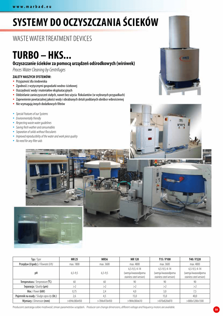 w w w.marbad.eu SYSTEMY DO OCZYSZCZANIA ŚCIEKÓW WASTE WATER TREATMENT DEVICES TURBO – HKS... Oczyszczanie ścieków za pomocą urządzeń odśrodkowych (wirówek) Proces Water Cleaning by Centrifuges ZALETY NASZYCH SYSTEMÓW: Przyjazność dla środowiska Zgodność z wytycznymi gospodarki wodno-ściekowej Oszczędność wody i materiałów eksploatacyjnych Oddzielanie zanieczyszczeń stałych, nawet bez użycia flokulantów (w wybranych przypadkach) Zapewnienie powtarzalnej jakości wody i obrabianych detali poddanych obróbce wibrościernej Nie wymagają innych dodatkowych filtrów Special Features of our Systems Environmentally friendly Respecting waste water guidelines Saving fresh wather and consumables Separation of solids without flocculants Improved reproducibility of the water and work piece quality No need for any filter aids Typ / Type Przepływ (l/godz.) / Flowrate (l/h) MR 25 max. 1800 MR56 max. 3600 pH 6,5-9,5 6,5-9,5 Temperatura / Temperature (⁰C) Separacja / Quality (µm) Moc / Power (kW) Pojemnik na osady / Sludge capa city (lit.) Wymiary / Dimension (mm) 60 >2 0,75 2,6 >694x380x450 60 >2 2,4 4,5 >784x470x450 MR 120 max. 4800 6,5-9,5; 4-14 (wersja kwasoodporna stainless steel version) 90 >2 4,0 15,0 >984x580x610 T15 / P100 max. 3600 6,5-9,5; 4-14 (wersja kwasoodporna stainless steel version) 90 >2 3,0 15,0 >870x820x870 Producent zastrzega sobie możliwość zmian parametrów urządzeń. Producer can change dimensions, different voltage and frequency motors are available. T40 / P220 max. 4800 6,5-9,5; 4-14 (wersja kwasoodporna stainless steel version) 90 >2 7,5 40,0 >800x1200x1300 19