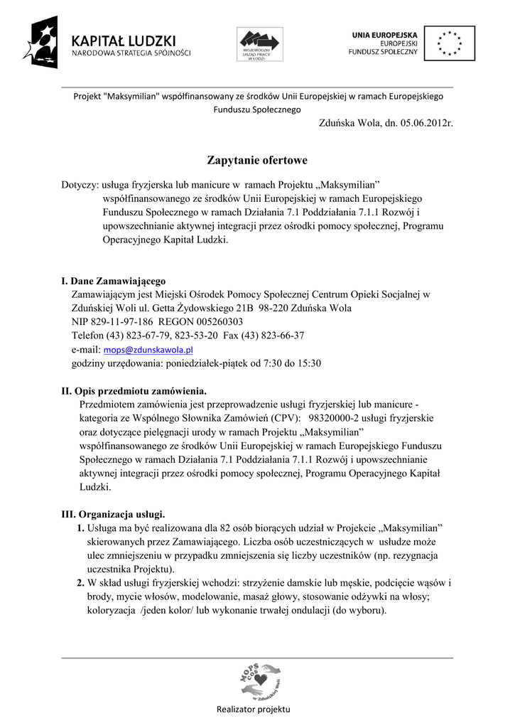 Projekt "Maksymilian" współfinansowany ze środków Unii Europejskiej w ramach Europejskiego Funduszu Społecznego Zduńska Wola, dn. 05.06.2012r. Zapytanie ofertowe Dotyczy: usługa fryzjerska lub manicure w ramach Projektu „Maksymilian” współfinansowanego ze środków Unii Europejskiej w ramach Europejskiego Funduszu Społecznego w ramach Działania 7.1 Poddziałania 7.1.1 Rozwój i upowszechnianie aktywnej integracji przez ośrodki pomocy społecznej, Programu Operacyjnego Kapitał Ludzki. I. Dane Zamawiającego Zamawiającym jest Miejski Ośrodek Pomocy Społecznej Centrum Opieki Socjalnej w Zduńskiej Woli ul. Getta Żydowskiego 21B 98-220 Zduńska Wola NIP 829-11-97-186 REGON 005260303 Telefon (43) 823-67-79, 823-53-20 Fax (43) 823-66-37 e-mail: [email protected] godziny urzędowania: poniedziałek-piątek od 7:30 do 15:30 II. Opis przedmiotu zamówienia. Przedmiotem zamówienia jest przeprowadzenie usługi fryzjerskiej lub manicure kategoria ze Wspólnego Słownika Zamówień (CPV): 98320000-2 usługi fryzjerskie oraz dotyczące pielęgnacji urody w ramach Projektu „Maksymilian” współfinansowanego ze środków Unii Europejskiej w ramach Europejskiego Funduszu Społecznego w ramach Działania 7.1 Poddziałania 7.1.1 Rozwój i upowszechnianie aktywnej integracji przez ośrodki pomocy społecznej, Programu Operacyjnego Kapitał Ludzki. III. Organizacja usługi. 1. Usługa ma być realizowana dla 82 osób biorących udział w Projekcie „Maksymilian” skierowanych przez Zamawiającego. Liczba osób uczestniczących w usłudze może ulec zmniejszeniu w przypadku zmniejszenia się liczby uczestników (np. rezygnacja uczestnika Projektu). 2. W skład usługi fryzjerskiej wchodzi: strzyżenie damskie lub męskie, podcięcie wąsów i brody, mycie włosów, modelowanie, masaż głowy, stosowanie odżywki na włosy; koloryzacja /jeden kolor/ lub wykonanie trwałej ondulacji (do wyboru). Realizator projektu Projekt "Maksymilian" współfinansowany ze środków Unii Europejskiej w ramach Europejskiego Funduszu Społecznego 3. W skład usługi manicure wchodzi: zabieg skrócenia i opiłowania płytki, zamknięcie łusek paznokcia, odżywka, oliwka nawilżająca, balsam pielęgnacyjny na dłonie, malowanie paznokci /jeden kolor lub french/. 4. Uczestnik projektu ma do wyboru jedną usługę. 5. Usługa odbywać się będzie poza siedzibą Zamawiającego na terenie Zduńskiej Woli. Wykonawca powinien załączyć szczegółową informację, dotyczącą miejsca ich prowadzenia. 8. Pomieszczenia, w których będą odbywać się zajęcia winny być przystosowane pod względem sanitarnym, przeciwpożarowym i bhp do prowadzenia zajęć, co należy potwierdzić stosownym oświadczeniem. Miejsca, w których realizowane będą zajęcia powinny być odpowiednio oznaczone logotypami Unii Europejskiej, Europejskiego Funduszu Społecznego dostarczonymi przez Zamawiającego. 9. Wykonawca ponosi odpowiedzialność za bezpieczeństwo uczestników przedmiotu umowy w czasie jego trwania. 10. Szczegółowy termin wykonywanej usługi Wykonawca zobowiązany jest ustalać z pracownikiem socjalnym projektu. 11. Każdy uczestnik przedstawia voucher (talon) na realizację usługi (załącznik do SIWZ). 12. Wykonawca zobowiązany jest do sporządzania i prowadzenia dokumentacji wykonanych usług. Po zakończeniu realizacji usługi Wykonawca zobowiązany jest do przekazania Zamawiającemu w oryginale następujących dokumentów: - harmonogram pracy, - potwierdzenie (imienne + pieczątka zakładu) wykonania usługi na voucherze, - potwierdzenie na voucherze własnoręcznym podpisem przez uczestnika Projektu faktu wykonania usługi, - protokół z wykonania usługi wraz ze specyfikacją rozbicia kosztów składających się na cenę usługi. 13. Specjaliści realizujący program merytoryczny powinni mieć praktyczną i teoretyczną wiedzę w zakresie wykonywanej usługi, wynikającą z wykonywanego zawodu lub pełnionej funkcji: dla fryzjera(ki)- wykształcenie kierunkowe, minimum czeladnik, znajomość sztuki fryzjerskiej, dla manicurzystki- wykształcenie kierunkowe, minimum czeladnik, znajomość sztuki kosmetycznej, 14. Zamawiający zawiera z Wykonawcą umowę zlecenie. 15. Zamawiający zastrzega sobie prawo do dokonania kontroli prowadzonej usługi w trakcie jej realizacji. 16. Odbiór wykonanej usługi przeprowadzony zostanie na podstawie dokumentacji złożonej przez Wykonawcę. Realizator projektu Projekt "Maksymilian" współfinansowany ze środków Unii Europejskiej w ramach Europejskiego Funduszu Społecznego IV. Termin wykonania zamówienia. Zamówienie będzie realizowane w okresie od czerwca do lipca 2012r. V. Opis sposobu przygotowania oferty. 1. Oferta musi zawierać następujące elementy: - określenia nazwy i siedziby Wykonawcy, - harmonogram usługi, - koszt usługi brutto (załącznik nr 1- formularz oferty), - podpisany własnoręcznym podpisem formularz oferty, 2. Wykonawca zobowiązany jest sporządzić ofertę w języku polskim z zachowaniem formy pisemnej pod rygorem nieważności, zgodnie z wymaganiami niniejszego zapytania ofertowego. Zamawiający dopuszcza złożenia oferty w formie elektronicznej na adres e-mail Zamawiającego. Oferta przesłana pocztą elektroniczną musi zostać dostarczona następnie w formie papierowej (w tym przypadku za datę wpłynięcia oferty uważa się wpłynięcie oferty drogą elektroniczną). 3. Poprawki powinny być naniesione czytelnie oraz opatrzone datą i podpisem osoby podpisującej ofertę. 4. Ofertę należy złożyć w zamkniętej kopercie w sekretariacie Miejskiego Ośrodka Pomocy Społecznej Centrum Opieki Socjalnej, ul. Getta Żydowskiego 21B lub wysłać pocztą na adres Zamawiającego w terminie do 13.06.2012r.. godz. 10:00. 5. Dokumenty złożone w formie kserokopii powinny być opatrzone klauzulą „za zgodność z oryginałem” przez Wykonawcę. 6. Każdy Wykonawca może złożyć tylko jedną ofertę. 7. Wszystkie koszty związa