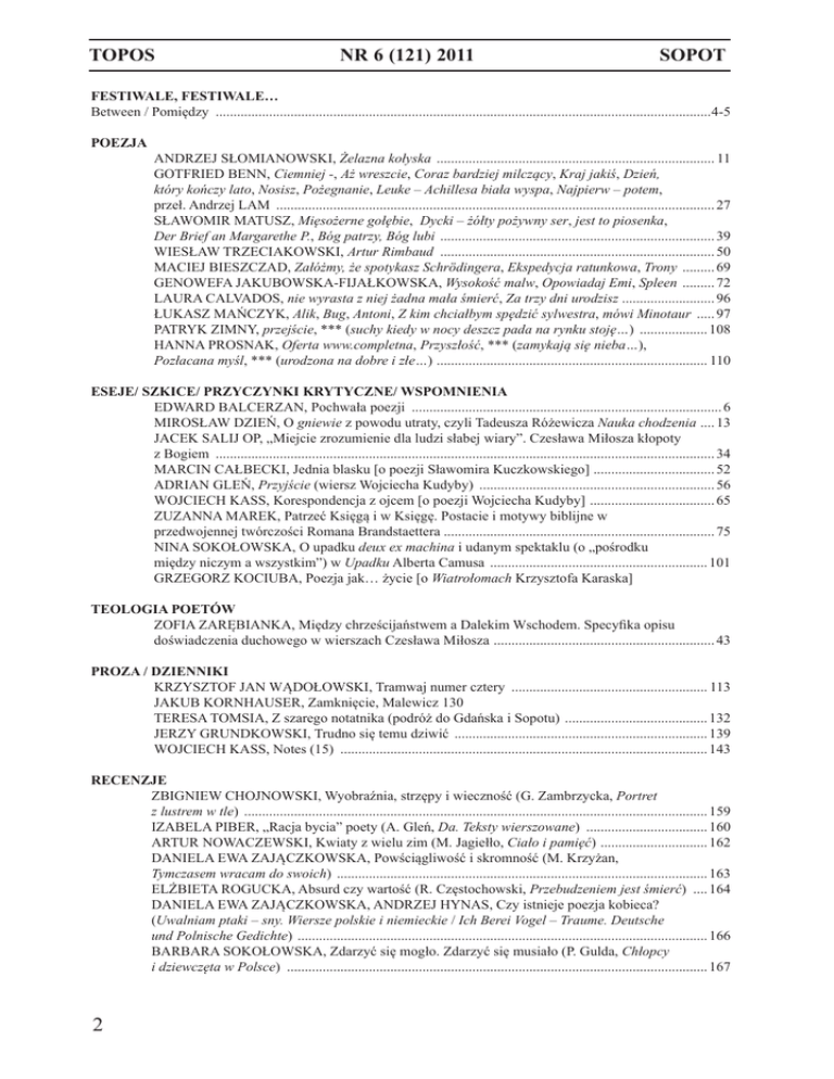 TOPOS NR 6 (121) 2011 SOPOT FESTIWALE, FESTIWALE… Between / Pomiędzy ............................................................................................................................................4-5 POEZJA ANDRZEJ SŁOMIANOWSKI, Żelazna kołyska ............................................................................... 11 GOTFRIED BENN, Ciemniej -, Aż wreszcie, Coraz bardziej milczący, Kraj jakiś, Dzień, który kończy lato, Nosisz, Pożegnanie, Leuke – Achillesa biała wyspa, Najpierw – potem, przeł. Andrzej LAM ............................................................................................................................ 27 SŁAWOMIR MATUSZ, Mięsożerne gołębie, Dycki – żółty pożywny ser, jest to piosenka, Der Brief an Margarethe P., Bóg patrzy, Bóg lubi .............................................................................. 39 WIESŁAW TRZECIAKOWSKI, Artur Rimbaud .............................................................................. 50 MACIEJ BIESZCZAD, Załóżmy, że spotykasz Schrödingera, Ekspedycja ratunkowa, Trony .......... 69 GENOWEFA JAKUBOWSKA-FIJAŁKOWSKA, Wysokość malw, Opowiadaj Emi, Spleen .......... 72 LAURA CALVADOS, nie wyrasta z niej żadna mała śmierć, Za trzy dni urodzisz .......................... 96 ŁUKASZ MAŃCZYK, Alik, Bug, Antoni, Z kim chciałbym spędzić sylwestra, mówi Minotaur ...... 97 PATRYK ZIMNY, przejście, *** (suchy kiedy w nocy deszcz pada na rynku stoję…) .................... 108 HANNA PROSNAK, Oferta www.completna, Przyszłość, *** (zamykają się nieba…), Pozłacana myśl, *** (urodzona na dobre i złe…) . ........................................................................... 110 ESEJE/ SZKICE/ PRZYCZYNKI KRYTYCZNE/ WSPOMNIENIA EDWARD BALCERZAN, Pochwała poezji ........................................................................................ 6 MIROSŁAW DZIEŃ, O gniewie z powodu utraty, czyli Tadeusza Różewicza Nauka chodzenia . ... 13 JACEK SALIJ OP, „Miejcie zrozumienie dla ludzi słabej wiary”. Czesława Miłosza kłopoty z Bogiem ............................................................................................................................................. 34 MARCIN CAŁBECKI, Jednia blasku [o poezji Sławomira Kuczkowskiego] .................................. 52 ADRIAN GLEŃ, Przyjście (wiersz Wojciecha Kudyby) ................................................................... 56 WOJCIECH KASS, Korespondencja z ojcem [o poezji Wojciecha Kudyby] . .................................. 65 ZUZANNA MAREK, Patrzeć Księgą i w Księgę. Postacie i motywy biblijne w przedwojennej twórczości Romana Brandstaettera ............................................................................ 75 NINA SOKOŁOWSKA, O upadku deux ex machina i udanym spektaklu (o „pośrodku między niczym a wszystkim”) w Upadku Alberta Camusa .............................................................. 101 GRZEGORZ KOCIUBA, Poezja jak… życie [o Wiatrołomach Krzysztofa Karaska] TEOLOGIA POETÓW ZOFIA ZARĘBIANKA, Między chrześcijaństwem a Dalekim Wschodem. Specyfika opisu doświadczenia duchowego w wierszach Czesława Miłosza . ............................................................. 43 PROZA / DZIENNIKI KRZYSZTOF JAN WĄDOŁOWSKI, Tramwaj numer cztery ........................................................ 113 JAKUB KORNHAUSER, Zamknięcie, Malewicz 130 TERESA TOMSIA, Z szarego notatnika (podróż do Gdańska i Sopotu) ......................................... 132 JERZY GRUNDKOWSKI, Trudno się temu dziwić ........................................................................ 139 WOJCIECH KASS, Notes (15) ........................................................................................................ 143 RECENZJE ZBIGNIEW CHOJNOWSKI, Wyobraźnia, strzępy i wieczność (G. Zambrzycka, Portret z lustrem w tle) ................................................................................................................................... 159 IZABELA PIBER, „Racja bycia” poety (A. Gleń, Da. Teksty wierszowane) ................................... 160 ARTUR NOWACZEWSKI, Kwiaty z wielu zim (M. Jagiełło, Ciało i pamięć) . ............................. 162 DANIELA EWA ZAJĄCZKOWSKA, Powściągliwość i skromność (M. Krzyżan, Tymczasem wracam do swoich) ......................................................................................................... 163 ELŻBIETA ROGUCKA, Absurd czy wartość (R. Częstochowski, Przebudzeniem jest śmierć) ..... 164 DANIELA EWA ZAJĄCZKOWSKA, ANDRZEJ HYNAS, Czy istnieje poezja kobieca? (Uwalniam ptaki – sny. Wiersze polskie i niemieckie / Ich Berei Vogel – Traume. Deutsche und Polnische Gedichte) .................................................................................................................... 166 BARBARA SOKOŁOWSKA, Zdarzyć się mogło. Zdarzyć się musiało (P. Gulda, Chłopcy i dziewczęta w Polsce) ....................................................................................................................... 167 2 RYSZARD KOŁODZIEJ, Robinson chodzący po asfalcie (F. Huber, Wasilij Grossman: Pamięć i listy) .................................................................................................................................... 169 PIOTR W. LORKOWSKI, Kapelmistrza Almayera poglądy na życie (A. Turczyński, Koncert muzyki dawnej) . ................................................................................................................... 171 KATARZYNA PANFIL, Meandry recepcji (Z. Chojnowski, Od biografii do recepcji. Ernst Wiechert, Konstanty I. Gałczyński, Zbigniew Herbert na Warmii i Mazurach) ................................ 172 RYSZARD KOŁODZIEJ, Ibsenowskie nastroje (J. Iwaszkiewicz, Listy do córek) ......................... 173 MONIKA MALESSA-DROHOMIRECKA, Jak zostać komentatorem. Na przykładzie Ma