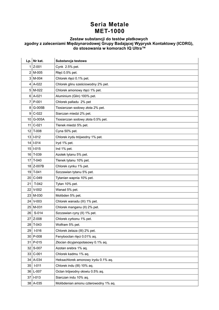Seria Metale MET-1000 Zestaw substancji do testów płatkowych zgodny z zaleceniami Międzynarodowej Grupy Badającej Wyprysk Kontaktowy (ICDRG), do stosowania w komorach IQ Ultra™ Lp. Nr kat. Substancja testowa 1 Z-001 Cynk 2.5% pet. 2 M-005 Rtęć 0.5% pet. 3 M-004 Chlorek rtęci 0.1% pet. 4 A-022 Chlorek glinu sześciowodny 2% pet. 5 M-022 Chlorek amonowy rtęci 1% pet. 6 A-021 Aluminium (Glin) 100% pet. 7 P-001 Chlorek palladu 2% pet 8 G-005B Tiosiarczan sodowy złota 2% pet. 9 C-022 Siarczan miedzi 2% pet. 10 G-005A Tiosiarczan sodowy złota 0.5% pet. 11 C-021 Tlenek miedzi 5% pet. 12 T-008 Cyna 50% pet. 13 I-012 Chlorek irydu trójwodny 1% pet. 14 I-014 Iryd 1% pet. 15 I-015 Ind 1% pet. 16 T-039 Azotek tytanu 5% pet. 17 T-040 Tlenek tytanu 10% pet. 18 Z-007B Chlorek cynku 1% pet. 19 T-041 Szczawian tytanu 5% pet. 20 C-049 Tytanian wapnia 10% pet. 21 T-042 Tytan 10% pet. 22 V-002 Wanad 5% pet. 23 M-030 Molibden 5% pet. 24 V-003 Chlorek wanadu (III) 1% pet. 25 M-031 Chlorek manganu (II) 2% pet. 26 S-014 Szczawian cyny (II) 1% pet. 27 Z-008 Chlorek cyrkonu 1% pet. 28 T-043 Wolfram 5% pet. 29 I-016 Chlorek żelaza (III) 2% pet. 30 P-008 Fenylooctan rtęci 0.01% aq. 31 P-015 Złocian dicyjanopotasowy 0.1% aq. 32 S-007 Azotan srebra 1% aq. 33 C-001 Chlorek kadmu 1% aq. 34 A-034 Heksachlorek amonowy irydu 0.1% aq. 35 I-011 Chlorek indu (III) 10% aq. 36 L-007 Octan trójwodny ołowiu 0.5% aq. 37 I-013 Siarczan indu 10% aq. 38 A-035 Molibdenian amonu czterowodny 1% aq. Lp. Nr kat. Substancja testowa 39 S-013 Chlorek cyny (II) 1% pet. 40 L-008 Chlorek ołowiu 0.2% aq. 41 A-010 Sześciochlorek amonowy platyny 0.1% aq. 42 A-013 Czterochlorek amonowy platyny 0.25% aq. 43 S-017 Czterochlorek sodowy palladu uwodniony 3,0% waz. 44 G-007 Tlenek galu 1% waz. 45 R-012 Ruten 0,1% waz. 46 S-019 Wolframian sodu dwuwodny 2% wod. 47 V-005 Tlenek wanadu 10% waz. 48 A-038 Wodorotlenek glinu 10% waz. 49 M-038 Chlorek molibdenu 0,5% waz. 50 N-008 Chlorek niobu 0,2% waz. 51 T-047 Tantal 1% waz. 52 Z-009 Dwutlenek cyrkonu 0,1% w 53 R-013 Chlorek rodu uwodniony 2% waz. 54 B-044 Siarczan berylu czterowodny 1% waz. Stosować 20 μl roztworu wazelinowego lub 30 μl roztworu wodnego na 1 test. 1 opakowanie wystarcza na 250 testów Producent: Chemotechnique Diagnostics, Modemgatan 9, SE-235 39, Vellinge, Szwecja Wyłączny dystrybutor: Instytut Dermatologii sp. z o. o., ul. Władysława Łokietka 294A, 31-334 Kraków, tel. 012 416 62 62 Przechowywać w ciemności, w temp. 5-8ºC Data ważności podana na opakowaniach poszczególnych substancji.