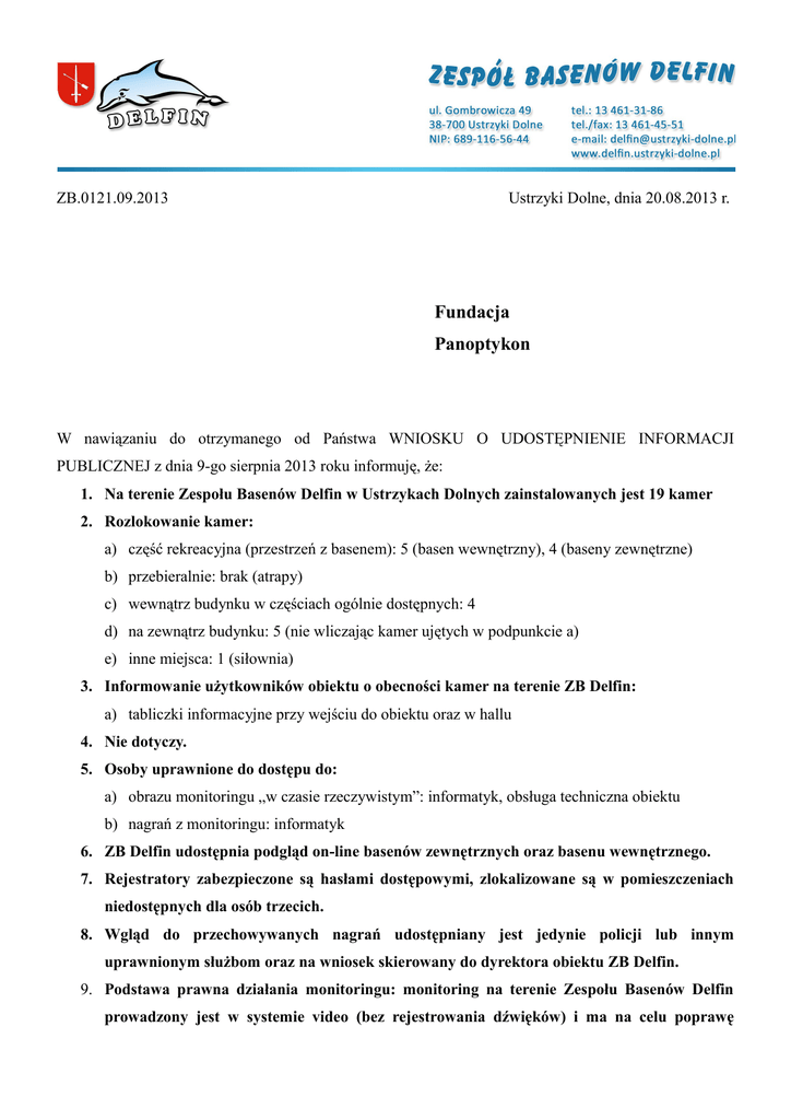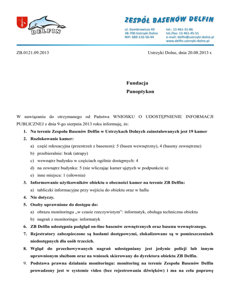ZB.0121.09.2013 Ustrzyki Dolne, dnia 20.08.2013 r. Fundacja Panoptykon W nawiązaniu do otrzymanego od Państwa WNIOSKU O UDOSTĘPNIENIE INFORMACJI PUBLICZNEJ z dnia 9-go sierpnia 2013 roku informuję, że: 1. Na terenie Zespołu Basenów Delfin w Ustrzykach Dolnych zainstalowanych jest 19 kamer 2. Rozlokowanie kamer: a) część rekreacyjna (przestrzeń z basenem): 5 (basen wewnętrzny), 4 (baseny zewnętrzne) b) przebieralnie: brak (atrapy) c) wewnątrz budynku w częściach ogólnie dostępnych: 4 d) na zewnątrz budynku: 5 (nie wliczając kamer ujętych w podpunkcie a) e) inne miejsca: 1 (siłownia) 3. Informowanie użytkowników obiektu o obecności kamer na terenie ZB Delfin: a) tabliczki informacyjne przy wejściu do obiektu oraz w hallu 4. Nie dotyczy. 5. Osoby uprawnione do dostępu do: a) obrazu monitoringu „w czasie rzeczywistym”: informatyk, obsługa techniczna obiektu b) nagrań z monitoringu: informatyk 6. ZB Delfin udostępnia podgląd on-line basenów zewnętrznych oraz basenu wewnętrznego. 7. Rejestratory zabezpieczone są hasłami dostępowymi, zlokalizowane są w pomieszczeniach niedostępnych dla osób trzecich. 8. Wgląd do przechowywanych nagrań udostępniany jest jedynie policji lub innym uprawnionym służbom oraz na wniosek skierowany do dyrektora obiektu ZB Delfin. 9. Podstawa prawna działania monitoringu: monitoring na terenie Zespołu Basenów Delfin prowadzony jest w systemie video (bez rejestrowania dźwięków) i ma na celu poprawę bezpieczeństwa użytkowników pływalni z poszanowaniem życia prywatnego i godności ludzkiej. Monitoring (poza streamingiem on-line) pełni jedynie funkcję prewencyjną przeciwdziałanie kradzieżom, włamaniom, niszczeniu mienia, naruszaniu przepisów pływalni etc. Zapis video zostaje automatycznie nadpisany po zapełnieniu się wewnętrznych pamięci urządzeń rejestrujących, materiał video nie jest w jakikolwiek sposób archiwizowany przez Zespół Basenów Delfin. 10. Zasady korzystania z monitoringu: wyłącznie do użytku wewnętrznego dla Administratora obiektu. Z poważaniem Kazimierz Matwiej