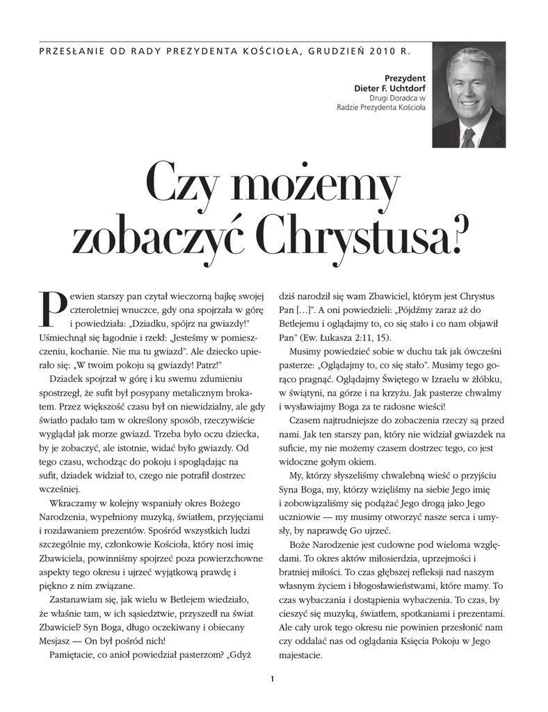 P r z e s ł a n i e o d R a d y P r e z y d e n ta K o ś c i o ł a , g r u d z i e ń 2 0 1 0 r . Prezydent Dieter F. Uchtdorf Drugi Doradca w Radzie Prezydenta Kościoła P Czy możemy zobaczyć Chrystusa? ewien starszy pan czytał wieczorną bajkę swojej czteroletniej wnuczce, gdy ona spojrzała w górę i powiedziała: „Dziadku, spójrz na gwiazdy!” Uśmiechnął się łagodnie i rzekł: „Jesteśmy w pomieszczeniu, kochanie. Nie ma tu gwiazd”. Ale dziecko upierało się: „W twoim pokoju są gwiazdy! Patrz!” Dziadek spojrzał w górę i ku swemu zdumieniu spostrzegł, że sufit był posypany metalicznym brokatem. Przez większość czasu był on niewidzialny, ale gdy światło padało tam w określony sposób, rzeczywiście wyglądał jak morze gwiazd. Trzeba było oczu dziecka, by je zobaczyć, ale istotnie, widać było gwiazdy. Od tego czasu, wchodząc do pokoju i spoglądając na sufit, dziadek widział to, czego nie potrafił dostrzec wcześniej. Wkraczamy w kolejny wspaniały okres Bożego Narodzenia, wypełniony muzyką, światłem, przyjęciami i rozdawaniem prezentów. Spośród wszystkich ludzi szczególnie my, członkowie Kościoła, który nosi imię Zbawiciela, powinniśmy spojrzeć poza powierzchowne aspekty tego okresu i ujrzeć wyjątkową prawdę i piękno z nim związane. Zastanawiam się, jak wielu w Betlejem wiedziało, że właśnie tam, w ich sąsiedztwie, przyszedł na świat Zbawiciel? Syn Boga, długo oczekiwany i obiecany Mesjasz — On był pośród nich! Pamiętacie, co anioł powiedział pasterzom? „Gdyż dziś narodził się wam Zbawiciel, którym jest Chrystus Pan […]”. A oni powiedzieli: „Pójdźmy zaraz aż do Betlejemu i oglądajmy to, co się stało i co nam objawił Pan” (Ew. Łukasza 2:11, 15). Musimy powiedzieć sobie w duchu tak jak ówcześni pasterze: „Oglądajmy to, co się stało”. Musimy tego gorąco pragnąć. Oglądajmy Świętego w Izraelu w żłóbku, w świątyni, na górze i na krzyżu. Jak pasterze chwalmy i wysławiajmy Boga za te radosne wieści! Czasem najtrudniejsze do zobaczenia rzeczy są przed nami. Jak ten starszy pan, który nie widział gwiazdek na suficie, my nie możemy czasem dostrzec tego, co jest widoczne gołym okiem. My, którzy słyszeliśmy chwalebną wieść o przyjściu Syna Boga, my, którzy wzięliśmy na siebie Jego imię i zobowiązaliśmy się podążać Jego drogą jako Jego uczniowie — my musimy otworzyć nasze serca i umysły, by naprawdę Go ujrzeć. Boże Narodzenie jest cudowne pod wieloma względami. To okres aktów miłosierdzia, uprzejmości i bratniej miłości. To czas głębszej refleksji nad naszym własnym życiem i błogosławieństwami, które mamy. To czas wybaczania i dostąpienia wybaczenia. To czas, by cieszyć się muzyką, światłem, spotkaniami i prezentami. Ale cały urok tego okresu nie powinien przesłonić nam czy oddalać nas od oglądania Księcia Pokoju w Jego majestacie. 1 Uczyńmy z tegorocznych Świąt Bożego Narodzenia czas wychwalania i radości, czas, gdy przyjmujemy fakt cudu, że Wszechmocny Bóg zesłał Swojego Jednorodzonego Syna, Jezusa Chrystusa, by zbawił świat! wspaniałej świątecznej kolacji podzieliłyśmy się z nimi przesłaniem bożonarodzeniowym. Poprosiłyśmy ich, by narysowali obrazki przedstawiające rzeczy, które przypominają im ten okres, na przykład gwiazdki, szopki i choinki. Potem przeczytałyśmy fragmenty pism świętych, w tym 2 Nefi 19:6: „Albowiem Pomysły na nauczanie na podstawie tego przesłania Dziecię nam się narodziło, Syn został nam dany, na Jego barkach spocznie władza. I nazwany będzie imieniem: 1. „Zajęcia koncentrowania uwagi mogą być użyte Cudowny Doradca, Bóg Mocny, Odwieczny Ojciec, do tego, aby wzbudzić zainteresowanie oraz pomóc Książę Pokoju”. Zaśpiewałyśmy hymn „Once in Royal uczniom skupić swą uwagę na temacie lekcji. […] David’s City” (Hymns, nr 205), obejrzałyśmy z nimi film Ilustracje są cennymi narzędziami, wzmacniającymi o narodzeniu Pana i złożyłyśmy świadectwo o Jezusie główną ideę lekcji i pomagającymi uczniom w zachowa- Chrystusie. niu uwagi” („Nauczanie — nie ma większego powoła- To były proste świąteczne okoliczności, z dala od nia” [2000], str. 183, 164). Gdy zaczniecie dzielić się tym naszych rodzin i według ogólnie przyjętych zwyczajów, przesłaniem, możecie skupić uwagę słuchaczy poprzez ale gdy składałyśmy świadectwo o Zbawicielu, poczułam pokazanie jakiejś ilustracji lub przeczytanie fragmentu z głębszą niż dotąd miłość i wdzięczność za Niego i Jego pism świętych i spytanie rodziny, w jaki sposób nawią- narodziny. Uświadomiłam sobie, że to są ostatnie święta zują one do tego przesłania. Bożego Narodzenia podczas pełnoetatowej misjonar- 2. „Jednym z najważniejszych celów powinno być skiej służby mojemu Niebiańskiemu Ojcu, ale zrozumia- pomaganie innym w zastosowaniu zasad ewange- łam też, że Jego Duch może świadczyć mi o Jego Synu, lii w codziennych sytuacjach. […] [Pomóż] uczniom gdziekolwiek się znajdę. odkryć błogosławieństwa, które przychodzą wtedy, kiedy żyjemy według ewangelii” („Nauczanie — nie Dzieci ma większego powołania” str. 181). Po przekazaniu tego przesłania, zastanówcie się, czy nie poprosić Chcieć zobaczyć Zbawiciela członków rodziny, by podzielili się doświadczeniami, P rezydent Uchtdorf powiedział, że w czasie świąt które mieli, gdy myśleli o Zbawicielu podczas okresu Bożego Narodzenia powinniśmy zwracać się ku bożonarodzeniowego. sprawom, które przypominają nam życie Zbawiciela. Odnajdźcie poniższe fragmenty pism świętych, by do- Młodzież wiedzieć się o ważnych wydarzeniach w Jego życiu. Ew. Mateusza 2:1–2 Misjonarskie Boże Narodzenie Ew. Łukasza 2:46 Loran Cook Ew. Mateusza 15:32–38 P odczas drugich świąt Bożego Narodzenia mojej Ew. Łukasza 8:49–55 pełnoetatowej m