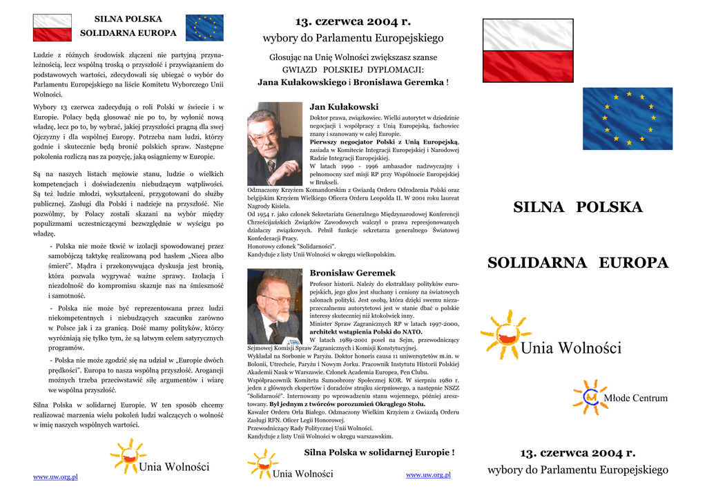 SILNA POLSKA 13. czerwca 2004 r. SOLIDARNA EUROPA wybory do Parlamentu Europejskiego Ludzie z różnych środowisk złączeni nie partyjną przynależnością, lecz wspólną troską o przyszłość i przywiązaniem do podstawowych wartości, zdecydowali się ubiegać o wybór do Parlamentu Europejskiego na liście Komitetu Wyborczego Unii Wolności. Głosując na Unię Wolności zwiększasz szanse GWIAZD POLSKIEJ DYPLOMACJI: Jana Kułakowskiego i Bronisława Geremka ! Wybory 13 czerwca zadecydują o roli Polski w świecie i w Europie. Polacy będą głosować nie po to, by wyłonić nową władzę, lecz po to, by wybrać, jakiej przyszłości pragną dla swej Ojczyzny i dla wspólnej Europy. Potrzeba nam ludzi, którzy godnie i skutecznie będą bronić polskich spraw. Następne pokolenia rozliczą nas za pozycję, jaką osiągniemy w Europie. Są na naszych listach mężowie stanu, ludzie o wielkich kompetencjach i doświadczeniu niebudzącym wątpliwości. Są też ludzie młodzi, wykształceni, przygotowani do służby publicznej. Zasługi dla Polski i nadzieje na przyszłość. Nie pozwólmy, by Polacy zostali skazani na wybór między populizmami uczestniczącymi bezwzględnie w wyścigu po władzę. - Polska nie może tkwić w izolacji spowodowanej przez samobójczą taktykę realizowaną pod hasłem „Nicea albo śmierć”. Mądra i przekonywująca dyskusja jest bronią, która pozwala wygrywać ważne sprawy. Izolacja i niezdolność do kompromisu skazuje nas na śmieszność i samotność. - Polska nie może być reprezentowana przez ludzi niekompetentnych i niebudzących szacunku zarówno w Polsce jak i za granicą. Dość mamy polityków, którzy wyróżniają się tylko tym, że są łatwym celem satyrycznych programów. - Polska nie może zgodzić się na udział w „Europie dwóch prędkości”. Europa to nasza wspólną przyszłość. Arogancji możnych trzeba przeciwstawić siłę argumentów i wiarę we wspólna przyszłość. Silna Polska w solidarnej Europie. W ten sposób chcemy realizować marzenia wielu pokoleń ludzi walczących o wolność w imię naszych wspólnych wartości. Jan Kułakowski Doktor prawa, związkowiec. Wielki autorytet w dziedzinie negocjacji i współpracy z Unią Europejską, fachowiec znany i szanowany w całej Europie. Pierwszy negocjator Polski z Unią Europejską, zasiada w Komitecie Integracji Europejskiej i Narodowej Radzie Integracji Europejskiej. W latach 1990 - 1996 ambasador nadzwyczajny i pełnomocny szef misji RP przy Wspólnocie Europejskiej w Brukseli. Odznaczony Krzyżem Komandorskim z Gwiazdą Orderu Odrodzenia Polski oraz belgijskim Krzyżem Wielkiego Oficera Orderu Leopolda II. W 2001 roku laureat Nagrody Kisiela. Od 1954 r. jako członek Sekretariatu Generalnego Międzynarodowej Konferencji Chrześcijańskich Związków Zawodowych walczył o prawa represjonowanych działaczy związkowych. Pełnił funkcje sekretarza generalnego Światowej Konfederacji Pracy. Honorowy członek "Solidarności". Kandyduje z listy Unii Wolności w okręgu wielkopolskim. Bronisław Geremek Profesor historii. Należy do ekstraklasy polityków europejskich, jego głos jest słuchany i ceniony na światowych salonach polityki. Jest osobą, która dzięki swemu niezaprzeczalnemu autorytetowi jest w stanie dbać o polskie interesy skuteczniej niż ktokolwiek inny. Minister Spraw Zagranicznych RP w latach 1997-2000, architekt wstąpienia Polski do NATO. W latach 1989-2001 poseł na Sejm, przewodniczący Sejmowej Komisji Spraw Zagranicznych i Komisji Konstytucyjnej. Wykładał na Sorbonie w Paryżu. Doktor honoris causa 11 uniwersytetów m.in. w Bolonii, Utrechcie, Paryżu i Nowym Jorku. Pracownik Instytutu Historii Polskiej Akademii Nauk w Warszawie. Członek Academia Europea, Pen Clubu. Współpracownik Komitetu Samoobrony Społecznej KOR. W sierpniu 1980 r. jeden z głównych ekspertów i doradców strajku sierpniowego, a następnie NSZZ "Solidarność". Internowany po wprowadzeniu stanu wojennego, później aresztowany. Był jednym z twórców porozumień Okrągłego Stołu. Kawaler Orderu Orła Białego. Odznaczony Wielkim Krzyżem z Gwiazdą Orderu Zasługi RFN. Oficer Legii Honorowej. Przewodniczący Rady Politycznej Unii Wolności. Kandyduje z listy Unii Wolności w okręgu warszawskim. Silna Polska w solidarnej Europie ! www.uw.org.pl Unia Wolności Unia Wolności www.uw.org.pl SILNA POLSKA SOLIDARNA EUROPA Unia Wolności Młode Centrum 13. czerwca 2004 r. wybory do Parlamentu Europejskiego 2. Cezary JÓZEFIAK lider listy kandydatów Unii Wolności do Parlamentu Europejskiego w okręgu łódzkim Profesor ekonomii. W latach 1971 - 1975 dziekan Wydziału Katarzyna Lubnauer Z domu Libudzisz. Lat 34, doktor matematyki, nauczyciel akademicki Uniwersytetu Łódzkiego. Jej rodzina od ponad 100 lat jest związana z Łodzią. Mama jest profesorem na Politechnice Łódzkiej, ojciec inżynierem chemikiem. Mąż Maciej - ekonomistą. Sześcioletnia córka Ania jest przedszkolakiem. Radna Rady miejskiej minionej kadencji, pełniła funkcję wiceprzewodniczącej komisji edukacji. Współorganizowała międzynarodowe konferencje i seminaria dotyczące edukacji i praw kobiet. Za najważniejsze uważa rozwój sfery edukacji i nauki. Chce, by Polska wykorzystała szansę w tych dziedzinach, jakie daje jej Unia Europejska. Jest instruktorem żeglarstwa. Wolne chwile spędza z córką, a gdy Ania zaśnie, w Internecie. Ekonomiczno – Socjologicznego Uniwersytetu Łódzkiego. Kierownik Zakładu Teorii Wzrostu Gospodarczego Uniwersytetu Łódzkiego. W latach 1990 - 1993 dyrektor Instytutu Nauk Ekonomicznych Polskiej Akademii Nauk, a w latach 1995 - 1999 - prezydent Centrum im. Adama Smitha. W latach 1980 - 1989 członek Komisji do spraw Reformy Gospodarczej w Polsce, następnie w latach 1990 - 1991 zasiadał w Radzie Ekonomicznej przy Prezesie Rady Ministrów, w latach 1993 - 1997 członek Rady Naukowej Zakładu Badań Statystyczno - Ekonomicznych Głównego Ur