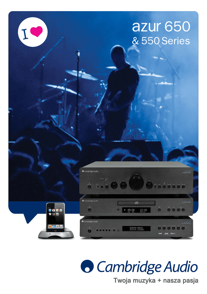 Twoja muzyka + nasza pasja Czas przejść na wyższy poziom czerpania przyjemności ze słuchania muzyki… Wprowadzając na rynek urządzenia hi-fi Azur, firma Cambridge Audio wywołała niemałe zamieszanie. Połączenie najwyższej jakości dźwięku, znakomitej jakości wykonania i bardzo atrakcyjnej ceny sprawiły, że grono najbardziej uznanych krytyków świata od razu przyjęło te urządzenia z zachwytem. Firma Cambridge Audio powraca w wielkim stylu! Zaprojektowane całkowicie na nowo, zarówno pod względem estetyki, jaki i elementów wewnętrznych, nowe serie Azur 550 i 650 hołdują zasadom, którym jesteśmy zawsze wierni — porażająca jakość dźwięku, atrakcyjna cena oraz ponadczasowy wygląd. Bez względu na ulubiony gatunek muzyki, warantujemy, że włożyliśmy całe serce w to, aby przyjemność ze słuchania muzyki była jak największa. Dzięki możliwości wyboru spośród dwóch wzmacniaczy zintegrowanych oraz połączeniu przepełnionych innowacjami odtwarzaczy CD — wyposażonych w nowe rewolucyjne serwomechanizmy S3 firmy Cambridge Audio — i zupełnie nowym tunerom pozostaje tylko podjęcie decyzji odnośnie modelu, który najlepiej będzie spełniał wymagania! Trudno uwierzyć, że mieszcząc w sobie tak dużo, nowa rodzina urządzeń Azur wygląda tak elegancko. Poza wspaniałym brzmieniem i korzyściami wynikającymi z niewielkich rozmiarów, nowe urządzenia rodziny Azur mają całkowicie innowacyjny wygląd dzięki konturom, ostrym jak brzytwa wyświetlaczom oraz aksamitnie gładkim przyciskom i pokrętłom. Matowy, aluminiowy panel przedni, jednolita obudowa, znacznie stabilniejsza niż wcześniej i dwuwarstwowe wytłumiające nóżki, wszystko to spełnia standardy projektowania solidnych urządzeń firmy Cambridge Audio, co także znacznie podnosi wydajność poprzez eliminację rezonansu. Dla osób ceniących sobie walory estetyczne oraz mających najwyższe wymagania odnośnie odtwarzania muzyki udostępniamy urządzenia rodziny Azur w kolorze srebrnym i czarnym. Dzięki znakomitej ergonomii i wielu wejściom umożliwiającym wykorzystanie w jeszcze lepszym stopniu najnowszych urządzeń rozrywki domowej, nowa rodzina urządzeń hi-fi Azur jest bez wątpienia systemem hi-fi, który sprawi, że pokochasz swoją ulubioną muzykę bardziej niż kiedykolwiek. Wzmacniacze 550 i 650 Wzmacniacze zintegrowane 550A i 650A; moc i kontrola w pełnej harmonii Bardzo cenione konstrukcje wzmacniaczy firmy Cambridge Audio osiągają kolejny poziom wydajności i wyrafinowania dzięki wprowadzeniu modeli 550A oraz 650A. Na nowo zaprojektowane końcówki mocy jeszcze bardziej poprawiają pasmo tonów niskich i dynamikę, zwiększając jednocześnie do maksimum kontrolę dźwięku emitowanego z głośników. Głównym celem zespołu projektantów firmy Cambridge Audio było oczywiście to, aby modele 550A oraz 650A stały się wyznacznikiem swojej kategorii. Szczególną uwagę zwrócono na opatentowany przez firmę system ochrony CAP5. Zachowując parametry oryginalnego projektu — ciągłe monitorowanie przeciążeń, błędów i przesterowań przy jednoczesnym gwarantowaniu dźwięku bez zniekształceń — nowe wcielenie zapewnia jeszcze lepszą dynamikę i wierniejsze oddanie dźwięku. Podobnie jak uznani poprzednicy, oba wzmacniacze są wyposażone w duże transformatory toroidalne w celu zapewnienia doskonałej efektywności i niebywale niskiego poziomu szumów. Jednak moc jest niczym bez kontroli, w przypadku tych wzmacniaczy wysoka wydajność nie obejmuje jedynie najwyższych poziomów głośności. Zupełnie nowe potencjometry firmy ALPS wysokiej jakości do regulacji głośności zapewniają doskonały balans między kanałami przy niskich ustawieniach poziomu głośności. Całości dopełniają nowe regulatory brzmienia dające duże możliwości regulacji. Inne ważne ulepszenia to nowe audiofilskie polipropylenowe kondensatory sygnału, pozłacane wyjścia głośnikowe, robione na zamówienie kondensatory elektrolityczne umieszczone w najważniejszych miejscach oraz kilka innych starannie dobranych usprawnień obwodów elektrycznych. Niesamowite możliwości podłączania! Obydwa wzmacniacze zapewniają wiele możliwości połączeniowych dzięki ogromnej liczbie wejść i wyjść, co pozwala podłączać je do najczęściej używanych urządzeń rozrywki domowej. Przednie gniazdo do podłączania odtwarzaczy iPod/MP3 zapewnia wygodę użytkowania. Dodatkowo za pomocą znajdującego się w zestawie pilota można obsługiwać wzmacniacz lub odtwarzacz CD 550C albo 650C, a także którykolwiek z odtwarzaczy iPod, gdy jest on podłączony do odpowiedniej stacji dokującej, np. iD50 firmy Cambridge Audio. Oczywiście można używać modeli 550A i 650A, aby uzyskać lepszą jakość dźwięku z telewizora, odtwarzacza DVD lub odtwarzacza sieciowego, takiego jak Apple TV, Sonos czy Squeezebox. Jeśli masz jeszcze większe wymagania… Model 650A o jeszcze wyższych parametrach wyprzedza najnowsze rozwiązania konkurencji dzięki oddzielnym odczepom transformatora dla lewego i prawego kanału, podwójnym prostownikom oraz oddzielnym zasilaczom wzmacniaczy mocy prawego i lewego kanału działających w trybie dual-mono. Zawiera też większy transformator i układ chłodzenia, niezbędny do odprowadzania ciepła z urządzenia oferującego tak pokaźną moc! Wynikiem tych usprawnień jest czyste 75 watów (przy impedancji 8 omów) niczym nieograniczonej mocy. Wzmacniacze 550 i 650 Wzmacniacze 550A 650A Maksymalna moc na kanał (przy 8 Ω) 60W 75W 6 wejść, 2 wyjścia i wejście magnetofonowe Podwójne prostowniki i oddzielne zasilacze Powiększone transformatory toroidalne i specjalnie skonstruowany układ chłodzenia Poprawione końcówki mocy z nowymi wysokonapięciowymi tranzystorami wyjściowymi firmy Sanken Nowe potencjometry poziomu głośności firmy ALPS typu black box zapewniające doskonały balans – 550A Pre-out do podłączania wzmacniac