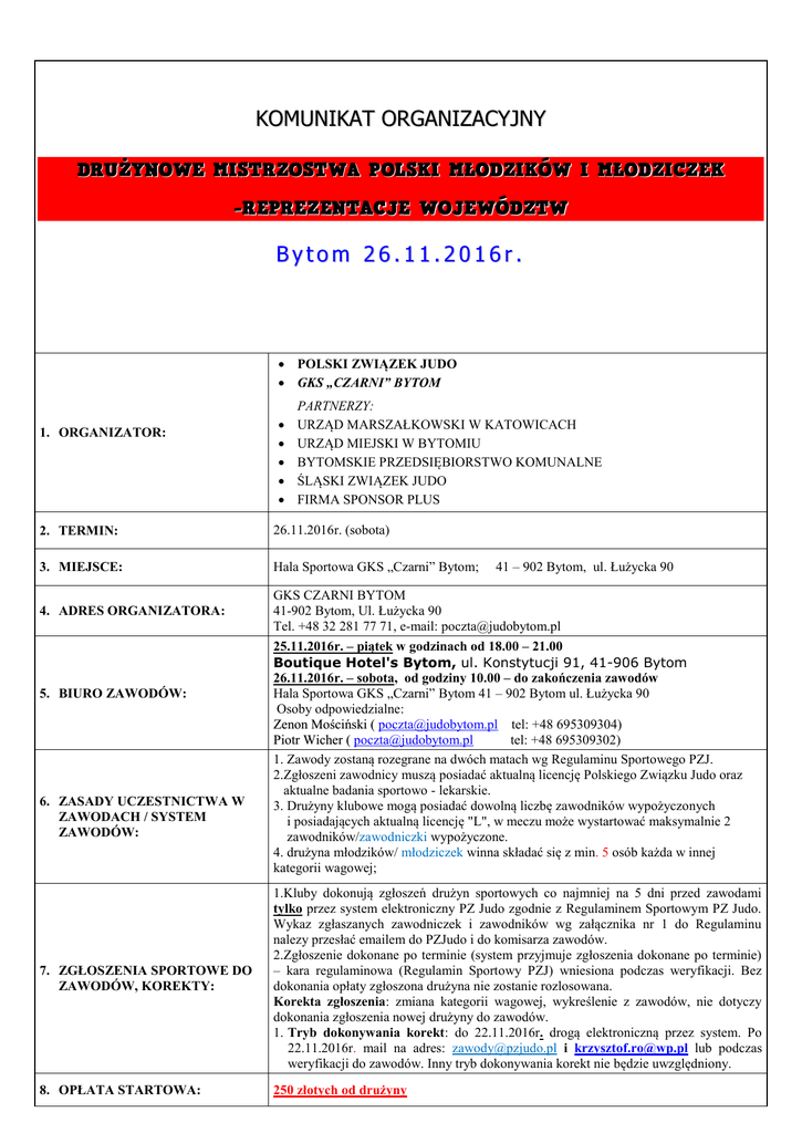 KOMUNIKAT ORGANIZACYJNY Bytom 26.11.2016r. POLSKI ZWIĄZEK JUDO GKS „CZARNI” BYTOM 1. ORGANIZATOR: PARTNERZY: URZĄD MARSZAŁKOWSKI W KATOWICACH URZĄD MIEJSKI W BYTOMIU BYTOMSKIE PRZEDSIĘBIORSTWO KOMUNALNE ŚLĄSKI ZWIĄZEK JUDO FIRMA SPONSOR PLUS 2. TERMIN: 26.11.2016r. (sobota) 3. MIEJSCE: Hala Sportowa GKS „Czarni” Bytom; 4. ADRES ORGANIZATORA: GKS CZARNI BYTOM 41-902 Bytom, Ul. Łużycka 90 Tel. +48 32 281 77 71, e-mail: [email protected] 5. BIURO ZAWODÓW: 6. ZASADY UCZESTNICTWA W ZAWODACH / SYSTEM ZAWODÓW: 41 – 902 Bytom, ul. Łużycka 90 25.11.2016r. – piątek w godzinach od 18.00 – 21.00 Boutique Hotel's Bytom, ul. Konstytucji 91, 41-906 Bytom 26.11.2016r. – sobota, od godziny 10.00 – do zakończenia zawodów Hala Sportowa GKS „Czarni” Bytom 41 – 902 Bytom ul. Łużycka 90 Osoby odpowiedzialne: Zenon Mościński ( [email protected] tel: +48 695309304) Piotr Wicher ( [email protected] tel: +48 695309302) 1. Zawody zostaną rozegrane na dwóch matach wg Regulaminu Sportowego PZJ. 2.Zgłoszeni zawodnicy muszą posiadać aktualną licencję Polskiego Związku Judo oraz aktualne badania sportowo - lekarskie. 3. Drużyny klubowe mogą posiadać dowolną liczbę zawodników wypożyczonych i posiadających aktualną licencję "L", w meczu może wystartować maksymalnie 2 zawodników/zawodniczki wypożyczone. 4. drużyna młodzików/ młodziczek winna składać się z min. 5 osób każda w innej kategorii wagowej; 7. ZGŁOSZENIA SPORTOWE DO ZAWODÓW, KOREKTY: 1.Kluby dokonują zgłoszeń drużyn sportowych co najmniej na 5 dni przed zawodami tylko przez system elektroniczny PZ Judo zgodnie z Regulaminem Sportowym PZ Judo. Wykaz zgłaszanych zawodniczek i zawodników wg załącznika nr 1 do Regulaminu nalezy przesłać emailem do PZJudo i do komisarza zawodów. 2.Zgłoszenie dokonane po terminie (system przyjmuje zgłoszenia dokonane po terminie) – kara regulaminowa (Regulamin Sportowy PZJ) wniesiona podczas weryfikacji. Bez dokonania opłaty zgłoszona drużyna nie zostanie rozlosowana. Korekta zgłoszenia: zmiana kategorii wagowej, wykreślenie z zawodów, nie dotyczy dokonania zgłoszenia nowej drużyny do zawodów. 1. Tryb dokonywania korekt: do 22.11.2016r. drogą elektroniczną przez system. Po 22.11.2016r. mail na adres: [email protected] i [email protected] lub podczas weryfikacji do zawodów. Inny tryb dokonywania korekt nie będzie uwzględniony. 8. OPŁATA STARTOWA: 250 złotych od drużyny 9. WIEK STARTUJĄCYCH, STOPIEŃ SZKOLENIOWY: 10. KATEGORIE WAGOWE: Prawo startu mają chłopcy i dziewczęta urodzeni w latach 2002, 2003 Minimum 5 KYU Młodzicy: 42kg; 46kg; 50kg; 55kg; 60kg; 66kg; 73kg; +73kg Młodziczki: 40kg; 44kg; 48kg; 52kg; 57kg; 63kg; +63kg Boutique Hotel's Bytom ul. Konstytucji 91, 41-906 Bytom www.hotels24.com.pl Sieć Boutique Hotel’s to nowoczesne obiekty o wysokim standardzie wyposażenia wnętrz, usytuowane w strategicznych punktach miast. Marka Boutique Hotel’s powstała z 11. ZAKWATEROWANIE DLA UCZESTNIKÓW DELEGATÓW myślą o Gościach ceniących sobie nowoczesność, komfort i wygodę. Cena pokoju jednoosobowego 89,00 zł PZJUDO, KOMISARZA Cena pokoju dwuosobowego 119,00 zł ZAWODÓW, SĘDZIÓW: Cena pokoju Trzyosobowego 159,00 zł Śniadania w formie urozmaiconego bufetu – 25,00 zł / 1 osobę ( 2 dania na ciepło, zimny bufet : wędliny, jajka, sery, warzywa, owoce, jogurty, płatki, deser ) Śniadanie na wynos w formie Lunch Box – 15,00 zł / 1 osobę ( 2 bułki, woda mineralna 0,5 l, baton, jabłko) 12. PROGRAM ZAWODÓW: 25.11.2016r. (piątek): 1800 – 2100 - przyjazd i zakwaterowanie uczestników - Informacja w Biurze Zawodów. 1845 - 1920 - Weryfikacja do zawodów. 1930 – 2030 - waga oficjalna i przegląd lekarski – drużyny kobiet i mężczyzn; 2035 – 2050 – weryfikacja ostateczna 2100 - Konferencja techniczna i losowanie zawodów kobiet i mężczyzn. 26.11.2016r. (sobota): 1000 - otwarcie zawodów 1010 - walki eliminacyjne i repasażowe oraz o medale brązowe i złote > wg ustaleń podanych podczas konferencji technicznej. 10 min po zakończeniu walk o złote medale - dekoracja 13. KOMISARZ ZAWODÓW Krzysztof Rogulski; tel. 534-651-939, email: [email protected] 14. WERYFIKACJA DO LOSOWANIA: Weryfikację do losowania przeprowadza Komisarz Zawodów w Sali konferencyjnej Hotelu Boutique Hotel's Bytom ul. Konstytucji 91, 41-906 Bytom w terminie: 25.11.2016r. (piątek): 1845 – 1920 – drużyny kobiet i mężczyzn 15. KONFERENCJA TECHNICZNA I LOSOWANIE: Sala konferencyjna Hotel Boutique Hotel's Bytom ul. Konstytucji 91, 41-906 Bytom 25.11.2016r. (piątek) – 2100 - Zawody kobiet i mężczyzn. 16. JUDOGI: 17. WAŻENIE: 18. CZAS WALKI: 19. SPRAWY SĘDZIOWSKIE: 20. INNE INFORMACJE: Obowiązują judogi białe. Wskazane posiadania również judogi niebieskich – w przypadku ich braku obowiązują czerwone przepaski. Obowiązuje jednolitość wybranej opcji dla całej drużyny. Kontrola judogi odbywa się zgodnie z obowiązującymi przepisami walki. Do dekoracji obowiązuje judogi koloru białego. Boutique Hotel's Bytom ul. Konstytucji 91, 41-906 Bytom Waga kontrolna – zawody kobiet i mężczyzn: 25.11.2016r. (piątek) w godzinach 1400 - 1900 Waga oficjalna i przegląd lekarski – zawody kobiet i mężczyzn: 25.11.2016r.(piątek) w godzinach 1930 – 2030 na wagę oficjalną drużyny stawiają się w komplecie Uwaga!: Nie zezwala się na ważenie zawodniczek i zawodników bez odzieży. Podczas ważenia zawodniczka musi mieć na sobie bieliznę osobistą; zawodnik bieliznę osobistą (spodenki). Limity wagowe są powiększone o dodatkowe 100g. Podczas ważenia należy posiadać dokument tożsamości oraz ważne badania lekarskie. Czas walki – 3 minuty Stosowanie technik shime waza jest dozwolone. Zawodniczka / zawodnik, który nie podda się podczas stosowania shime waza i straci przytomność z powodu zastosowania shime waza nie będzie dalej uczestniczyć w zawodach. 1. Zawodniczki / zawodnicy muszą posi