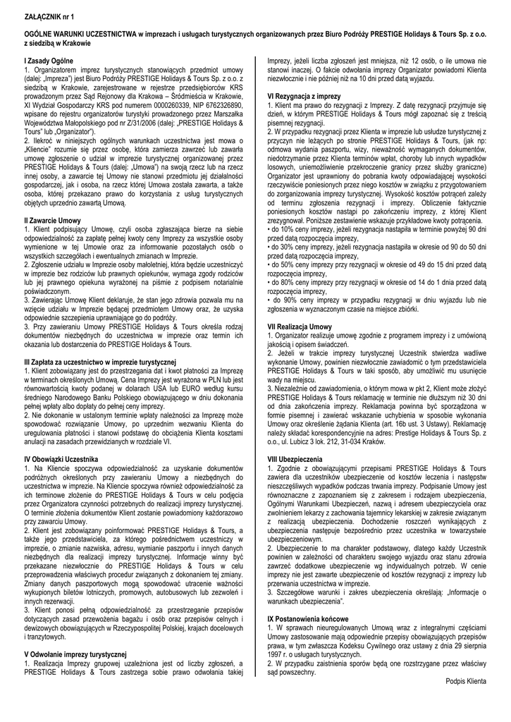 ZAŁĄCZNIK nr 1 OGÓLNE WARUNKI UCZESTNICTWA w imprezach i usługach turystycznych organizowanych przez Biuro Podróży PRESTIGE Holidays & Tours Sp. z o.o. z siedzibą w Krakowie I Zasady Ogólne 1. Organizatorem imprez turystycznych stanowiących przedmiot umowy (dalej: „Impreza”) jest Biuro Podróży PRESTIGE Holidays & Tours Sp. z o.o. z siedzibą w Krakowie, zarejestrowane w rejestrze przedsiębiorców KRS prowadzonym przez Sąd Rejonowy dla Krakowa – Śródmieścia w Krakowie, XI Wydział Gospodarczy KRS pod numerem 0000260339, NIP 6762326890, wpisane do rejestru organizatorów turystyki prowadzonego przez Marszałka Województwa Małopolskiego pod nr Z/31/2006 (dalej: „PRESTIGE Holidays & Tours” lub „Organizator”). 2. Ilekroć w niniejszych ogólnych warunkach uczestnictwa jest mowa o „Kliencie” rozumie się przez osobę, która zamierza zawrzeć lub zawarła umowę zgłoszenie o udział w imprezie turystycznej organizowanej przez PRESTIGE Holidays & Tours (dalej: „Umowa”) na swoją rzecz lub na rzecz innej osoby, a zawarcie tej Umowy nie stanowi przedmiotu jej działalności gospodarczej, jak i osoba, na rzecz której Umowa została zawarta, a także osoba, której przekazano prawo do korzystania z usług turystycznych objętych uprzednio zawartą Umową. II Zawarcie Umowy 1. Klient podpisujący Umowę, czyli osoba zgłaszająca bierze na siebie odpowiedzialność za zapłatę pełnej kwoty ceny Imprezy za wszystkie osoby wymienione w tej Umowie oraz za informowanie pozostałych osób o wszystkich szczegółach i ewentualnych zmianach w Imprezie. 2. Zgłoszenie udziału w Imprezie osoby małoletniej, która będzie uczestniczyć w imprezie bez rodziców lub prawnych opiekunów, wymaga zgody rodziców lub jej prawnego opiekuna wyrażonej na piśmie z podpisem notarialnie poświadczonym. 3. Zawierając Umowę Klient deklaruje, że stan jego zdrowia pozwala mu na wzięcie udziału w Imprezie będącej przedmiotem Umowy oraz, że uzyska odpowiednie szczepienia uprawniające go do podróży. 3. Przy zawieraniu Umowy PRESTIGE Holidays & Tours określa rodzaj dokumentów niezbędnych do uczestnictwa w imprezie oraz termin ich okazania lub dostarczenia do PRESTIGE Holidays & Tours. III Zapłata za uczestnictwo w imprezie turystycznej 1. Klient zobowiązany jest do przestrzegania dat i kwot płatności za Imprezę w terminach określonych Umową. Cena Imprezy jest wyrażona w PLN lub jest równowartością kwoty podanej w dolarach USA lub EURO według kursu średniego Narodowego Banku Polskiego obowiązującego w dniu dokonania pełnej wpłaty albo dopłaty do pełnej ceny imprezy. 2. Nie dokonanie w ustalonym terminie wpłaty należności za Imprezę może spowodować rozwiązanie Umowy, po uprzednim wezwaniu Klienta do uregulowania płatności i stanowi podstawę do obciążenia Klienta kosztami anulacji na zasadach przewidzianych w rozdziale VI. IV Obowiązki Uczestnika 1. Na Kliencie spoczywa odpowiedzialność za uzyskanie dokumentów podróżnych określonych przy zawieraniu Umowy a niezbędnych do uczestnictwa w imprezie. Na Kliencie spoczywa również odpowiedzialność za ich terminowe złożenie do PRESTIGE Holidays & Tours w celu podjęcia przez Organizatora czynności potrzebnych do realizacji imprezy turystycznej. O terminie złożenia dokumentów Klient zostanie powiadomiony każdorazowo przy zawarciu Umowy. 2. Klient jest zobowiązany poinformować PRESTIGE Holidays & Tours, a także jego przedstawiciela, za którego pośrednictwem uczestniczy w imprezie, o zmianie nazwiska, adresu, wymianie paszportu i innych danych niezbędnych dla realizacji imprezy turystycznej. Informacje winny być przekazane niezwłocznie do PRESTIGE Holidays & Tours w celu przeprowadzenia właściwych procedur związanych z dokonaniem tej zmiany. Zmiany danych paszportowych mogą spowodować utracenie ważności wykupionych biletów lotniczych, promowych, autobusowych lub zezwoleń i innych rezerwacji. 3. Klient ponosi pełną odpowiedzialność za przestrzeganie przepisów dotyczących zasad przewożenia bagażu i osób oraz przepisów celnych i dewizowych obowiązujących w Rzeczypospolitej Polskiej, krajach docelowych i tranzytowych. V Odwołanie imprezy turystycznej 1. Realizacja Imprezy grupowej uzależniona jest od liczby zgłoszeń, a PRESTIGE Holidays & Tours zastrzega sobie prawo odwołania takiej Imprezy, jeżeli liczba zgłoszeń jest mniejsza, niż 12 osób, o ile umowa nie stanowi inaczej. O fakcie odwołania imprezy Organizator powiadomi Klienta niezwłocznie i nie później niż na 10 dni przed datą wyjazdu. VI Rezygnacja z imprezy 1. Klient ma prawo do rezygnacji z Imprezy. Z datę rezygnacji przyjmuje się dzień, w którym PRESTIGE Holidays & Tours mógł zapoznać się z treścią pisemnej rezygnacji. 2. W przypadku rezygnacji przez Klienta w imprezie lub usłudze turystycznej z przyczyn nie leżących po stronie PRESTIGE Holidays & Tours, (jak np: odmowa wydania paszportu, wizy, nieważność wymaganych dokumentów, niedotrzymanie przez Klienta terminów wpłat, choroby lub innych wypadków losowych, uniemożliwienie przekroczenie granicy przez służby graniczne) Organizator jest uprawniony do pobrania kwoty odpowiadającej wysokości rzeczywiście poniesionych przez niego kosztów w związku z przygotowaniem do zorganizowania imprezy turystycznej. Wysokość kosztów potrąceń zależy od terminu zgłoszenia rezygnacji i imprezy. Obliczenie faktycznie poniesionych kosztów nastąpi po zakończeniu imprezy, z której Klient zrezygnował. Poniższe zestawienie wskazuje przykładowe kwoty potrącenia. • do 10% ceny imprezy, jeżeli rezygnacja nastąpiła w terminie powyżej 90 dni przed datą rozpoczęcia imprezy, • do 30% ceny imprezy, jeżeli rezygnacja nastąpiła w okresie od 90 do 50 dni przed datą rozpoczęcia imprezy, • do 50% ceny imprezy przy rezygnacji w okresie od 49 do 15 dni przed datą rozpoczęcia imprezy, • do 80% ceny imprezy przy 