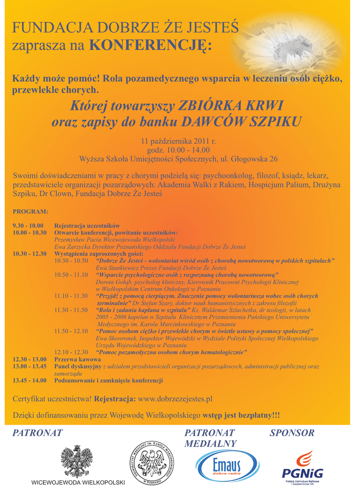 FUNDACJA DOBRZE ŻE JESTEŚ zaprasza na KONFERENCJĘ: Każdy może pomóc! Rola pozamedycznego wsparcia w leczeniu osób ciężko, przewlekle chorych. Której towarzyszy ZBIÓRKA KRWI oraz zapisy do banku DAWCÓW SZPIKU 11 października 2011 r. godz. 10.00 - 14.00 Wyższa Szkoła Umiejętności Społecznych, ul. Głogowska 26 Swoimi doświadczeniami w pracy z chorymi podzielą się: psychoonkolog, filozof, ksiądz, lekarz, przedstawiciele organizacji pozarządowych: Akademia Walki z Rakiem, Hospicjum Palium, Drużyna Szpiku, Dr Clown, Fundacja Dobrze Że Jesteś PROGRAM: 9.30 - 10.00 10.00 - 10.30 10.30 - 12.30 12.30 - 13.00 13.00 - 13.45 13.45 - 14.00 Rejestracja uczestników Otwarcie konferencji, powitanie uczestników: Przemysław Pacia Wicewojewoda Wielkopolski Ewa Zarzycka Dyrektor Poznańskiego Oddziału Fundacji Dobrze Że Jesteś Wystąpienia zaproszonych gości: 10.30 - 10.50 “Dobrze Że Jesteś - wolontariat wśród osób z chorobą nowotworową w polskich szpitalach” Ewa Stankiewicz Prezes Fundacji Dobrze Że Jesteś 10.50 - 11.10 “Wsparcie psychologiczne osób z rozpoznaną chorobą nowotworową” Dorota Gołąb, psycholog kliniczny, Kierownik Pracowni Psychologii Klinicznej w Wielkopolskim Centrum Onkologii w Poznaniu 11.10 - 11.30 “Przyjdź z pomocą cierpiącym. Znaczenie pomocy wolontariusza wobec osób chorych terminalnie” Dr Stefan Szary, doktor nauk humanistycznych z zakresu filozofii 11.30 - 11.50 “Rola i zadania kapłana w szpitalu” Ks. Waldemar Szlachetka, dr teologii, w latach 2005 - 2006 kapelan w Szpitalu Klinicznym Przemienienia Pańskiego Uniwersytetu Medycznego im. Karola Marcinkowskiego w Poznaniu 11.50 - 12.10 “Pomoc osobom ciężko i przewlekle chorym w świetle ustawy o pomocy społecznej” Ewa Skowronek, Inspektor Wojewódzki w Wydziale Polityki Społecznej Wielkopolskiego Urzędu Wojewódzkiego w Poznaniu 12.10 - 12.30 “Pomoc pozamedyczna osobom chorym hematologicznie” Przerwa kawowa Panel dyskusyjny z udziałem przedstawicieli organizacji pozarządowych, administracji publicznej oraz samorządu Podsumowanie i zamknięcie konferencji Certyfikat uczestnictwa! Rejestracja: www.dobrzezejestes.pl Dzięki dofinansowaniu przez Wojewodę Wielkopolskiego wstęp jest bezpłatny!!! PATRONAT WICEWOJEWODA WIELKOPOLSKI PATRONAT MEDIALNY SPONSOR