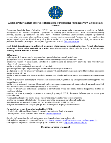 Zostań praktykantem albo wolontariuszem Europejskiej Fundacji Praw Człowieka w Wilnie! Europejska Fundacja Praw Człowieka (EFHR) jest aktywną organizacją pozarządową z siedzibą w Wilnie, funkcjonującą na zasadzie non-profit. Zajmujemy się ochroną praw człowieka na Litwie, udzielaniem pomocy prawnej, edukacją społeczeństwa na temat praw i wolności człowieka, prowadzeniem kampanii społecznych, promowaniem aktywności obywatelskiej, tolerancji i poszanowania różnorodności. Fundacja aktywnie współpracuje z innymi organizacjami na Litwie i za granicą, bierze udział w przygotowaniu raportów międzynarodowych oraz prowadzi działalność prawną na Litwie i poza jej granicami. Więcej: http://www.efhr.eu Jeżeli jesteś studentem prawa, politologii, stosunków międzynarodowych, dziennikarstwa, filologii albo innego kierunku i chcesz odbyć praktyki za granicą, masz niepowtarzalną okazję odbycia praktyk w Europejskiej Fundacji Praw Człowieka w Wilnie! Oferujemy: -zakres praktyk dostosowany do indywidualnych potrzeb i zainteresowań praktykanta; -pogłębienie wiedzy z zakresu prawa międzynarodowego oraz systemu prawnego na Litwie; -możliwość udziału w szkoleniach, warsztatach i konferencjach na temat praw człowieka oraz wypróbowanie własnych sił w tym zakresie; -udział w międzynarodowych warsztatach i szkoleniach; -praca w dynamicznym zespole młodych osób w multikulturalnym środowisku; -pogłębienie wiedzy na temat praw mniejszości narodowych oraz bezpośrednia praca z przedstawicielami mniejszości narodowych na Litwie; -udział w przygotowywaniu Raportów międzynarodowych, pisanie analiz, artykułów, notek prasowych, sprawozdań etc; -udział w projektach edukacyjnych w szkołach i na uczelniach, wykazanie się umiejętnościami edukacyjnymi oraz komunikacyjnymi; -udział oraz promowanie inicjatyw i kampanii społecznych przeciwko rasizmowi, dyskryminacji, nacjonalizmowi itd. oraz możliwość wykazania się kreatywnością w tej dziedzinie; -wkład w promowanie aktywności społecznej i obywatelskiej wśród młodzieży poprzez bezpośredni kontakt ze wspólnotą lokalną; -wyjazdy w teren (promocja bezpłatnych konsultacji prawnych EFHR, kampanie informacyjne na temat praw człowieka itd.); -w przypadku studentów z Polski istnieje możliwość pracy w środowisku polskojęzycznym; -możliwość poznania z bliska kultury litewskiej oraz kultur mniejszości narodowych na Litwie; -udoskonalenie kompetencji językowych (jęz. angielski, litewski, polski, rosyjski); -oficjalne zaświadczenie o odbyciu praktyk oraz referencje dla przyszłych pracodawców. Co powinieneś zrobić żeby odbyć praktyki w EFHR: - dowiedz się, jakie możliwości praktyk zagranicznych oferuje Twój uniwersytet; - prześlij swoje CV do EFHR na adres mailowy [email protected] Serwisy informacyjne dla osób zainteresowanych praktykami zagranicznymi: -Jak wyjechać na praktyki - program Erasmus http://www.erasmus.org.pl/strefa-studenta/wyjazdy-na-praktyke -Jak wyjechać na praktyki zagraniczne - program Leonardo da Vinci: http://www.leonardo.org.pl/ Czekamy na wasze zgłoszenia!