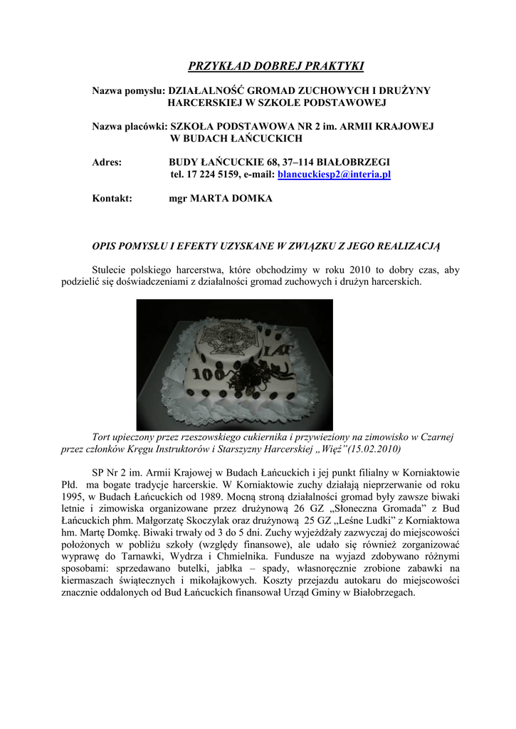 PRZYKŁAD DOBREJ PRAKTYKI Nazwa pomysłu: DZIAŁALNOŚĆ GROMAD ZUCHOWYCH I DRUŻYNY HARCERSKIEJ W SZKOLE PODSTAWOWEJ Nazwa placówki: SZKOŁA PODSTAWOWA NR 2 im. ARMII KRAJOWEJ W BUDACH ŁAŃCUCKICH Adres: BUDY ŁAŃCUCKIE 68, 37–114 BIAŁOBRZEGI tel. 17 224 5159, e-mail: [email protected] Kontakt: mgr MARTA DOMKA OPIS POMYSŁU I EFEKTY UZYSKANE W ZWIĄZKU Z JEGO REALIZACJĄ Stulecie polskiego harcerstwa, które obchodzimy w roku 2010 to dobry czas, aby podzielić się doświadczeniami z działalności gromad zuchowych i drużyn harcerskich. Tort upieczony przez rzeszowskiego cukiernika i przywieziony na zimowisko w Czarnej przez członków Kręgu Instruktorów i Starszyzny Harcerskiej „Więź”(15.02.2010) SP Nr 2 im. Armii Krajowej w Budach Łańcuckich i jej punkt filialny w Korniaktowie Płd. ma bogate tradycje harcerskie. W Korniaktowie zuchy działają nieprzerwanie od roku 1995, w Budach Łańcuckich od 1989. Mocną stroną działalności gromad były zawsze biwaki letnie i zimowiska organizowane przez drużynową 26 GZ „Słoneczna Gromada” z Bud Łańcuckich phm. Małgorzatę Skoczylak oraz drużynową 25 GZ „Leśne Ludki” z Korniaktowa hm. Martę Domkę. Biwaki trwały od 3 do 5 dni. Zuchy wyjeżdżały zazwyczaj do miejscowości położonych w pobliżu szkoły (względy finansowe), ale udało się również zorganizować wyprawę do Tarnawki, Wydrza i Chmielnika. Fundusze na wyjazd zdobywano różnymi sposobami: sprzedawano butelki, jabłka – spady, własnoręcznie zrobione zabawki na kiermaszach świątecznych i mikołajkowych. Koszty przejazdu autokaru do miejscowości znacznie oddalonych od Bud Łańcuckich finansował Urząd Gminy w Białobrzegach. Najmłodsze zuchy 26 GZ „Słoneczna Gromada” Podstawą działalności gromad są systematycznie prowadzone zbiórki. Od czasu do czasu nasze zuchy spotykają się z innymi zuchami na wspólnych ogniskach i imprezach organizowanych przez hufiec ZHP w Łańcucie, m.in. na : Przeglądzie Teatrzyków Zuchowych, Festiwalu Piosenki Harcerskiej i Zuchowej, Hufcowym Konkursie Recytatorskim, Jesiennym Złazie Zuchowym. Odbywa się to pod bacznym okiem drużynowych: pwd. Jadwigi Matuszek i Agnieszki Gurak. Kilka lat temu dzieci wyjechały na obóz harcerski w Majdanie Sopockim. 26 GZ na Festiwalu Piosenki Turystycznej i Szantowej ( MDK Łańcut, maj 2009) 25 GZ „Leśne Ludki” z Korniaktowa na Wiosennym Rajdzie Zuchowym w Białobrzegach (maj 2005) W Szkole Podstawowej Nr 2 im. Armii Krajowej w Budach Łańcuckich działa również drużyna harcerska. W latach 80-tych i 90-tych istniała świetnie funkcjonująca 41DH im. Tadeusza Kościuszki prowadzona przez phm. Antoniego Kluza. W 2005 roku z inicjatywy hm. Marty Domki założono nową -7DH im. Zawiszaków. Obecnie drużyna liczy ok. 30 harcerzy, co stanowi 50% uczniów klas IV-VI. Duży nacisk kładzie się na atrakcyjność zbiórek harcerskich i form zajęć poza nimi. Stałymi punktami pracy drużyny są m.in. kilkudniowe wyjazdy na Ogólnopolską Pielgrzymkę Harcerzy na Jasną Górę, msze patronackie i letnie biwaki dla harcerzy i zuchów, Msza w Kościele p.w. Matki Boskiej Różańcowej w Korniaktowie ( 23.04.2010) porządkowanie zapomnianych grobów na cmentarzu parafialnym przed dniem Wszystkich Świętych oraz udział w imprezach organizowanych przez hufiec ZHP w Łańcucie tj. w: Festiwalach Piosenki Harcerskiej, Zawodach Strzeleckich o Puchar Komendanta Hufca, Harcerskich Grach Specjalnościowych, Zimowych Manewrach Techniczno - Obronnych, INO. Harcerki na Festiwalu piosenki Turystycznej i Szantowej w Łańcucie (maj 2009) Stanowisko strzeleckie na torze techniczno-obronnym (II ZMTO w Czarnej-luty 2010) Po zakończonych zawodach na łańcuckiej strzelnicy(listopad 2009) Harcerze corocznie wyjeżdżają po Betlejemskie Światło Pokoju przekazywane przez słowackich skautów w Krakowie, Łysej Polanie k/ Zakopanego lub w Kieżmarku na Słowacji. W oczekiwaniu na Betlejemskie Światło Pokoju na Małym Rynku w Krakowie(grudzień 2009). Światło zostaje następnie przekazane instytucjom, kościołom i mieszkańcom Bud Łańcuckich i Korniaktowa. W ramach integracji z drużynami białobrzeskiego szczepu, nasi harcerze uczestniczą we wspólnych andrzejkach, polowych mszach świętych organizowanych na zakończenie roku szkolnego oraz wspólnych ogniskach. Wspólne ognisko po mszy polowej przy Kaplicy św. Huberta w Białobrzegach (czerwiec 2009). Podsumowaniem roku harcerskiego są obozy letnie w Majdanie Sopockim na Roztoczu i Szklanej Hucie nad Morzem Bałtyckim. Majdan Sopocki 2008 Szklana Huta 2009 20 listopada 2009 roku gościliśmy w Urzędzie Wojewódzkim z programem poświęconym 70 rocznicy powstania Szarych Szeregów. Naszymi widzami byli kombatanci i inwalidzi wojenni zgromadzeni w 90 rocznicę powstania Związku Inwalidów Wojennych R.P. Drużyna posiada stronę internetową (http://www.7dhbudylanc.szu.pl), na której można znaleźć więcej informacji na temat jej działalności. W dzisiejszej szkole, szczególnie wiejskiej, w której dzieci mają ograniczony dostęp do dóbr kulturalnych warto prowadzić pracę z gromadami zuchowymi i drużynami harcerskimi. Członkostwo w ZHP jest dla dzieci okazją do przeżycia niecodziennych przygód i podjęcia pasjonujących zajęć. Organizacja ta otwiera każdemu dziecku szansę na odnalezienie swego miejsca w wielu dziedzinach aktywności oraz pełnienia ról społecznych odpowiednich dla siebie. W czasie realizacji zadań dotyczących kolejnych sprawności, zuchy i harcerze zdobywają nowe doświadczenia i umiejętności poszerzające ich wiedzę i rozwijające zainteresowanie otaczającym światem. Dzięki biwakom, zimowiskom i obozom dzieci zawierają nowe znajomości, poznają gry i zabawy, pląsy i piosenki. Mają możliwość poznać siebie w innych niż szkolne warunkach, umocnić pozytywne relacje, sprawdzić własną samodzielność i zaradność życiową z dala od domów rodzinnych. Wszys