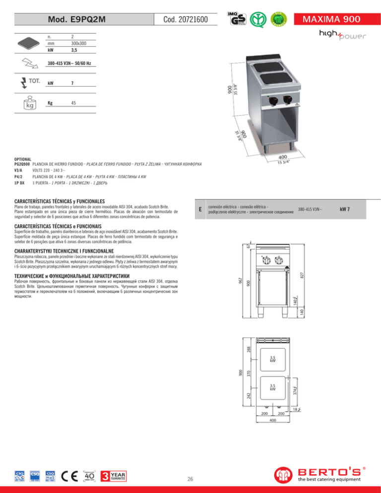 Mod. E9PQ2M n. mm kW Cod. 20721600 2 300x300 3,5 kW 7 Kg 45 900 TOT. 35 3/8” 380-415 V3N~ 50/60 Hz 35 3 900 8 ” / 400 OPTIONAL PG2Q900 PLANCHA DE HIERRO FUNDIDO - PLACA DE FERRO FUNDIDO - PŁYTA Z ŻELIWA - ЧУГУННАЯ КОНФОРКА V3/A VOLTS 220 - 240 3~ P4/2 PLANCHA DE 4 KW - PLACA DE 4 KW - PŁYTA 4 KW - ПЛАСТИНЫ 4 KW 1P DX 1 PUERTA - 1 PORTA - 1 DRZWICZKI - 1 ДВЕРЬ CARACTERÍSTICAS TÉCNICAS y FUNCIONALES Plano de trabajo, paneles frontales y laterales de acero inoxidable AISI 304, acabado Scotch Brite. Plano estampado en una única pieza de cierre hermético. Placas de aleación con termostato de seguridad y selector de 6 posiciones que activa 6 diferentes zonas concéntricas de potencia. E 15 3/4” conexión eléctrica - conexão elétrica 380-415 V3N~ podłączenie elektryczne - электрическое соединение CARACTERÍSTICAS TÉCNICAS e FUNCIONAIS 67 Superfície de trabalho, painéis dianteiros e laterais de aço inoxidável AISI 304, acabamento Scotch Brite. Superfície moldada de peça única estanque. Placas de ferro fundido com termostato de segurança e seletor de 6 posições que ativa 6 zonas diversas concêntricas de potência. CHARAKTERYSTYKI TECHNICZNE I FUNKCJONALNE 967 288 140 140 Рабочая поверхность, фронтальные и боковые панели из нержавеющей стали AISI 304, отделка Scotch Brite. Цельноштампованная герметичная поверхность. Чугунные конфорки с защитным термостатом и переключателем на 6 положений, включающим 6 различных концентрических зон мощности. 900 ТЕХНИЧЕСКИЕ и ФУНКЦИОНАЛЬНЫЕ ХАРАКТЕРИСТИКИ 827 Płaszczyzna robocza, panele przednie i boczne wykonane ze stali nierdzewnej AISI 304, wykończenie typu Scotch Brite. Płaszczyzna szczelna, wykonana z jednego odlewu. Płyty z żeliwa z termostatem awaryjnym i 6-ścio pozycyjnym przełącznikiem awaryjnym uruchamiającym 6 różnych koncentrycznych stref mocy. 900 370 3.5 kW 242 374 3.5 kW 200 200 400 26 18 kW 7
