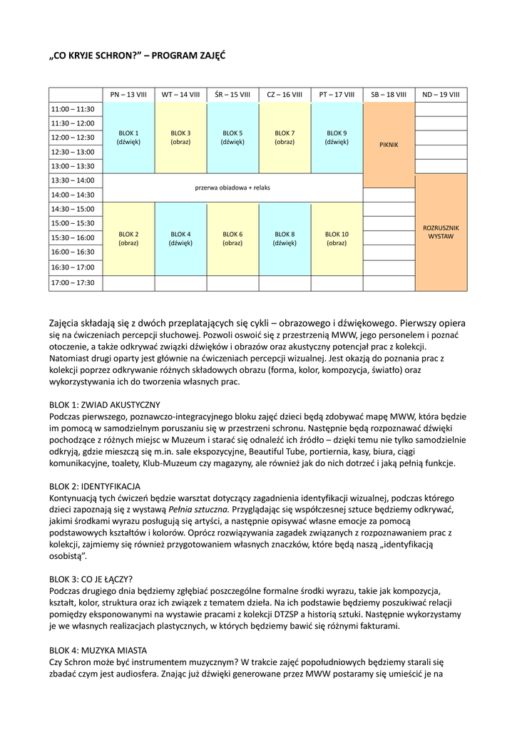 „CO KRYJE SCHRON?” – PROGRAM ZAJĘĆ PN – 13 VIII WT – 14 VIII ŚR – 15 VIII CZ – 16 VIII PT – 17 VIII SB – 18 VIII BLOK 1 (dźwięk) BLOK 3 (obraz) BLOK 5 (dźwięk) BLOK 7 (obraz) BLOK 9 (dźwięk) PIKNIK BLOK 8 (dźwięk) BLOK 10 (obraz) ND – 19 VIII 11:00 – 11:30 11:30 – 12:00 12:00 – 12:30 12:30 – 13:00 13:00 – 13:30 13:30 – 14:00 przerwa obiadowa + relaks 14:00 – 14:30 14:30 – 15:00 15:00 – 15:30 15:30 – 16:00 BLOK 2 (obraz) BLOK 4 (dźwięk) BLOK 6 (obraz) ROZRUSZNIK WYSTAW 16:00 – 16:30 16:30 – 17:00 17:00 – 17:30 Zajęcia składają się z dwóch przeplatających się cykli – obrazowego i dźwiękowego. Pierwszy opiera się na ćwiczeniach percepcji słuchowej. Pozwoli oswoić się z przestrzenią MWW, jego personelem i poznać otoczenie, a także odkrywać związki dźwięków i obrazów oraz akustyczny potencjał prac z kolekcji. Natomiast drugi oparty jest głównie na ćwiczeniach percepcji wizualnej. Jest okazją do poznania prac z kolekcji poprzez odkrywanie różnych składowych obrazu (forma, kolor, kompozycja, światło) oraz wykorzystywania ich do tworzenia własnych prac. BLOK 1: ZWIAD AKUSTYCZNY Podczas pierwszego, poznawczo-integracyjnego bloku zajęć dzieci będą zdobywać mapę MWW, która będzie im pomocą w samodzielnym poruszaniu się w przestrzeni schronu. Następnie będą rozpoznawać dźwięki pochodzące z różnych miejsc w Muzeum i starać się odnaleźć ich źródło – dzięki temu nie tylko samodzielnie odkryją, gdzie mieszczą się m.in. sale ekspozycyjne, Beautiful Tube, portiernia, kasy, biura, ciągi komunikacyjne, toalety, Klub-Muzeum czy magazyny, ale również jak do nich dotrzeć i jaką pełnią funkcje. BLOK 2: IDENTYFIKACJA Kontynuacją tych ćwiczeń będzie warsztat dotyczący zagadnienia identyfikacji wizualnej, podczas którego dzieci zapoznają się z wystawą Pełnia sztuczna. Przyglądając się współczesnej sztuce będziemy odkrywać, jakimi środkami wyrazu posługują się artyści, a następnie opisywać własne emocje za pomocą podstawowych kształtów i kolorów. Oprócz rozwiązywania zagadek związanych z rozpoznawaniem prac z kolekcji, zajmiemy się również przygotowaniem własnych znaczków, które będą naszą „identyfikacją osobistą”. BLOK 3: CO JE ŁĄCZY? Podczas drugiego dnia będziemy zgłębiać poszczególne formalne środki wyrazu, takie jak kompozycja, kształt, kolor, struktura oraz ich związek z tematem dzieła. Na ich podstawie będziemy poszukiwać relacji pomiędzy eksponowanymi na wystawie pracami z kolekcji DTZSP a historią sztuki. Następnie wykorzystamy je we własnych realizacjach plastycznych, w których będziemy bawić się różnymi fakturami. BLOK 4: MUZYKA MIASTA Czy Schron może być instrumentem muzycznym? W trakcie zajęć popołudniowych będziemy starali się zbadać czym jest audiosfera. Znając już dźwięki generowane przez MWW postaramy się umieścić je na wspólnie stworzonej, akustycznej mapie najbliższego otoczenia. Zajęcia te pozwolą dzieciom dowiedzieć się czym jest przestrzeń publiczna i co na nią się składa oraz jaki wpływ na jej odczuwanie może mieć zarówno sama architektura, jak i pełnione przez nią funkcje. BLOK 5: KONCERT ORGANICZNY W kolejnym dniu ponownie zwrócimy się „wgłąb” schronu i odkryjemy jego kolejną „warstwę”. Podczas ćwiczeń dźwiękowych dzieci zapoznają się z personelem MWW i dowiedzą się czym dokładnie zajmują się poszczególne osoby. W ten sposób instytucja zostanie im ukazana jako żywy organizm, którego sprawne funkcjonowanie polega na współpracy pomiędzy osobami specjalizującymi się w określonych dziedzinach. BLOK 6: OBRAZ I PODOBIEŃSTWO Zajęcia popołudniowe będą przeniesioną na obszar sztuki kontynuacją porannych poszukiwań. Poprzez uważną obserwację prac z kolekcji postaramy się odkryć, w jaki sposób w sztuce ujawnia się tworzący lub współtworzący ją człowiek. W ramach ćwiczeń dotyczących portretu i autoportretu zbadamy wspólnie komunikacyjną funkcję sztuki i zastanowimy się nad jej społecznym znaczeniem. Następnie spróbujemy ją „ożywić” poprzez wprawienie w ruch podczas warsztatu animacji. BLOK 7: PRZYCZYNA I SKUTEK Dzień czwarty rozpoczniemy od warsztatów rozwijających kreatywność i wyobraźnię dzieci. Swobodna gra skojarzeń będzie dla nas punktem wyjścia do budowania ruchomych, przestrzennych instalacji. Przechodząc od pomysłu do jego realizacji doświadczymy, iż proces twórczy to zderzenie niczym nieograniczonej fantazji z warunkami materialnymi – z dostępnością surowców i narzędzi czy nawet prawami fizyki. Taki „doświadczalny” charakter ćwiczeń pokaże dzieciom, iż każde dzieło – nawet abstrakcyjne – cechuje określona, wewnętrzna logika oraz że sztuka to poszukiwanie sposobów na pokonywanie ograniczeń rzeczywistości. BLOK 8: ODGŁOSY SZTUKI Po doświadczeniu procesu twórczego przyjrzymy się ponownie znajdującym się na wystawie pracom. Poprzez różnorodne zgadywanki dźwiękowe postaramy się dociec, jakie materiały i narzędzia zostały wykorzystane do ich realizacji, a następnie pofantazjujemy na temat odgłosów świata w nich przedstawionego. Ćwiczenia te pozwolą dzieciom uchwycić, iż sztuka balansuje na granicy dwóch rzeczywistości – fizycznej i wyobrażonej. BLOK 9: SYNESTEZJA Ostatni dzień zajęć rozpoczniemy od zabaw z wrażeniami wzrokowymi i słuchowymi – czy dźwięk może mieć barwę a kolor swoje brzmienie? Łącząc te dwa różne rodzaje percepcji pobawimy się w samodzielne komponowanie muzyczno-plastycznych utworów. Następnie przygotujemy wspólne, algorytmiczne instrumentarium i – kierując się pracami na wystawie niczym partyturą – spróbujemy „zagrać” sztukę współczesną, rozszerzając w ten sposób jej czysto wizualne postrzeganie. BLOK 10: ZABURZENIE Podczas bloku popołudniowego będziemy kontynuować eks