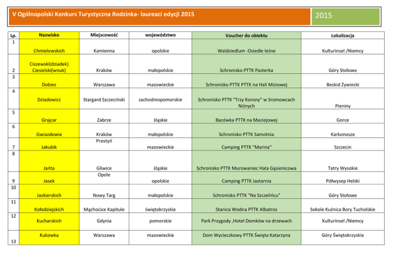 V Ogólnopolski Konkurs Turystyczna Rodzinka- laureaci edycji 2015 Lp. 1 2 3 2015 Nazwisko Miejscowość województwo Voucher do obiektu Lokalizacja Chmielewskich Kamienna opolskie Waldsiedlum -Osiedle leśne Kulturinsel /Niemcy Ciszewski(dziadek) Ciesielski(wnuk) Kraków małopolskie Schronisko PTTK Pasterka Góry Stołowe Dobies Warszawa mazowieckie Schronisko PTTK PTTK na Hali Miziowej Beskid Żywiecki Dziadowicz Stargard Szczeciński zachodniopomorskie Schronisko PTTK "Trzy Korony" w Sromowcach Niżnych Pieniny 4 5 Grajcar Zabrze śląskie Bacówka PTTK na Maciejowej Gorce Gwiazdowie Kraków Prostyń małopolskie Schronisko PTTK Samotnia Karkonosze mazowieckie Camping PTTK "Marina" Szczecin śląskie Schronisko PTTK Murowaniec Hala Gąsienicowa Tatry Wysokie opolskie Camping PTTK Jastarnia Półwysep Helski 6 7 8 Jakubik Jańta 9 10 Gliwice Opole Jasek Jaskierskich Nowy Targ małopolskie Schronisko PTTK "Na Szczelińcu" Góry Stołowe Kołodziejskich Mąchocice Kapitule świętokrzyskie Stanica Wodna PTTK Albatros Sokole Kuźnica Bory Tucholskie Kucharskich Gdynia pomorskie Park Przygody ,Hotel Domków na drzewach Kulturinsel /Niemcy Kukowka Warszawa mazowieckie Dom Wycieczkowy PTTK Święta Katarzyna Góry Świętokrzyskie 11 12 13 V Ogólnopolski Konkurs Turystyczna Rodzinka- laureaci edycji 2015 14 2015 Kwaśniewskich Kościan wielkopolskie Dom Turysty PTTK w Nowym Sączu Beskid Sądecki Magdziak - Neyem Londyn UK Camp 66 Kotlina Jeleniogórska 16 Magoch Biłgoraj lubelskie Schronisko PTTK na Jaworzynie Krynickiej Beskid Sądecki 17 18 Matusiewicz Rzeszów podkarpackie Camping PTTK Mielenko Pobrzeże Bałtyckie Mojżysz Czyżowice śląskie Zamek Golubski Golub - Dobrzyń 19 Ochał Szczecin zachodniopomorskie Hotel Kamieniec Oświęcim Kotlina Oświęcimska 20 21 Pęcherskich Kazimierz Biskupi wielkopolskie Schronisko PTTK na Hali Boraczej Beskid Żywiecki Piela Łabunie lubelskie Schronisko PTTK na Hali Ornak Tatry Zachodnie Piotrowscy Stalowa Wola podkarpackie Schronisko PTTK Szwajcarka Rudawy Janowickie Podoba Jelenia Góra dolnośląskie Schronisko PTTK w Dolinie Roztoki Tatry Wysokie Pucek Smolec dolnośląskie Schronisko PTTK na Turbaczu Gorce Pustelny -Szewczyk Kraków małopolskie Schronisko PTTK na Przełęczy Okraj Radajewskich Biadki wielkopolskie Schronisko PTTK na Markowych Szczawinach Beskid Żywiecki Rybickich Kramsk wielkopolskie Hotel PTTK na Kalatówkach Tatry Wysokie 15 22 23 24 25 26 27 Karkonosze/ Grzbiet Lasocki V Ogólnopolski Konkurs Turystyczna Rodzinka- laureaci edycji 2015 2015 28 Rytlewskich Bydgoszcz kujawsko - pomorskie Dom Turysty PTTK Rzymianka w Krynicy Beskid Sądecki 29 Siwy Tarnowskie Góry śląskie Hostel A&O Weimer Niemcy 30 31 Sosińscy Biłgoraj lubelskie Schronisko PTTK na Baraniej Górze Beski Śląski Spychalscy Kalisz wielkopolskie Schronisko PTTK na Polanie Chochołowskiej Tatry Zachodnie Sucheckich Dąbrowa Górnicza śląskie Schronisko PTTK na Hali Rysianka Beskid Żywiecki Szymańskich Gorzów Wielkopolski wielkopolskie Schronisko PTTK na Przegibku Beskid Żywiecki Ślęzak Opole opolskie Schronisko PTTK Murowaniec Hala Gąsienicowa Tatry Wysokie Świderskich Radzymin mazowieckie Schronisko PTTK w Dolinie Pięciu Stawów Polskich Tatry Wysokie Tadla Góra dolnośląskie Stanica Wodna PTTK Bachotek Pojezierze Brodnickie Tomaszewscy Makronos Górny małopolskie Schronisko PTTK nad Morskim Okiem Tatry Wysokie Tynkiewicz-Hinz Grudziądz kujawsko - pomorskie Bacówka PTTK nad Wierchomlą Beskid Sądecki Tyrała Kalety śląskie Schronisko PTTK na Klimczoku Beskid Śląski Warchoł Sanok podkarpackie Stanica Wodna PTTK Swornegacie 32 33 34 35 36 37 38 39 40 Bory Tucholskie Szlak Brdy V Ogólnopolski Konkurs Turystyczna Rodzinka- laureaci edycji 2015 2015 41 Warda Puławy(Gołąb) lubelskie Schronisko PTTK Strzecha Akademicka Karkonosze 42 43 Wileńskich Turów lubelskie Schronisko PTTK na Błatniej Beskid Żywiecki Witkowskich -Nery Warszawa mazowieckie Schronisko PTTK na Leskowcu Beskid Mały Wojczyk Bedoń Przykościelny łódzkie Stanica Wodna PTTK Wdzydze Kiszewskie 44 Warszawa, 2016.03.09 Bory Tucholskie Szlak Wdy