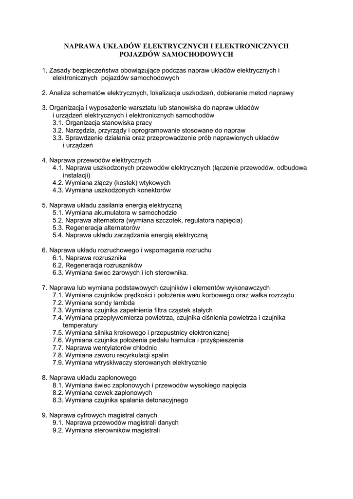 NAPRAWA UKŁADÓW ELEKTRYCZNYCH I ELEKTRONICZNYCH POJAZDÓW SAMOCHODOWYCH 1. Zasady bezpieczeństwa obowiązujące podczas napraw układów elektrycznych i elektronicznych pojazdów samochodowych 2. Analiza schematów elektrycznych, lokalizacja uszkodzeń, dobieranie metod naprawy 3. Organizacja i wyposażenie warsztatu lub stanowiska do napraw układów i urządzeń elektrycznych i elektronicznych samochodów 3.1. Organizacja stanowiska pracy 3.2. Narzędzia, przyrządy i oprogramowanie stosowane do napraw 3.3. Sprawdzenie działania oraz przeprowadzenie prób naprawionych układów i urządzeń 4. Naprawa przewodów elektrycznych 4.1. Naprawa uszkodzonych przewodów elektrycznych (łączenie przewodów, odbudowa instalacji) 4.2. Wymiana złączy (kostek) wtykowych 4.3. Wymiana uszkodzonych konektorów 5. Naprawa układu zasilania energią elektryczną 5.1. Wymiana akumulatora w samochodzie 5.2. Naprawa alternatora (wymiana szczotek, regulatora napięcia) 5.3. Regeneracja alternatorów 5.4. Naprawa układu zarządzania energią elektryczną 6. Naprawa układu rozruchowego i wspomagania rozruchu 6.1. Naprawa rozrusznika 6.2. Regeneracja rozruszników 6.3. Wymiana świec żarowych i ich sterownika. 7. Naprawa lub wymiana podstawowych czujników i elementów wykonawczych 7.1. Wymiana czujników prędkości i położenia wału korbowego oraz wałka rozrządu 7.2. Wymiana sondy lambda 7.3. Wymiana czujnika zapełnienia filtra cząstek stałych 7.4. Wymiana przepływomierza powietrza, czujnika ciśnienia powietrza i czujnika temperatury 7.5. Wymiana silnika krokowego i przepustnicy elektronicznej 7.6. Wymiana czujnika położenia pedału hamulca i przyśpieszenia 7.7. Naprawa wentylatorów chłodnic 7.8. Wymiana zaworu recyrkulacji spalin 7.9. Wymiana wtryskiwaczy sterowanych elektrycznie 8. Naprawa układu zapłonowego 8.1. Wymiana świec zapłonowych i przewodów wysokiego napięcia 8.2. Wymiana cewek zapłonowych 8.3. Wymiana czujnika spalania detonacyjnego 9. Naprawa cyfrowych magistral danych 9.1. Naprawa przewodów magistrali danych 9.2. Wymiana sterowników magistrali 10. Naprawa podzespołów lub zespołów stosowanych w systemach bezpieczeństwa i komfortu 10.1. Wymiana czujnika położenia koła kierownicy 10.2. Wymiana poduszki gazowej i pirotechnicznych napinaczy pasów 10.3. Wymiana czujnika ciśnienia w ogumieniu 10.4. Wymiana czujnika prędkości obrotowej koła 10.5. Naprawa lub wymiana elementów układów sterujących lub silników wycieraczek 10.6. Naprawa elementów układów wentylacji wnętrza i klimatyzacji 11. Naprawa i regulacja instalacji oświetlenia pojazdu 11.1. Lokalizacja uszkodzenia instalacji oświetlenia 11.2. Wymiana bezpiecznika, przekaźnika, włącznika 11.3. Wymiana żarówki lub modułu lampy 11.4. Naprawa instalacji oświetlenia ksenonowego i LED-owego 12. Naprawa immobilizera, instalacji alarmowej i układu centralnego zamka 13. Naprawa sterowników samochodowych 13.1. Wymiana sterownika 13.2. Regulacja parametrów pracy przez wymianę oprogramowania sterownika 14. Sporządzanie zapotrzebowania na układy elektryczne i elektroniczne pojazdów samochodowych oraz kalkulacji kosztów wykonanej usługi.