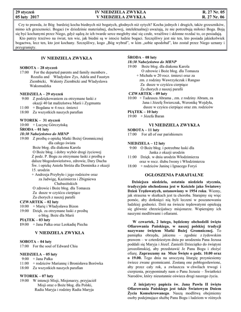 29 styczeń 05 luty 2017 IV NIEDZIELA ZWYKŁA V NIEDZIELA ZWYKŁA R. 27 Nr. 05 R. 27 Nr. 06 Czy to prawda, że Bóg bardziej kocha biednych niż bogatych, głodnych niż sytych? Kocha jednych i drugich, także grzeszników, mimo ich grzeszności. Bogaci (w dziedzinie materialnej, duchowej, intelektualnej) uważają, że nie potrzebują miłości Boga. Boją się być kochanymi przez Niego, gdyż sądzą że ich twarde serce mogłoby stać się czułe, wrażliwe i skłonne rozdać to, co posiadają. Kto patrzy trzeźwo na świat, ten wie, jak biedni są w istocie ludzie bogaci. Szczęśliwy jest nie ten, kto posiada jakiekolwiek bogactwa, lecz ten, kto jest kochany. Szczęśliwy, kogo „Bóg wybrał”, w kim „sobie upodobał”, kto został przez Niego uznany i przygranięty. IV NIEDZIELA ZWYKŁA SOBOTA – 28 styczeń 17:00 For the departed parents and family members , Rozalia and Wladyslaw Zys, Adela and Faustyn Ziembicki, Walenty Ziembicki and Wladyslawa Waksmudzka NIEDZIELA – 29 styczeń 9:00 Z podziękowaniem za otrzymane łaski z okazji 40 lat małżeństwa Marii i Zygmunta 11:00 + Bogdana w 4 rocz. śmierci 18:00 Za wszystkich naszych parafian WTOREK – 31 styczeń 10:00 + Lucynę Górczyńską ŚRODA – 01 luty 18:30 Nabożeństwo do MBNP 19:00 Z prośbą o opiekę Matki Bożej Gromnicznej dla całego świata Boże błog. dla diakona Karola O Boże błog. i dobry wybór drogi życiowej Z podz. P. Bogu za otrzymane łaski z prośbą o dalsze błogosławieństwo, zdrowie, Dary Ducha Św. i opiekę Anioła Stróża dla Dominika z okazji 15. urodzin + Andrzeja Przybyło i jego rodziców oraz za Jadwigę, Kazimierza i Zbigniewa Chabasińskich O zdrowie i Boże błog. dla Tomasza Za dusze w czyśćcu cierpiące Za chorych z naszej parafii CZWARTEK – 02 luty 10:00 + Marię i Władysława Bizon 19:00 Dzięk. za otrzymane łaski z prośbą o błog. Boże dla Marii PIĄTEK – 03 luty 19:00 + Jana Pałka oraz Leokadię Piecha V NIEDZIELA ZWYKŁA SOBOTA – 04 luty 17:00 For the soul of Edward Chiu NIEDZIELA – 05 luty 9:00 + Jana Pałka 11:00 + rodziców Mariannę i Bronisława Borówka 18:00 Za wszystkich naszych parafian WTOREK – 07 luty 19:00 W intencji Misji, Misjonarzy, przyjaciół Misji oraz o Boże błog. dla Polski, Radia Maryja i rodziny Radia Maryja ŚRODA – 08 luty 18:30 Nabożeństwo do MBNP 19:00 Boże błog. dla diakona Karola O zdrowie i Boże błog. dla Tomasza + Michała w 20 rocz. śmierci oraz za zm. z rodziny Wawrzyńczuk i Ranguo Za dusze w czyśćcu cierpiące Za chorych z naszej parafii CZWARTEK – 09 luty 10:00 + Tadeusza Abrama , zm. z rodziny Abram, za Jana i Józefę Świerczak, Weronikę Wojdyła, dusze w czyścu cierpiące oraz zm. rodziców PIĄTEK – 10 luty 19:00 + Józefa Baran VI NIEDZIELA ZWYKŁA SOBOTA – 11 luty 17:00 For all of our parishioners NIEDZIELA – 12 luty 9:00 O Boże błog. i potrzebne łaski dla Janka z okazji urodzin 11:00 Dzięk. w dniu urodzin Włodzimierza oraz w rocz. ślubu Iwony i Włodzimierza 18:00 + rodziców Janinę i Ignacego Foryś OGŁOSZENIA PARAFIALNE Dzisiejsza niedziela, ostatnia niedziela stycznia, tradycyjnie obchodzona jest w Kościele jako Światowy Dzień Trędowatych, ustanowiony w 1954 roku. Wiemy, jak straszna w skutkach jest ta choroba. Starajmy się więc pomóc, aby dotknięci nią byli leczeni w poszanowaniu ludzkiej godności. Dziś na świecie trędowatymi opiekują się głównie chrześcijańscy misjonarze. Wspierajmy ich naszymi modlitwami i ofiarami. W czwartek, 2 lutego, będziemy obchodzili święto Ofiarowania Pańskiego, w naszej polskiej tradycji nazywane świętem Matki Bożej Gromnicznej. To pamiątka obrzędu, jakiemu – zgodnie z żydowskim prawem – w czterdziestym dniu po urodzeniu Pana Jezusa poddali się Maryja i Józef. Zanieśli Dzieciątko do świątyni jerozolimskiej, aby przedstawić Je Panu Bogu i złożyć ofiarę. Zapraszamy na Msze Święte o godz. 10.00 oraz o 19.00. Tego dnia na uroczystą liturgię przyniesiemy świece zwane gromnicami. Zostaną one pobłogosławione, aby przez cały rok, a zwłaszcza w chwilach trwogi i cierpienia, przypominały nam o Panu Jezusie – Światłości Narodów, który nieustannie oświeca drogi naszego życia. Z inicjatywy papieża św. Jana Pawła II święto Ofiarowania Pańskiego jest także Światowym Dniem Życia Konsekrowanego. Naszą modlitwą obejmiemy osoby podejmujące służbę Panu Bogu i ludziom w różnych zakonach i zgromadzeniach. Tego dnia będziemy prosić o liczne i święte powołania do życia zakonnego w naszych rodzinach i wspólnocie parafialnej. W tym tygodniu przypada, pierwszy piątek miesiąca. Tego dnia pragniemy wypełnić prośbę Pana Jezusa o modlitwę wynagradzającą za grzechy nasze i całego świata. W naszym kościele adoracja Najświętszego Sakramentu - po Mszy św. do godz. 21.00, a okazja do spowiedzi świętej od godz.18.00. Również w piątek z okazji liturgicznego wspomnienia Św. Błażeja, którego czcimy jako oredownika w chorobach gardła, pobłogosławimy świece oraz udzielimy specjalnego blogosławieństwa. ♦♦♦ SPOTKANIE RODZICÓW DZIECI I-KOMUNIJNYCH – w niedzielę , 5 lutego po Mszy św.o godz.11.00. Obecność rodziców obowiązkowa. Zapraszamy. ♦♦♦ Zapraszamy na wspólny różaniec, który odmawiamy w intencjach własnych i Kościoła Powszechnego – pół godziny przedm Mszą św. w tygodniu, a w niedzielę o godz. 10.30. Poznawajmy piękno i głębię tej wspaniałej modlitwy. ♦♦♦ Spotkanie Rodziny Radia Maryja- wtorek 7 lutego, po Mszy św. wieczornej. Zapraszamy nowych, chętynych parafian. W NAJBLIŻSZYCH TYGODNIACH PATRONUJĄ NAM: 31 I – św. Jan Bosko (1815-1888), założyciel salezjanów i Zgromadzenia Córek Maryi Wspomożycielki Wiernych, wielki pedagog i apostoł młodzieży (wspomnienie obowiązkowe); 3 II – św. Błażej, biskup i męczennik z IV wieku, jego pomocy wzywamy w chorobach gardła (wspomnienie dowolne); tego samego dnia św