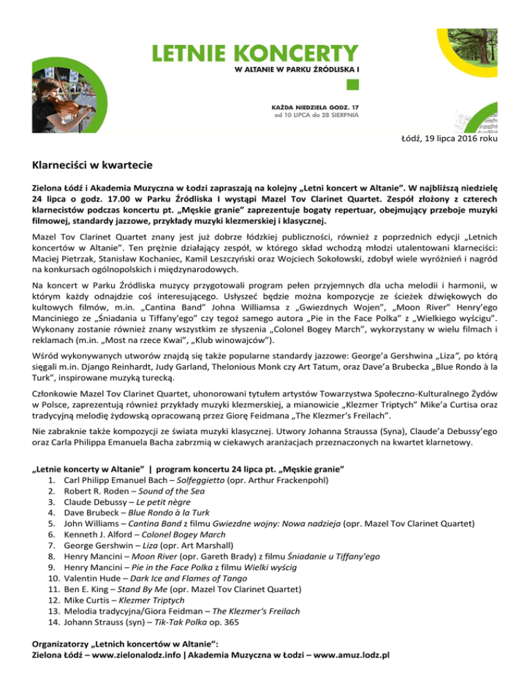 Łódź, 19 lipca 2016 roku Klarneciści w kwartecie Zielona Łódź i Akademia Muzyczna w Łodzi zapraszają na kolejny „Letni koncert w Altanie”. W najbliższą niedzielę 24 lipca o godz. 17.00 w Parku Źródliska I wystąpi Mazel Tov Clarinet Quartet. Zespół złożony z czterech klarnecistów podczas koncertu pt. „Męskie granie” zaprezentuje bogaty repertuar, obejmujący przeboje muzyki filmowej, standardy jazzowe, przykłady muzyki klezmerskiej i klasycznej. Mazel Tov Clarinet Quartet znany jest już dobrze łódzkiej publiczności, również z poprzednich edycji „Letnich koncertów w Altanie”. Ten prężnie działający zespół, w którego skład wchodzą młodzi utalentowani klarneciści: Maciej Pietrzak, Stanisław Kochaniec, Kamil Leszczyński oraz Wojciech Sokołowski, zdobył wiele wyróżnień i nagród na konkursach ogólnopolskich i międzynarodowych. Na koncert w Parku Źródliska muzycy przygotowali program pełen przyjemnych dla ucha melodii i harmonii, w którym każdy odnajdzie coś interesującego. Usłyszeć będzie można kompozycje ze ścieżek dźwiękowych do kultowych filmów, m.in. „Cantina Band” Johna Williamsa z „Gwiezdnych Wojen”, „Moon River” Henry’ego Manciniego ze „Śniadania u Tiffany'ego” czy tegoż samego autora „Pie in the Face Polka” z „Wielkiego wyścigu”. Wykonany zostanie również znany wszystkim ze słyszenia „Colonel Bogey March”, wykorzystany w wielu filmach i reklamach (m.in. „Most na rzece Kwai”, „Klub winowajców”). Wśród wykonywanych utworów znajdą się także popularne standardy jazzowe: George’a Gershwina „Liza”, po którą sięgali m.in. Django Reinhardt, Judy Garland, Thelonious Monk czy Art Tatum, oraz Dave’a Brubecka „Blue Rondo à la Turk”, inspirowane muzyką turecką. Członkowie Mazel Tov Clarinet Quartet, uhonorowani tytułem artystów Towarzystwa Społeczno-Kulturalnego Żydów w Polsce, zaprezentują również przykłady muzyki klezmerskiej, a mianowicie „Klezmer Triptych” Mike’a Curtisa oraz tradycyjną melodię żydowską opracowaną przez Giorę Feidmana „The Klezmer‘s Freilach”. Nie zabraknie także kompozycji ze świata muzyki klasycznej. Utwory Johanna Straussa (Syna), Claude’a Debussy’ego oraz Carla Philippa Emanuela Bacha zabrzmią w ciekawych aranżacjach przeznaczonych na kwartet klarnetowy. „Letnie koncerty w Altanie” ǀ program koncertu 24 lipca pt. „Męskie granie” 1. Carl Philipp Emanuel Bach – Solfeggietto (opr. Arthur Frackenpohl) 2. Robert R. Roden – Sound of the Sea 3. Claude Debussy – Le petit nègre 4. Dave Brubeck – Blue Rondo à la Turk 5. John Williams – Cantina Band z filmu Gwiezdne wojny: Nowa nadzieja (opr. Mazel Tov Clarinet Quartet) 6. Kenneth J. Alford – Colonel Bogey March 7. George Gershwin – Liza (opr. Art Marshall) 8. Henry Mancini – Moon River (opr. Gareth Brady) z filmu Śniadanie u Tiffany'ego 9. Henry Mancini – Pie in the Face Polka z filmu Wielki wyścig 10. Valentin Hude – Dark Ice and Flames of Tango 11. Ben E. King – Stand By Me (opr. Mazel Tov Clarinet Quartet) 12. Mike Curtis – Klezmer Triptych 13. Melodia tradycyjna/Giora Feidman – The Klezmer‘s Freilach 14. Johann Strauss (syn) – Tik-Tak Polka op. 365 Organizatorzy „Letnich koncertów w Altanie”: Zielona Łódź – www.zielonalodz.info ǀ Akademia Muzyczna w Łodzi – www.amuz.lodz.pl Zespół Mazel Tov Clarinet Quartet powstał w 2012 roku. W skład zespołu wchodzą studenci Łódzkiej Akademii Muzycznej im. Grażyny i Kiejstuta Bacewiczów. Członków zespołu połączyła pasja muzyczna oraz przyjaźń. Kwartet współpracuje z instytucjami kulturalnymi w Łodzi: Filharmonią Łódzką im. Artura Rubinsteina, Teatrem Nowym im. Kazimierza Dejmka w Łodzi, Teatrem im. Stefana Jaracza. W swoim dorobku artystycznym mają nagrody na międzynarodowych konkursach i festiwalach muzycznych: - wyróżnienie na X Festiwalu Klarnetowym w Piotrkowie Trybunalskim (2013) - wyróżnienie na XV Międzynarodowym Przeglądzie Zespołów Kameralnych – Jawor (2013) - wyróżnienie na XIV Międzynarodowym Konkursie Muzyczny im. Juliusza Zarębskiego (2014) - wyróżnienie na VI Zachodniopomorskim Festiwalu Klarnetowym w Szczecinie (2014) - III miejsce na konkursie “Łódź Łowi Talenty” w kategorii muzyka - udział w wydarzeniu “Koncert Roku 2014” - III miejsce na XVI Międzynarodowym Przeglądzie Zespołów Kameralnych – Jawor (2014) - III miejsce na XV Międzynarodowym Konkursie Muzyczny im. Juliusza Zarębskiego (2015) - II miejsce na XI Festiwalu Klarnetowym w Piotrkowie Trybunalskim (2015) - I miejsce na Międzynarodowym Konkursie Klarnetowym “Calrinetissim 2015” (2015) Albaida, Hiszpania Zespół czynnie koncertuje oraz współpracuje z różnymi instytucjami na terenie kraju oraz kompozytorami na arenie międzynarodowej (aktualnie m.in. z Maximem Aulio, Francja). Łódzki kwartet klarnetowy Mazel Tov w 2014 roku dokonał polskiego prawykonania jednego z utworów Aulio. Francuskiemu kompozytorowi tak spodobała się gra kwartetu, że postanowił powierzyć im także premierę następnego utworu. Ensemble jest także artystą Towarzystwa Społeczno-Kulturalnego Żydów w Polsce. W swoim dorobku ma również nagrania dla TVP. https://mazeltovquartet.wordpress.com/