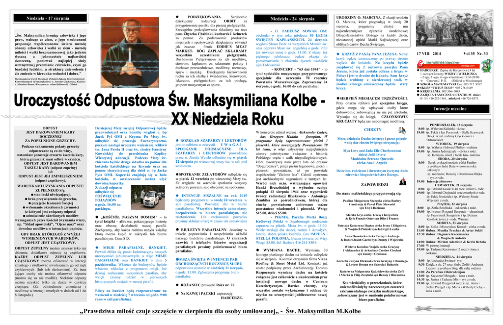 PODZIĘKOWANIA. Serdecznie dziękujemy restauracji ORBIT za przygotowanie posiłku dla pieszej pielgrzymki. Szczególne podziękowania składamy na ręce pana Zbyszka Chabinki, kucharek i kelnerek za pomoc. Za podarowanie produktów mięsnych i spożywczych dziękujemy również jak zawsze firmie EDDIE’S MEAT MARKET. BÓG ZAPŁAĆ SKŁADAMY wszystkim uczestnikom pielgrzymki, Duchowym Pielgrzymom za ich modlitwę, siostrom, kapłanom za sakrament pokuty i duchowe przewodnictwo, modlitwę, rozmowy, śpiew i muzykę. Dziękujemy kierownikom ruchu za ich służbę i świadectwo, kierowcom, lekarzom, pielęgniarkom za ich posługę, grupom muzycznym za śpiew. Niedziela - 17 sierpnia „Św. Maksymilian broniąc człowieka i jego praw, walcząc ze złem, z jego strukturami proponuje współczesnemu światu metodę obrony człowieka i walki ze złem - metodę miłości i walki bezprzemocowej jako jedynie słuszną a jednocześnie najbardziej skuteczną, ponieważ najlepiej służy wewnętrznej przemianie człowieka, czyni go bardziej ludzkim, a strukturę zniewolenia i zła zmienia w kierunku wolności i dobra.” Prowincjałowie trzech Prowincji Polskich Zakonu Braci Mniejszych Konwentualnych (Franciszkanów): o. Jarosław Zachariasz, Kraków; o. Mirosław Bartos, Warszawa; o. Adam Kalinowski, Gdańsk Niedziela - 24 sierpnia - O. TADEUSZ NOWAK OMI obchodzi w tym roku jubileusz 30 LECIA ŚWIĘCEŃ KAPŁAŃSKICH. 24 sierpnia wygłosi Słowo Boże na wszystkich Mszach św. oraz odprawi Msze św. angielską o godz. 9:30 jak również sumę o godz. 11:00. Z okazji tak pięknego jubileuszu będzie okazja do porozmawiania i złożenia życzeń osobiście ojcuTadeuszowi. - KONCERT - "63 dni 1944" - to tytuł spektaklu muzycznego przygotowanego specjalnie dla uczczenia 70 rocznicy Powstania Warszawskiego. Zapraszamy 24 sierpnia, o godz. 16:00 do sali parafialnej. URODZINY O. MARCINA. Z okazji urodzin O. Marcina, które przypadają w środę 20 sierpnia, pragniemy złożyć mu najserdeczniejsze życzenia urodzinowe; Błogosławieństwa Bożego na każdy dzień, nieustannej opieki Matki Najświętszej oraz obfitych darów Ducha Świętego. KRZYŻ Z PASJĄ PANA JEZUSA. Nowy krzyż będzie umieszczony po prawej stronie wejścia do kościoła. Na krzyżu będzie znajdować się 2 metrowa pasyjka Pana Jezusa, która już została odlana z brązu w Polsce i jest w drodze do Kanady. Sam krzyż będzie zrobiony z nierdzewnej stali, w środku którego umieszczony będzie stary krzyż. SIERPIEŃ MIESIĄCEM TRZEŹWOŚCI. Przy ołtarzu relikwii jest specjalna księga, gdzie mogą się wpisywać osoby które dobrowolnie zobowiązują się nie pić alkoholu. Wpisując się do księgi, CZŁONKOWIE KRUCJATY będą nas wspomagać modlitwą. ODPUST JEST DAROWANIEM KARY DOCZESNEJ ZA POPEŁNIONE GRZECHY. Podczas sakramentu pokuty grzechy odpuszczane są co do winy, natomiast pozostaje otwarta kwestia kary, którą grzesznik musi odbyć w czyśćcu. ODPUST JEST DAROWANIEM TAKIEJ KARY (odpust zupełny) lub ODPUST JEST JEJ ZMNIEJSZENIEM (odpust cząstkowy). WARUNKAMI UZYSKANIA ODPUSTU ZUPEŁNEGO SĄ: stan łaski uświęcającej, brak przywiązania do grzechu, przyjęcie Komunii Świętej wykonanie określonych czynności (z którymi jest związany odpust) odmówienie określonych modlitw wymaganych przez Kościół (wyznania wiary, np. "Skład apostolski", "Ojcze nasz" oraz dowolna modlitwa w intencjach papieża. GDY BRAK KTÓREGOŚ Z WYŻEJ WYMIENIONYCH WARUNKÓW, ODPUST JEST CZĄSTKOWY. ODPUST ZUPEŁNY można uzyskać tyko raz dziennie, dodatkowe odpusty są cząstkowe. KAŻDY ODPUST ZUPEŁNY LUB CZĄSTKOWY można ofiarować w intencji zmarłego i skutkować uwolnieniem go od męk czyśćcowych (lub ich skróceniem). Za inne żyjące osoby nie można ofiarować odpustu (można się za nie modlić). Niektóre odpusty można uzyskać tylko za dusze w czyśćcu cierpiące. (Za odwiedzenie cmentarza i modlitwę w intencji zmarłych w dniach od 1 do 8 listopada.) Dzisiejszej Mszy świętej Odpustowej będzie przewodniczył oraz homilię wygłosi o. bp Jacek Pyl OMI z Krymu. Po Mszy św. odbędzie się procesja Eucharystyczna, poczym nastąpi uroczyste wniesienie relikwii św. Jana Pawła II oraz św. siostry Faustyny Kowalskiej do przedsionka Kaplicy Wieczystej Adoracji. Podczas Mszy św. zbierana będzie druga składka na pomoc dla kościoła katolickiego na Krymie oraz na pomoc charytatywną dla dzieł o. bp Jacka Pyla OMI. Kopertki znajdują się w holu kościoła, w ostateczności można użyć dowolną kopertkę. Z okazji odpustu odbędzie się POŚWIĘCENIE POJAZDÓW o godz. 16:00 na parkingu. „KOŚĆIÓŁ NASZYM DOMEM” – to tytuł książki – albumu, pokazującego historię oraz obecną działalność naszej parafii. Zachęcamy, aby każda rodzina nabyła książkę którą można kupić w zakrystii lub biurze parafialnym. Cena $15. MISJE PARAFIALNE, BANKIET. Powoli zbliża się punkt kulminacyjny naszych uroczystości jubileuszowych, a więc MISJE PARAFIALNE oraz BANKIET w dniu 5 października. Wkrótce do biuletynów będzie włożona wkładka z programem misji. Już dzisiaj zachęcamy wszystkich parafian, aby wzięli czynny udział w pierwszych historycznych misjach w naszej parafii. Bilety na bankiet będą rozprowadzane na weekend w niedzielę 7 września od godz. 9:00 rano w sali parafialnej. ROZKŁAD SZAFARZY i LEKTORÓW jest do odbioru w zakrystii. U W A G A ! SPOTKANIE FORMACYJNE DLA SZAFARZY i LEKTORÓW prowadzone przez o. Józefa Wcisło odbędzie się w piątek 22 sierpnia po wieczornej mszy św. w sali pod kościołem. SPOTKANIE ZELATORÓW odbędzie się w piątek 12 września po wieczornej Mszy św. Ze względu na ważność spotkania wszyscy zelatorzy proszeni są o obecność na spotkaniu. INTENCJE MSZALNE na rok 2015 będziemy przyjmowali w środę 24 września w sali parafialnej. Pozostałe dni w biurze parafialnym. Wszystkie intencje zamawiamy bezpośrednio w biurze parafialnym, nie telefonic