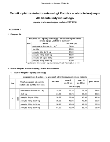 Obowiązuje od 6 marca 2014 roku Cennik opłat za świadczenie usługi Pocztex w obrocie krajowym dla klienta indywidualnego (opłaty brutto zawierające podatek VAT 23%) ROZDZIAŁ I I. Ekspres 24 Ekspres 24 – opłaty za usługę – doręczenie pod adres oraz z opcją „odbiór w punkcie” POZ. OPŁATA (zł) MASA opakowanie firmowe do 1 kg 1. 1) 1) 34,00 do 5 kg 41,00 powyżej 5 kg do 10 kg 44,00 powyżej 10 kg do 20 kg 49,00 powyżej 20 kg do 30 kg 54,00 powyżej 30 kg do 50 kg 80,00 opakowanie firmowe do 1 kg, druk nakładu Poczty Polskiej S.A. nr 144 II. Kurier Miejski, Kurier Krajowy, Kurier Bezpośredni 1. Kurier Miejski – opłaty za usługę doręczenie do 3 godzin – w granicach administracyjnych miasta nadania Strefa doręczeń od punktu Poz. nadania do punktu doręczeń Masa 2. do 5 km pow. 5 pow. 10 do 10 km do 15 km pow. 15 km OPŁATA (zł) opakowanie firmowe do 1 kg 15,99 22,14 28,29 34,44 do 5 kg 24,60 30,75 36,90 43,05 powyżej 5kg do 10 kg 30,75 36,90 43,05 49,20 powyżej 10 kg do 20 kg 36,90 43,05 49,20 55,35 powyżej 20 kg do 30 kg 36,90 43,05 49,20 55,35 powyżej 30 kg do 50 kg 61,50 73,80 86,10 98,40 doręczenie do 4 godzin – poza granicami administracyjnymi miasta nadania (przy czym odległość miejscowości, w której dokonuje się odbioru od miejscowości doręczenia nie może być większa niż 40 km) Strefa doręczeń od punktu nadania do punktu doręczeń Poz. pow. 10 do 15 km do 10 km pow. 15 do 20 km pow. 20 km do 30 km pow. 30 km do 40 km* Masa OPŁATA (zł) 3. opakowanie firmowe do 1 kg 22,14 28,29 34,44 46,74 59,04 do 5 kg 30,75 36,90 43,05 55,35 67,65 powyżej 5kg do 10 kg 36,90 43,05 49,20 61,50 73,80 powyżej 10 kg do 20 kg 43,05 49,20 55,35 67,65 79,95 powyżej 20 kg do 30 kg 43,05 49,20 55,35 67,65 79,95 powyżej 30 kg do 50 kg 73,80 86,10 98,40 110,70 123,00 UWAGA * w odległości powyżej 40 km – usługa może być realizowana w serwisie Kurier Bezpośredni 2. Kurier Krajowy – opłaty za usługę POZ. 4. 3. OPŁATA (zł) MASA opakowanie firmowe do 1 kg 92,25 do 5 kg 123,00 powyżej 5 kg do 10 kg 147,60 Kurier Bezpośredni – opłaty za usługę POZ. 5. OPŁATA (zł) MASA do 20 kg 2,21 powyżej 20 kg do 30 kg 2,21 powyżej 30 kg do 100 kg 3,08 Opłata naliczana za każdy kilometr liczony w obie strony - nie mniej niż 98,40 zł ROZDZIAŁ II USŁUGI DODATKOWE POZ. Ekspres 24 WYSZCZEGÓLNIENIE OPŁATA (zł) 6. Doręczenie do 8:00 86,10 7. Doręczenie do 9:00 49,20 8. Doręczenie do 12:00 18,45 9. Doręczenia na wskazaną godzinę 49,20 2 10. Doręczenie po 17:00 24,60 11. Doręczenie we wskazanym dniu 12,30 12. Doręczenie w sobotę 50% opłaty za usługę Ekspres 24, Kurier Miejski, Kurier Krajowy, Kurier Bezpośredni Potwierdzenie doręczenia albo zwrotu przesyłki: 13. 0,50 zł - SMS-em - e-mailem 14. Ostrożnie 50% opłaty za usługę 15. Dokumenty zwrotne 16. Sprawdzenie zawartości jak opłata za usługę Pocztex do 1 kg nadaną w opakowaniu firmowym w wybranym serwisie 6,15 Potwierdzenie odbioru: 17. - jako przesyłka listowa nierejestrowana priorytetowa 2,34 jak opłata za usługę Pocztex do 1 kg nadaną w opakowaniu firmowym w wybranym serwisie - jako przesyłka Pocztex 18. Doręczenie przesyłki do rąk własnych 19. Ponadgabaryt 18,45 50% opłaty za usługę Pobranie 20. - przekazanie kwoty pobrania na rachunek bankowy - przekazanie kwoty pobrania na adres przekazem pocztowym 2,45 7,20 UWAGA: Maksymalna wysokość kwoty pobrania wynosi 20 000,00 zł Kurier Miejski, Kurier Bezpośredni WYSZCZEGÓLNIENIE POZ. OPŁATA (zł) 21. Doręczenie do 90 minut 22. Odbiór/doręczenie w sobotę 50% opłaty za usługę 23. Odbiór/doręczenie w niedzielę/święto 20% opłaty za usługę 24. Odbiór/doręczenie 20:00-7:00 20% opłaty za usługę 18,45 ROZDZIAŁ III OPŁATY DODATKOWE, OPŁATY ZA ZWROT PRZESYŁKI, POZOSTAŁE OPŁATY OPŁATY DODATKOWE POZ. WYSZCZEGÓLNIENIE 25. Wartość (powyżej 100,00 zł) OPŁATA (zł) 0,06 zł za każde 10,00 zł zadeklarowanej wartości lub ich część, nie mniej niż 1,23 zł UWAGA Maksymalna zadeklarowana wartość przesyłki może wynosić nie więcej niż 20 000 zł, z zastrzeżeniem 3 poz. 4, dla której zadeklarowana wartość nie może być wyższa niż 1 200 zł OPŁATY ZA ZWROT PRZESYŁKI POZ. Ekspres 24 WYSZCZEGÓLNIENIE OPŁATA (zł) Zwrot przesyłki do nadawcy 26. po wyczerpaniu możliwości doręczenia odbiorcy opłata jak za usługę, odpowiednio do masy i serwisu nadanej przesyłki, wraz z pozostałymi zasadami ujętymi w poz. 27 – 34 27. Pobranie podlega zwrotowi opłata za usługę dodatkową, wniesiona w momencie nadania przesyłki 28. Potwierdzenie odbioru podlega zwrotowi opłata za usługę dodatkową, wniesiona w momencie nadania przesyłki 29. Ponadgabaryt dodatkowo naliczane 50% opłaty wyliczonej zgodnie z poz. 1 30. Ostrożnie dodatkowo naliczane 50% opłaty wyliczonej zgodnie z poz. 1 31. Sprawdzenie zawartości podlega zwrotowi opłata za usługę dodatkową, wniesiona przy nadaniu przesyłki, za wyjątkiem przypadku odmowy odbioru przesyłki przez odbiorcę po sprawdzeniu zawartości 32. Doręczenie do rąk własnych podlega zwrotowi opłata za usługę dodatkową wniesiona przy nadaniu przesyłki, za wyjątkiem przypadku odmowy odbioru przesyłki przez adresata 33. Dokumenty zwrotne podlega zwrotowi opłata za usługę dodatkową wniesiona w momencie nadania przesyłki 34. Wartość dodatkowo pobierana jest opłata zgodnie z poz. 25 35. Ubezpieczenie nie podlega zwrotowi opłata za składkę, wniesiona w momencie nadania przesyłki Kurier Miejski, Kurier Krajowy, Kurier Bezpośredni 1. Kurier Miejski do 3 h - opłata jak za usługę, odpowiednio do masy i strefy doręczeń (liczby kilometrów), wraz z pozostałymi zasadami ujętymi w poz. 37 – 44 Zwrot przesyłki do nadawcy 36. po wyczerpaniu możliwości doręczenia lub wydania nadawcy 2. Kurier Miejski do 4 h – opłata jak za usługę w serwisie Ekspres 24, odpowiednio do masy, wraz z pozostałymi zasadami ujętymi 
