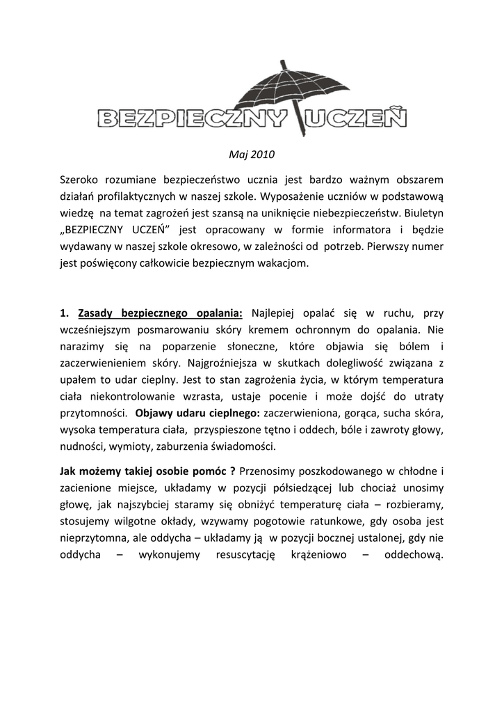 Maj 2010 Szeroko rozumiane bezpieczeństwo ucznia jest bardzo ważnym obszarem działań profilaktycznych w naszej szkole. Wyposażenie uczniów w podstawową wiedzę na temat zagrożeń jest szansą na uniknięcie niebezpieczeństw. Biuletyn „BEZPIECZNY UCZEŃ” jest opracowany w formie informatora i będzie wydawany w naszej szkole okresowo, w zależności od potrzeb. Pierwszy numer jest poświęcony całkowicie bezpiecznym wakacjom. 1. Zasady bezpiecznego opalania: Najlepiej opalać się w ruchu, przy wcześniejszym posmarowaniu skóry kremem ochronnym do opalania. Nie narazimy się na poparzenie słoneczne, które objawia się bólem i zaczerwienieniem skóry. Najgroźniejsza w skutkach dolegliwość związana z upałem to udar cieplny. Jest to stan zagrożenia życia, w którym temperatura ciała niekontrolowanie wzrasta, ustaje pocenie i może dojść do utraty przytomności. Objawy udaru cieplnego: zaczerwieniona, gorąca, sucha skóra, wysoka temperatura ciała, przyspieszone tętno i oddech, bóle i zawroty głowy, nudności, wymioty, zaburzenia świadomości. Jak możemy takiej osobie pomóc ? Przenosimy poszkodowanego w chłodne i zacienione miejsce, układamy w pozycji półsiedzącej lub chociaż unosimy głowę, jak najszybciej staramy się obniżyć temperaturę ciała – rozbieramy, stosujemy wilgotne okłady, wzywamy pogotowie ratunkowe, gdy osoba jest nieprzytomna, ale oddycha – układamy ją w pozycji bocznej ustalonej, gdy nie oddycha – wykonujemy resuscytację krążeniowo – oddechową. 2. UPAŁ Na upały szczególnie wrażliwe są małe dzieci i osoby starsze. Dlatego, gdy temperatura powietrza jest wysoka, w miarę możliwości należy ograniczyć przebywanie w miejscach nasłonecznionych. Najlepiej ubierać się w jasne, przewiewne ubrania. Dobrze jest założyć okulary przeciwsłoneczne, które ochronią nasze oczy (z filtrem UV). Podczas upałów powinno się pić dużo płynów, dlatego dobrze mieć przy sobie butelkę np. z wodą mineralną. Pomyślmy również o zwierzętach domowych- biorąc je ze sobą na wycieczkę (np. psa)- zabierzmy dla nich wodę. Napoje alkoholowe tylko pozornie gaszą pragnienie ! Za to zwiększają wytwarzanie ciepła Pamiętaj, że po wypiciu alkoholu- w żadnym wypadku- nie wolno się kąpać. Może to doprowadzić do tragedii 3. BEZPIECZEŃSTWO W WODZIE Skok do wody lub nagłe zanurzenie po uprzednim intensywnym opalaniu może spowodować tzw. szok termiczny organizmu na skutek różnicy temperatur pomiędzy nagrzanym ciałem a wodą, co z reguły powoduje utratę przytomności i może doprowadzić do utonięcia. Dlatego najlepiej jest zanurzać się stopniowa i chłodzić ciało wodą. Przebywając nad morzem pamiętajmy, aby nie nurkować w kierunku zbliżającej się fali, ponieważ przy dnie jest tzw. fala powrotna która może zabrać pływaka w głąb morza. Nie należy opalać się na materacu pływającym w morzu, ponieważ nawet słaby wiatr od lądu może nas zepchnąć daleko od brzegu. Korzystając ze sprzętu wodnego pamiętajmy, aby przed wypłynięciem koniecznie założyć kapok. Łódki lub kajaka nie wolno przeciążyć. Aby zapobiec wywróceniu ustawiamy kajak dziobem do fali. W kajaku siadamy na samym dnie. Nie dobijajmy do kamienistego brzegu, bo możemy uszkodzić sprzęt. Nie wolno wchodzić do wody, gdy: temperatura wody wynosi poniżej 14°C, widoczność powietrza i wody jest ograniczona, występuje fala powyżej 70 cm z pojawiającymi się białymi grzywami, występują bardzo silne prądy. W trakcie kąpieli nie należy krzyczeć, hałasować i wzywać pomocy, jeśli nie jest ona potrzebna. W przypadku, gdy odczujemy dreszcze – należy natychmiast wyjść z wody. Przed każdym pierwszym skokiem „na główkę” należy sprawdzić głębokość wody i rodzaj dna. Nie wolno skakać do wody płytszej niż 2,5 m. Upewnij się, czy przy dnie nie ma twardych przedmiotów (kamienie, pnie drzew, metalowe drągi, itp. SKOKI DO WODY ! W Polsce młodzież ciągle mało wie o skutkach skoków do wody. Młody człowiek nie myśli, co się z nim stanie, gdy po niefortunnym skoku do płytkiej wody uderzy głową w dno lub twarde przedmioty. Powoduje to złamanie kręgosłupa. Wielu młodych ludzi przepłaciło swoją lekkomyślność trwałym kalectwem. Teraz skazani są na wózek inwalidzki do końca życia i długie lata rehabilitacji. Statystyki są przerażające – co roku liczba takich zdarzeń wynosi kilkaset. W przypadku podejrzenia złamania kręgosłupa trzeba poszkodowanego trzymać płasko na powierzchni wody. Następnie, przy wykorzystaniu desek lub koca przenieść w kilka osób na brzeg i pilnować, aby poszkodowany nie wykonywał ruchów. Koniecznie trzeba wezwać pogotowie ratunkowe. 4. PALENIE OGNISK Ogień stanowi zagrożenie dla otoczenia. Na terenach leśnych zgodę na rozpalanie ogniska wydaje leśniczy. Ognisko należy lokalizować minimum 5 metrów od namiotu. Ogniska nie wolno zostawiać bez nadzoru. W pobliżu powinien się znajdować mały zestaw przeciwpożarowy tj. łopatka, piasek. Po zakończeniu należy dokładnie zagasić ognisko polewając je wodą i zasypując je piaskiem lub ziemią. Nie wolno wypalać traw oraz pozostałości organicznych, ponieważ niszczy to życie biologiczne na wypalanych terenach oraz jest często przyczyną pożarów. W lesie nie wolno palić papierosów oraz wyrzucać szklanych butelek. Nie wolno wyrzucać niedopałków papierosów z samochodów i okien pociągów. Według statystyk ponad 90% pożarów powodują ludzie. 5. UGRYZIENIA PRZEZ PSY, KOTY I INNE ZWIERZĘTA: Są groźne w skutkach, gdyż zwierzęta mogą być nosicielami wścieklizny. Pierwsza pomoc po ugryzieniu to przemycie rany ciepłą wodą z mydłem przez 5 – 10 minut. Po takim zabiegu należy nałożyć na ranę opatrunek i odwieźć poszkodowanego do szpitala, Być może będzie potrzebne szczepienie przeciw tężcowi i wściekliźnie. Należy ustalić właściciela i uzy