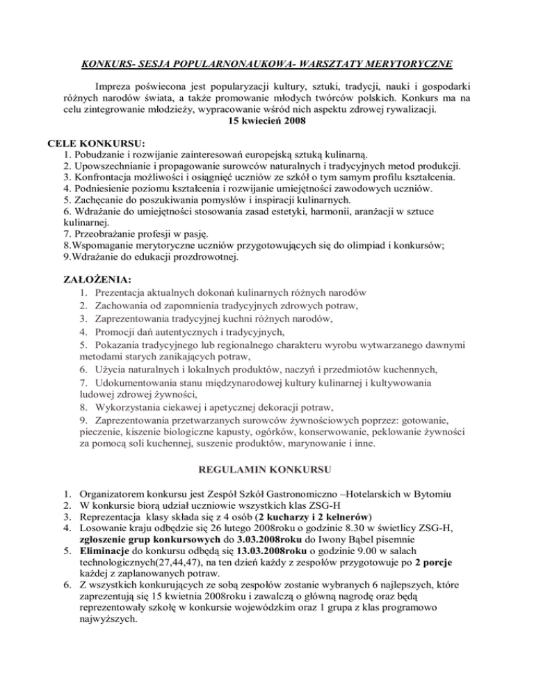 KONKURS- SESJA POPULARNONAUKOWA- WARSZTATY MERYTORYCZNE Impreza poświecona jest popularyzacji kultury, sztuki, tradycji, nauki i gospodarki różnych narodów świata, a także promowanie młodych twórców polskich. Konkurs ma na celu zintegrowanie młodzieży, wypracowanie wśród nich aspektu zdrowej rywalizacji. 15 kwiecień 2008 CELE KONKURSU: 1. Pobudzanie i rozwijanie zainteresowań europejską sztuką kulinarną. 2. Upowszechnianie i propagowanie surowców naturalnych i tradycyjnych metod produkcji. 3. Konfrontacja możliwości i osiągnięć uczniów ze szkół o tym samym profilu kształcenia. 4. Podniesienie poziomu kształcenia i rozwijanie umiejętności zawodowych uczniów. 5. Zachęcanie do poszukiwania pomysłów i inspiracji kulinarnych. 6. Wdrażanie do umiejętności stosowania zasad estetyki, harmonii, aranżacji w sztuce kulinarnej. 7. Przeobrażanie profesji w pasję. 8.Wspomaganie merytoryczne uczniów przygotowujących się do olimpiad i konkursów; 9.Wdrażanie do edukacji prozdrowotnej. ZAŁOŻENIA: 1. Prezentacja aktualnych dokonań kulinarnych różnych narodów 2. Zachowania od zapomnienia tradycyjnych zdrowych potraw, 3. Zaprezentowania tradycyjnej kuchni różnych narodów, 4. Promocji dań autentycznych i tradycyjnych, 5. Pokazania tradycyjnego lub regionalnego charakteru wyrobu wytwarzanego dawnymi metodami starych zanikających potraw, 6. Użycia naturalnych i lokalnych produktów, naczyń i przedmiotów kuchennych, 7. Udokumentowania stanu międzynarodowej kultury kulinarnej i kultywowania ludowej zdrowej żywności, 8. Wykorzystania ciekawej i apetycznej dekoracji potraw, 9. Zaprezentowania przetwarzanych surowców żywnościowych poprzez: gotowanie, pieczenie, kiszenie biologiczne kapusty, ogórków, konserwowanie, peklowanie żywności za pomocą soli kuchennej, suszenie produktów, marynowanie i inne. REGULAMIN KONKURSU 1. 2. 3. 4. Organizatorem konkursu jest Zespół Szkół Gastronomiczno –Hotelarskich w Bytomiu W konkursie biorą udział uczniowie wszystkich klas ZSG-H Reprezentacja klasy składa się z 4 osób (2 kucharzy i 2 kelnerów) Losowanie kraju odbędzie się 26 lutego 2008roku o godzinie 8.30 w świetlicy ZSG-H, zgłoszenie grup konkursowych do 3.03.2008roku do Iwony Bąbel pisemnie 5. Eliminacje do konkursu odbędą się 13.03.2008roku o godzinie 9.00 w salach technologicznych(27,44,47), na ten dzień każdy z zespołów przygotowuje po 2 porcje każdej z zaplanowanych potraw. 6. Z wszystkich konkurujących ze sobą zespołów zostanie wybranych 6 najlepszych, które zaprezentują się 15 kwietnia 2008roku i zawalczą o główną nagrodę oraz będą reprezentowały szkołę w konkursie wojewódzkim oraz 1 grupa z klas programowo najwyższych. 7. Zadanie dla zespołów składa się z czterech części: a) Przygotowanie zestawu potraw- ZAKĄSKA, DESER, DANIE ZASADNICZE ( normatywu surowcowego wraz z kalkulacją, opisu etapów wykonania, karty menu i wykonania potraw) b) Przygotowanie i nakrycie stołu c) Obsługa gości zgodnie z zasadami obsługi konsumenta d) Prezentacja danego państwa 8. Zespół uczniów w ciągu godzin(9.00-12.00) przygotowuje zestaw potraw w ilości 4 porcji (2porcje do prezentacji,1 porcja do oceny przez komisję, 1 porcja do prezentacji ogólnej) 9. Zespół uczniów prezentuje uroczyście nakryty stół dla 2 osób i serwuje w kolejności przygotowane dania. Sposób serwowania dowolny. 10. Każdy zespół powinien posiadać własne nakrycia(zastawę stołową) do podania i prezentacji oraz bieliznę stołową 11. Wymagane są KARTY DAŃ 12. W skład komisji oceniającej wchodzą przedstawiciele zawodu kucharz i/lub właściciele restauracji oraz firm cateringowych 13. Prace zespołów oceniane są podczas: a) Przygotowanie potraw w ramach organizacji stanowiska pracy umiejętności posługiwania się narzędziami, obróbki surowców i prawidłowo przeprowadzonego właściwego procesu technologicznego oraz ocena organoleptyczna potraw b) Przygotowania i estetyki nakrytego stołu c) Prawidłowo stosowanego serwisu obsługi konsumenta 12.Całkowite koszty 13.Zespoły same organizują specyficzne materiały, narzędzia i inny sprzęt niezbędny do wykonania zadania. KLASA WYCHOWAWCA NAUCZYCIEL MIEJSCE KRAJ ZAWODUPREZENTACJI wspomagający K. Gubała Ewa Pawlak 10 Ic Egipt R. Kapica Iwona Rożek 8 IT1 Japonia A Voreiiter- Rubin Krzysztof Bielat 11 IT2 Australia IH1 J. NowakBogumiła Mączka 13 Islandia Kozłowska IH2 B. Polesiak Urszula Franiel 4 Francja IH3 B. Popowicz Joanna Szukała 12 Wielka Pawłowska Brytania J. Woźniak Marcin Klop 2 IM USA T. Boryczka Renata Rosol 5 IIT1 Włochy D. Tomaszczak Mariola Jurczyk 3 IIT2 Meksyk I. Steczkiewicz Emilia Ociepa 15 IIH1 Hiszpania Skica A. Porada Robert Majda 9 IIH2 Turcja I. Klębowska Beata Kulik 1 IIM Chiny E. Cwynar Danuta Pajestka 7 IIIT1 Grecja B. KulczykDorota Wojnowska 16 IIIT2 Niemcy Ciecierska D. Domagalska Iwona Bąbel 14 IIIH1 Dania A. Blejarska Renata Kyrcz 6 IIIH2 Rosja I Bąbel 17 III M Staropolska IIILP IVT1 IVT2 IVH1 IVH2 IIC D. Pajestka M. Muzyka R. Majda J. Szukała – Pawłowska A. Kukuła W. Mieszko KRAJE : 1. CHINY 2. USA 3. MEKSYK 4. FRANCJA 5. WŁOCHY 6. ROSJA 7. GRECJA 8. JAPONIA 9. TURCJA 10. EGIPT 11. AUSTRALIA 12. WIELKA BRYTANIA 13. ISLANDIA 14. DANIA 15. HISZPANIA 16. NIEMCY 17. KUCHNIA STAROPOLSKA 18. KUCHNIA WIELKOPOLSKA 19. KUCHNIA KASZUBSKA 20. KUCHNIA MAZURSKA 21. KUCHNIA MAŁOPOLSKA 22. KUCHNIA MAZOWIECKA 18 19 20 21 Wielkopolska Śląska Kaszubska Mazurska 22 23 Małopolska Mazowiecka