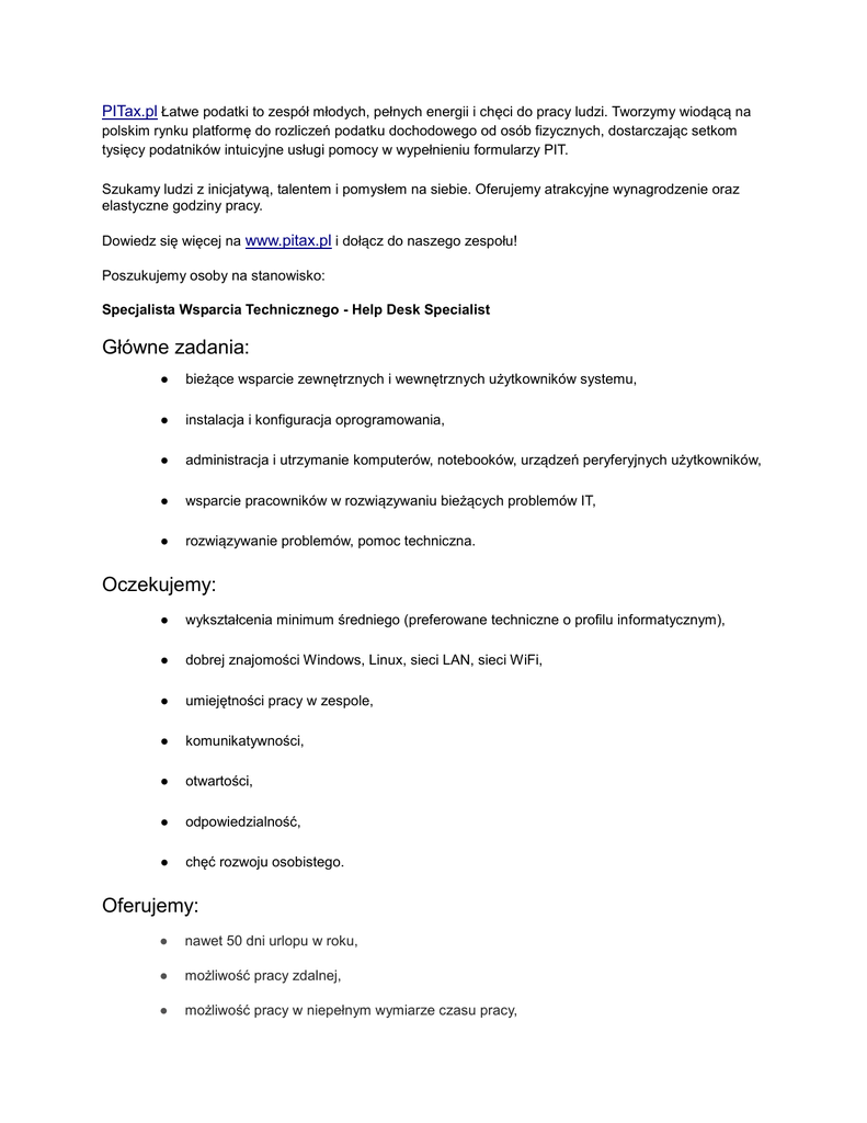 PITax.pl Łatwe podatki to zespół młodych, pełnych energii i chęci do pracy ludzi. Tworzymy wiodącą na polskim rynku platformę do rozliczeń podatku dochodowego od osób fizycznych, dostarczając setkom tysięcy podatników intuicyjne usługi pomocy w wypełnieniu formularzy PIT. Szukamy ludzi z inicjatywą, talentem i pomysłem na siebie. Oferujemy atrakcyjne wynagrodzenie oraz elastyczne godziny pracy. Dowiedz się więcej na www.pitax.pl i dołącz do naszego zespołu! Poszukujemy osoby na stanowisko: Specjalista Wsparcia Technicznego - Help Desk Specialist Główne zadania: ● bieżące wsparcie zewnętrznych i wewnętrznych użytkowników systemu, ● instalacja i konfiguracja oprogramowania, ● administracja i utrzymanie komputerów, notebooków, urządzeń peryferyjnych użytkowników, ● wsparcie pracowników w rozwiązywaniu bieżących problemów IT, ● rozwiązywanie problemów, pomoc techniczna. Oczekujemy: ● wykształcenia minimum średniego (preferowane techniczne o profilu informatycznym), ● dobrej znajomości Windows, Linux, sieci LAN, sieci WiFi, ● umiejętności pracy w zespole, ● komunikatywności, ● otwartości, ● odpowiedzialność, ● chęć rozwoju osobistego. Oferujemy: ● nawet 50 dni urlopu w roku, ● możliwość pracy zdalnej, ● możliwość pracy w niepełnym wymiarze czasu pracy, ● elastyczny czas rozpoczęcia pracy, ● możliwości dalszego rozwoju zawodowego, ● atrakcyjny system wynagradzania, ● atrakcyjny pakiet socjalny. Zainteresowane osoby prosimy o przesłanie CV na adres [email protected] do dnia 30.04.2017. W tytule maila prosimy wpisać nazwę stanowiska. Prosimy o dopisanie następującej klauzuli: "Wyrażam zgodę na przetwarzanie moich danych osobowych zawartych w mojej ofercie pracy dla potrzeb niezbędnych do realizacji procesu rekrutacji zgodnie z ustawą z dnia 29 sierpnia 1997 r. o ochronie danych osobowych (Dz. U. z 2002 r. Nr 101, poz. 926, ze zm.)" . Informujemy, że skontaktujemy się z wybranymi osobami spełniającymi nasze wymagania. PITax.pl Łatwe podatki to zespół młodych, pełnych energii i chęci do pracy ludzi. Tworzymy wiodącą na polskim rynku platformę do rozliczeń podatku dochodowego od osób fizycznych, dostarczając setkom tysięcy podatników intuicyjne usługi pomocy w wypełnieniu formularzy PIT. Szukamy ludzi z inicjatywą, talentem i pomysłem na siebie. Oferujemy atrakcyjne wynagrodzenie oraz elastyczne godziny pracy. Dowiedz się więcej na www.pitax.pl i dołącz do naszego zespołu! Poszukujemy osoby na stanowisko: Starszy Programista PHP/SilverStripe - Senior PHP/Silverstripe Programmist Główne zadania: ● Rozwój i utrzymanie stron internetowych www.pitax.pl Oczekujemy: ● Minimum 2 letniego doświadczenia w programowaniu PHP ● Swobody w tworzeniu stron WWW ● CSS/JavaScript/HTML ● Przynajmniej podstawowej znajomości SilverStripe ● Podstawowej znajomości Linux ● Wyczucia estetyki i user experience ● Rzetelności, odpowiedzialności i terminowości Oferujemy: ● nawet 50 dni urlopu w roku, ● możliwość pracy zdalnej, ● możliwość pracy w niepełnym wymiarze czasu pracy, ● elastyczny czas rozpoczęcia pracy, ● możliwości dalszego rozwoju zawodowego, ● atrakcyjny system wynagradzania, ● atrakcyjny pakiet socjalny. Zainteresowane osoby prosimy o przesłanie CV na adres [email protected] do dnia 30.04.2017. W tytule maila prosimy wpisać nazwę stanowiska. Prosimy o dopisanie następującej klauzuli: "Wyrażam zgodę na przetwarzanie moich danych osobowych zawartych w mojej ofercie pracy dla potrzeb niezbędnych do realizacji procesu rekrutacji zgodnie z ustawą z dnia 29 sierpnia 1997 r. o ochronie danych osobowych (Dz. U. z 2002 r. Nr 101, poz. 926, ze zm.)" .