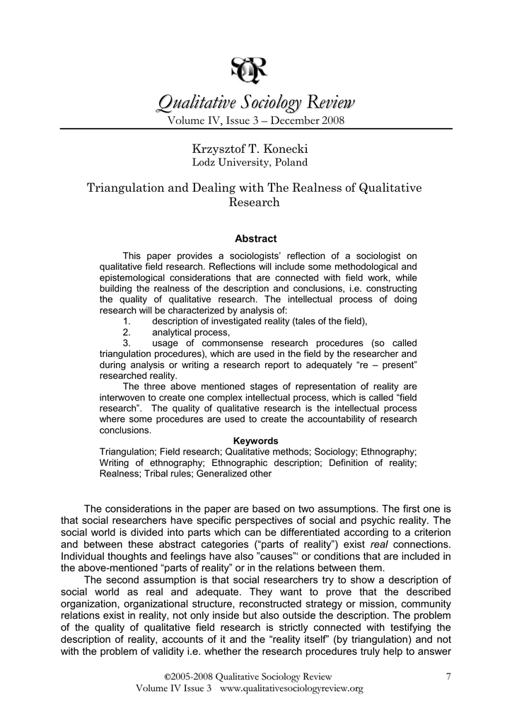 Qualitative Sociology Review Volume IV, Issue 3 – December 2008 Krzysztof T. Konecki Lodz University, Poland Triangulation and Dealing with The Realness of Qualitative Research Abstract This paper provides a sociologists’ reflection of a sociologist on qualitative field research. Reflections will include some methodological and epistemological considerations that are connected with field work, while building the realness of the description and conclusions, i.e. constructing the quality of qualitative research. The intellectual process of doing research will be characterized by analysis of: 1. description of investigated reality (tales of the field), 2. analytical process, 3. usage of commonsense research procedures (so called triangulation procedures), which are used in the field by the researcher and during analysis or writing a research report to adequately “re – present” researched reality. The three above mentioned stages of representation of reality are interwoven to create one complex intellectual process, which is called “field research”. The quality of qualitative research is the intellectual process where some procedures are used to create the accountability of research conclusions. Keywords Triangulation; Field research; Qualitative methods; Sociology; Ethnography; Writing of ethnography; Ethnographic description; Definition of reality; Realness; Tribal rules; Generalized other The considerations in the paper are based on two assumptions. The first one is that social researchers have specific perspectives of social and psychic reality. The social world is divided into parts which can be differentiated according to a criterion and between these abstract categories (“parts of reality”) exist real connections. Individual thoughts and feelings have also ”causes”‘ or conditions that are included in the above-mentioned “parts of reality” or in the relations between them. The second assumption is that social researchers try to show a description of social world as real and adequate. They want to prove that the described organization, organizational structure, reconstructed strategy or mission, community relations exist in reality, not only inside but also outside the description. The problem of the quality of qualitative field research is strictly connected with testifying the description of reality, accounts of it and the “reality itself” (by triangulation) and not with the problem of validity i.e. whether the research procedures truly help to answer ©2005-2008 Qualitative Sociology Review Volume IV Issue 3 www.qualitativesociologyreview.org 7 the research questions or whether the research measures what it was intended to measure. The quality of qualitative field research is also not connected with a problem of reliability (whether the results are consistent over time and how exact they are in their conclusions) because even revisits to the field could not solve the problem of temporal and historical changes of reality in the investigated field. The fields of ethnographic research are changing and very often are not well defined in advance (fuzzy fields); the researched phenomena could be found in many places to be observed (Nadai, Maeder 2005). Following the trail of research and constructing reality we will proceed in the wake of hints given by K. Charmaz (2006: 127). Rather than explaining reality, social constructionists see multiple realities and therefore ask: What do people assume is real? How do they construct and act on their view of reality? Thus, knowledge and theories are situated and located in particular positions, perspectives, and experiences.” Thus constructions are made by researched people and researchers themselves. The data are constructed; there is no amorphic description of reality from a constructivist perspective (see Goode 2007: 7, 14-16). Moreover, the construction is inscribed in the relation between investigated people and researchers. Even the detailed transcriptions of data and “focused ethnography” that is intensive in data gathering and analysis (Knoblauch 2005) does not resolve the problem. The question then becomes how is the description of reality constructed in ethnographic reports? The questions of realness of the researched reality Writing is also a way of ”knowing” - a method of discovery and analysis. Laurel Richardson Realness is a process of achieving compatibility of explanations of taken for granted assumptions concerning the rationality and typicality of human action in everyday life. However, concern for realness is also present in the social sciences. There are special categories and procedures for evaluating the realness of social research, such as validity, reliability, triangulation, revisits etcetera. Usually these procedures are considered to be the tools for ensuring ‘realness’ independent of the contexts of their usage. Sociologists, anthropologists, social psychologists and other researchers of society who use qualitative methodologies in their studies, especially in field studies, all tend to show a particular predilection to account for realness, in other words, validity of research conclusions, formulated hypotheses, verified theories or observed and studied reality or/and authenticity, credibility, plausibility (Belousov 2007: 163 – 164; Silverman 2001: 232- 241; Hamerslay; 1990: 57; Van Maanen 1988: 45 - 72; Stake 1994: 241; Glaser 1978: 4; Glaser, Strauss 1967: 238 - 239; Janesick 1994: 214 - 217; Kvale 1996: 229 – 250; Zakrzewska - Manterys 1996; Konecki 1989; Konecki and Kulpińska 1996; OŜyński, 1998: 9 – 15; Marciniak 2008: 46 – 48; see also Gobo 2008: 264; 267 - 268). It might be the result of their commitment to the research in the role of “research tools”, that is, acting as a device to listen, observe and record the perceived “reality”. In this role they experience on a daily basis the “dialogical” nature of their research methodology, which inter
