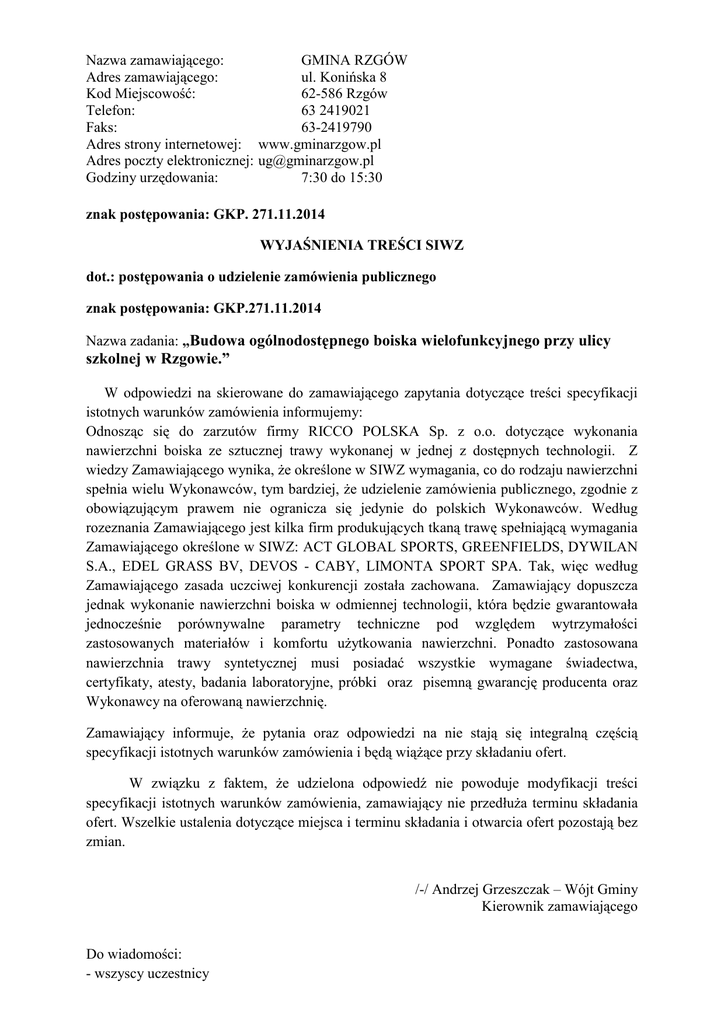 Nazwa zamawiającego: GMINA RZGÓW Adres zamawiającego: ul. Konińska 8 Kod Miejscowość: 62-586 Rzgów Telefon: 63 2419021 Faks: 63-2419790 Adres strony internetowej: www.gminarzgow.pl Adres poczty elektronicznej: [email protected] Godziny urzędowania: 7:30 do 15:30 znak postępowania: GKP. 271.11.2014 WYJAŚNIENIA TREŚCI SIWZ dot.: postępowania o udzielenie zamówienia publicznego znak postępowania: GKP.271.11.2014 Nazwa zadania: „Budowa ogólnodostępnego boiska wielofunkcyjnego przy ulicy szkolnej w Rzgowie.” W odpowiedzi na skierowane do zamawiającego zapytania dotyczące treści specyfikacji istotnych warunków zamówienia informujemy: Odnosząc się do zarzutów firmy RICCO POLSKA Sp. z o.o. dotyczące wykonania nawierzchni boiska ze sztucznej trawy wykonanej w jednej z dostępnych technologii. Z wiedzy Zamawiającego wynika, że określone w SIWZ wymagania, co do rodzaju nawierzchni spełnia wielu Wykonawców, tym bardziej, że udzielenie zamówienia publicznego, zgodnie z obowiązującym prawem nie ogranicza się jedynie do polskich Wykonawców. Według rozeznania Zamawiającego jest kilka firm produkujących tkaną trawę spełniającą wymagania Zamawiającego określone w SIWZ: ACT GLOBAL SPORTS, GREENFIELDS, DYWILAN S.A., EDEL GRASS BV, DEVOS - CABY, LIMONTA SPORT SPA. Tak, więc według Zamawiającego zasada uczciwej konkurencji została zachowana. Zamawiający dopuszcza jednak wykonanie nawierzchni boiska w odmiennej technologii, która będzie gwarantowała jednocześnie porównywalne parametry techniczne pod względem wytrzymałości zastosowanych materiałów i komfortu użytkowania nawierzchni. Ponadto zastosowana nawierzchnia trawy syntetycznej musi posiadać wszystkie wymagane świadectwa, certyfikaty, atesty, badania laboratoryjne, próbki oraz pisemną gwarancję producenta oraz Wykonawcy na oferowaną nawierzchnię. Zamawiający informuje, że pytania oraz odpowiedzi na nie stają się integralną częścią specyfikacji istotnych warunków zamówienia i będą wiążące przy składaniu ofert. W związku z faktem, że udzielona odpowiedź nie powoduje modyfikacji treści specyfikacji istotnych warunków zamówienia, zamawiający nie przedłuża terminu składania ofert. Wszelkie ustalenia dotyczące miejsca i terminu składania i otwarcia ofert pozostają bez zmian. /-/ Andrzej Grzeszczak – Wójt Gminy Kierownik zamawiającego Do wiadomości: - wszyscy uczestnicy