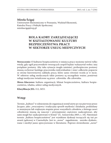 STUDIA OECONOMICA POSNANIESIA 2013, vol. 1, no. 7 (256) Mirela Ścigaj Uniwersytet Ekonomiczny w Poznaniu, Wydział Ekonomii, Katedra Pracy i Polityki Społecznej [email protected] ROLA KADRY ZARZĄDZAJĄCEJ W KSZTAŁTOWANIU KULTURY BEZPIECZEŃSTWA PRACY W SEKTORZE USŁUG MEDYCZNYCH Streszczenie: O kulturze bezpieczeństwa w miejscu pracy możemy mówić tylko wtedy, gdy ogół pracowników tworzących zespół będzie wykazywał wobec niej pożądane postawy. Aby taka sytuacja mogła zaistnieć, probezpieczne postawy muszą cechować każdego pracownika indywidualnie i mieć całkowite poparcie ze strony kierownictwa zakładu pracy, które samo również wciela je w życie. W sektorze usług medycznych takie postawy są szczególnie ważne, ponieważ usługi medyczne świadczone są przez człowieka dla człowieka. Słowa kluczowe: kultura organizacji, klimat bezpieczeństwa, kultura bezpieczeństwa, władza, sektor usług medycznych. Klasyfikacja JEL: I12, M53. Wstęp Termin „kultura” w odniesieniu do organizacji został użyty po raz pierwszy przez Jacques. jako „zwyczajowy i tradycyjny sposób myślenia i działania, podzielany w mniejszym lub większym stopniu przez wszystkich członków, a którego nowi członkowie muszą się nauczyć i przynajmniej częściowo zaakceptować, aby sami mogli być zaakceptowani w firmie” [G. Aniszewska 2003, s. 18]. Natomiast termin „kultura bezpieczeństwa” jest wynikiem dyskusji toczących się tuż po awarii jądrowej w Czarnobylu. Jest to „nowe” zagadnienie, szeroko dyskutowane i niezbyt jasno sprecyzowane w literaturze. Poprzez stwierdzenie „nowe” Rola kadry zarządzającej w kształtowaniu kultury bezpieczeństwa pracy 65 należy rozumieć chęć spostrzegania i tłumaczenia pewnych zjawisk i zależności występujących pomiędzy ludźmi w danej organizacji przez pryzmat kultury. Zależności te dotyczą ogólnych zasad funkcjonowania ludzi w środowisku pracy, takich jak środowisko społeczne, organizacyjne i materialne, otoczenie zewnętrzne i wewnętrzne organizacji. Jedną z definicji, która precyzyjnie ukazuje problem kultury bezpieczeństwa, jest definicja zaproponowana przez autorów: Ostrom, Wilhelmsen i Kaplan [1994], która brzmi: „kultura bezpieczeństwa oznacza, że postawy członków organizacji i ich wewnętrzne przekonania dotyczące bezpieczeństwa można zaobserwować w sposobie ich postępowania, ustanowionych procedurach, przyjętej polityce bezpieczeństwa oraz kolejnych podejmowanych działaniach na rzecz bezpieczeństwa. Efektem tych działań jest bezpieczeństwo”. Wydaje się, że to właśnie kultura, a raczej jej brak, ma ogromny wpływ na całokształt działań i decyzji podejmowanych przez kadrę zarządzającą w każdej organizacji. Wiele mówi się o zarządzaniu zasobami ludzkimi w aspekcie kultury organizacyjnej, mniej natomiast w aspekcie kultury bezpieczeństwa. Bezpieczeństwo spostrzegane przez pryzmat kultury wymaga zmian w podejściu do tego tematu całego społeczeństwa. Człowiek musi dostrzec kolejny etap, uwzględniając wartości dotychczas niedoceniane lub po prostu niebrane pod uwagę. W sektorze usług medycznych zagadnienie to ma szczególny wymiar ze względu na specyfikę i charakter działania placówek zdrowia. Wszelkie działania i decyzje, podejmowane szczególnie na szczeblu kierowniczym, mają bezpośredni wpływ nie tylko na zdrowie i życie pacjenta, ale również pracownika. Coraz częściej w wielu szpitalach kierownictwo jest zobowiązane do zintegrowania coraz bardziej rygorystycznych wymagań w służbie zdrowia, dotyczących bezpieczeństwa. Z jednej strony zagrożeń występujących w szpitalu jest wiele, co wynika z liczby osób tam przebywających, zarówno pracowników jak i pacjentów. Z drugiej strony natomiast zagrożenia te są bardzo zróżnicowane. Podjęcie właściwych działań w tej sferze jest zadaniem niezmiernie trudnym i wymagającym wielotorowego sposobu myślenia i działania. Niezbędna jest więc strategia zmian opracowana dla wszystkich szczebli szpitala. Rola kierownika w tworzeniu kultury bezpiecznej pracy na oddziale stanowi punkt centralny, wokół którego rozwijają się działania niezbędne do powstania i utrzymania stanu, w którym każdy członek organizacji czuje i rozumie potrzebę zaistniałych zmian. Potrzeba zaistnienia nowych standardów bezpieczeństwa rozwija potrzebę nowego podejścia do zarządzania, w tym zarządzania bezpieczeństwem pracy. Podejściem tym jest zarządzanie poprzez kulturę organizacji oraz kulturę bezpieczeństwa. W literaturze opisywane są przypadki bankructwa organizacji, które wprowadzając nowe zasady zarzadzania, nie uwzględniły zasad kultury organizacji. 66 Mirela Ścigaj 1. Wpływ uwarunkowań ekonomiczno-społecznych na kulturę bezpieczeństwa pracy kadry medycznej Jednostki medyczne dzielą się ze względu na formę organizacyjną i własnościową. Różnią się one ze względu na warunki niezbędne do świadczenia usług medycznych, sposób świadczenia usług oraz specjalizację personelu. Z tego punktu widzenia istnieje następujący podział: szpital, zakład opiekuńczo-leczniczy, zakład pielęgnacyjno-opiekuńczy, sanatorium, prewentorium, hospicjum, hostel, oddział dzienny, przychodnia, ośrodek zdrowia, poradnia, pogotowie ratunkowe, laboratorium diagnostyczne, pracownia protetyki stomatologicznej i ortodoncji, zakład rehabilitacji leczniczej, żłobek, zakład leczniczo-wychowawczy i gabinet medycyny szkolnej. Każda z wymienionych jednostek świadczących usługi medyczne ma inną strukturą i inna kulturę organizacyjną. Różnice w funkcjonowaniu tych jednostek, jak i kształtowaniu przez nie kultury organizacji, wynikają również z formy własności. Zasadnicze znaczenie pod tym względem ma podział na jednostki publiczne i prywatne. Według Krota [2008] usługa medyczna świadczona jest w celu zapewnienia zdrowia lub wzbogacania walorów osobistych. H
