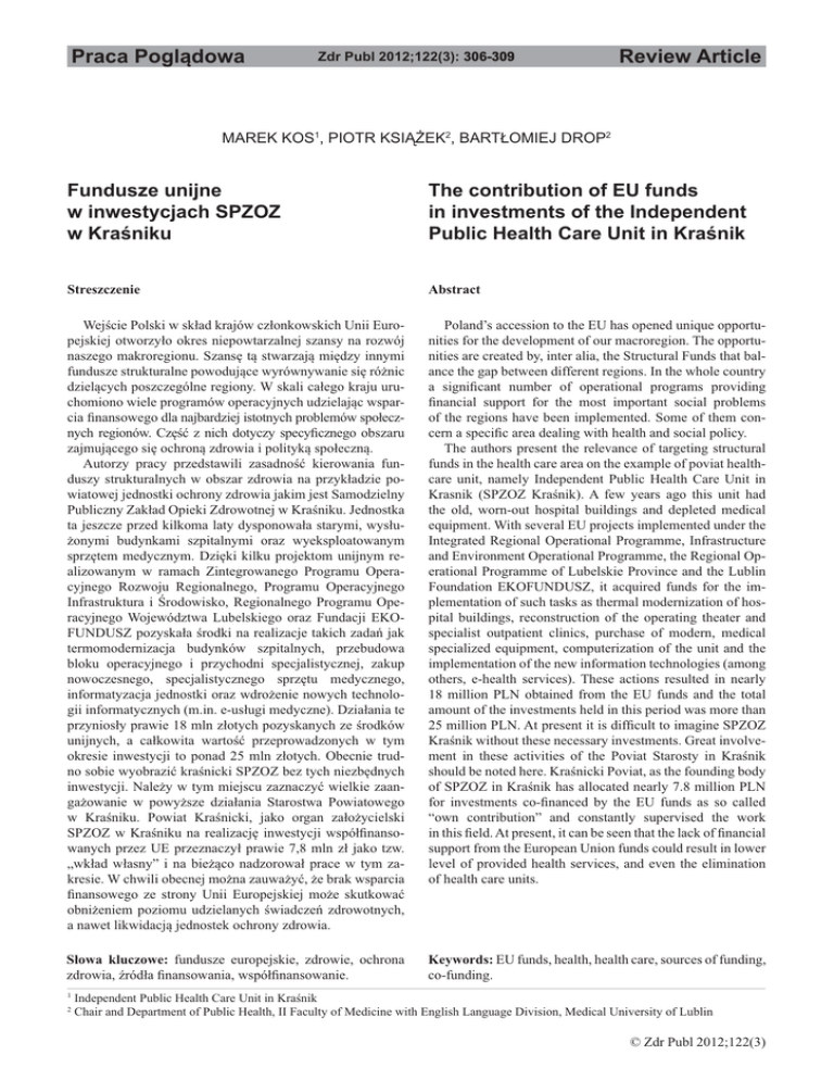 Zdr Publ 2012;122(3): 306-309 -309 Review Article 1 2 2 !"#! $%!&' *+# Streszczenie Abstract !"##" $ #"% # #& ' ' *"+ & ' # " # # # , + $ ' ! './. 45 6% ' "7" . / 8 8 6 / 9$ : 6 8 / <' = 4/=>7!. ? ' 6 ' ' 6 6 " 6 $ % $ @AB7 CD 6 + EF /' ' '+!./.''" >%+% % ! 4 46 % !./. 4 " & G6D H I '%# ' %%+6%' & % + '% ? 6 # J K $ L $ M '66!=''$$ 9 & ' $ L & $ ' $ L'! $ & M L $ $ N $ L 6 9 ' O * 4 @!./. 4B , $ 6 A ' KL 98 / 69$ L / 68 / $<' L<' = 4/=>7!.6 K $ $ $ $ '6 $ 6 $ 6 K6 $ $$ @ 6 A LB M CD <> ' $ $ $L EF <>,$& !./. 4 LQL L L $ L ! 4 ' 4 L6$ ' $!./.4 GD <> $ L A& ' $ R ' I L &,6' $& $ $ L $ LL6L $ $ 6 6 6T& 6& $666 $$6 A$ 1 9'O*4 *7 $'O699= $S<7L 6SL $<' 2 © Zdr Publ 2012;122(3) Zdr Publ 2012;122(3) / $ L $ $ L '< $ $L6 $ $ L6 L $ L ' M' ' 6 $L N $ A$ 6 6 $L $ K ! SM $CWWE XCY6 ,M $ CWWG XEY HM $ O[,!, $ EVVDA EVCUI $EVVGXUY L L $ $L $S'! X\Y 9 ' L6 EVVG68 / EVVGAEVCU$ <' L@8/BXFY6 $ L L $ <' $ $ , $<' L8/ ,N ]999[ ! 9$ M 'L $ N L 6L MS/$& <' ,N ]999 $ L LM $ $ K $ 8 $S $O6 $ K6 $ 'M 6 & ' $$ ' $' $&, N K'9'O* 4 9'O*@!./.B4 L 6 L 6 A 6 ' 6 X^Y M $ ' $ 4 L M !./. 4 L O \VE'6 L/!* L UV 8' *OL L 4 L _ L ,$ 6 '4 L A $<' L6 $ $ CVV6FU\6CE @ $ E\ LBMCVE@4 , B EV^ L M L WW6FUC 6\D^ 6 FVW M CE WW M $4 L' 'UD6FDD 6 _'^V6W\U XGY M K $ !./. 4 EVV^ & 6 EVV\AEVVF6 L $ $` $ '$ L 9L * 7 $M!9 L' UVG H $I $$6 LM ' ' ^VJ6 '' $ GVJ DVJ $MK L 6 $ $ ` $'MK $$$ M ' ' L'4 L_$ ' $6$< Q L, $CWWD6 $ $ L $ $ L L L6 $ '$ $ $LXDY LL L L L 6AN $6 $ ' L O L6 L L L$&& & L ' L MN$ $ L ' ' ! EVVG6 !./. 46 $ $ 6 ' $ $ 9&L6L' CVVa $ L M L CD <> '$ $ $ L EF M 6$& !./.4 ' L 6 *M 6 K6 $' & L ! / * O6 L L $ L ! 4 L6 '4 L6$ ' $ !./. 4 GD <> H ' I$ L A& ' = C $ ' $ 4 L $ $ L !./. 4 A& $ $ !./.4$$ K $ & $ $ EVV\AEVV^ 9 8 / -2012) 7,785,823.86 PLN 19,136,222.85 PLN UE funds !"! # ! $%! ! ! %& ' $"! ( ) ! *$+,+-! # !./ "*0112.010- 308 Zdr Publ 2012;122(3) @98/B H* $K$ !./.4I6 $C6UDC6EGUDD<>K* K ' @ 6 eA $ B, EVVG K $$$ $4/=>7!.= $ $ ' $ ' = CC <> ' L $\6CGC6^DW\G<> L! 4' LU <>$ 9EVCV ' S $ O @/ 9$ L B 4 K $ $ H9 $& $ L !./. 4 $ $ KI M S $$ C6\^U6VFVVV<>$ $ fHI $L $ SJ/$&<'8 / $<' L$ EVVGAEVCU 6 !./. 4 L $ $ &L 6 $ ' CF6CWC6DWW^U<>M $ $$M'C @ L $ 98/6 /9 = 4/=>7!.BM $ K @ *M6NA6 B6 $ $ 'MN $ @AL B CONCLUSIONS C $ L 'K $ E M $ L L ' $ $$LK $$ U < L ' $ 6 ' & L \ > & $ L $L L6L K $ REFERENCES C M S6 G CWWE @%Ce9CWWUB6Me/ . ,CEW/5* CWC6EWCWWE E M, ETCWWG@% CCWWWB6Me999,CFE/5*U\V6CV CWWG U f 4" H8 [ EVVDAEVCUI f6 EC EVVG 4/S@EVVGB ^E \ !' S6 S5 = ' .'EVVDgCCD@\B[UDGAWE F [hh '6 "[CDVGEVCE ^ CFEVCC @7EVCC CCE ^F\TB G <'*. ' <'9$ ' EVVDEVVW[E\[WW D FCWWD # @7 CWWDWC FGDTB 345 '6 !&'& " $+,+ ! # ! '7&& 7! ,'! $7&& 5"! $%! 8 7 7! ,'! $7&&8 ,'! $7&& %! & ! ,9:+8 !% & ! 7"' ! > C E U \ F M L $ <> $<> “* and purchase of medical equipment for SPZOZ in Kranik” (98/B C6^F\6^UFGF C6UDC6EGUEE \6CGC6^DW\G C6CVV6VVVVV E6D^\6FGWGV E6EFE6FDDC\ U6^CF6C^F\U C6WDW6^EFEW C6GEC6EUWD^ C6\^U6VFVVV the main building of the Poviat Hospital with the exchange of coal boiler to a gas one” 6EKOFUNDUSZ) “Increasing access to medical services in SPZOZ in Kranik through the purchase of medical equipment of e-L” (8/B 6 $K of a hospital clinic building $ to improve medical services” (8/B “Increasing the !" "# emergency medical services in SPZOZ in Kranik $ % emergency department and purchase of medical equipmentI(OPIE) ^ three buildingsSPZOZ at Chopin’s St. 13 and Wyszynski St. 6 “(8/B E6VDD6WDGWW C6GGF6^UWGD G “The purchase of specialized and highly specialized equipment for SPZOZ in Kranik” (8/B F6VDE6DVVFV \6UEV6UDV\E D " &$" of theatre in Kranik SPZOZ to the requirements &" $ & of the Minister of Health” (8/B F6GEU6V\DVC \6DFU6^^^VV E^6WEE6V\^GC CW6CU^6EEEDF M Zdr Publ 2012;122(3) &63 7 0$5(. .26 _ A 7 S !./. 4g $ ' 6 3,275 .6,Ąĩ(. _ g %$57à20,(- '523 _ 6 4 . . ' 6 99 < / , "6 S<' 309 3' 6! S4 * CU6EUAEVV4 ^WFUUVGVV A[ j