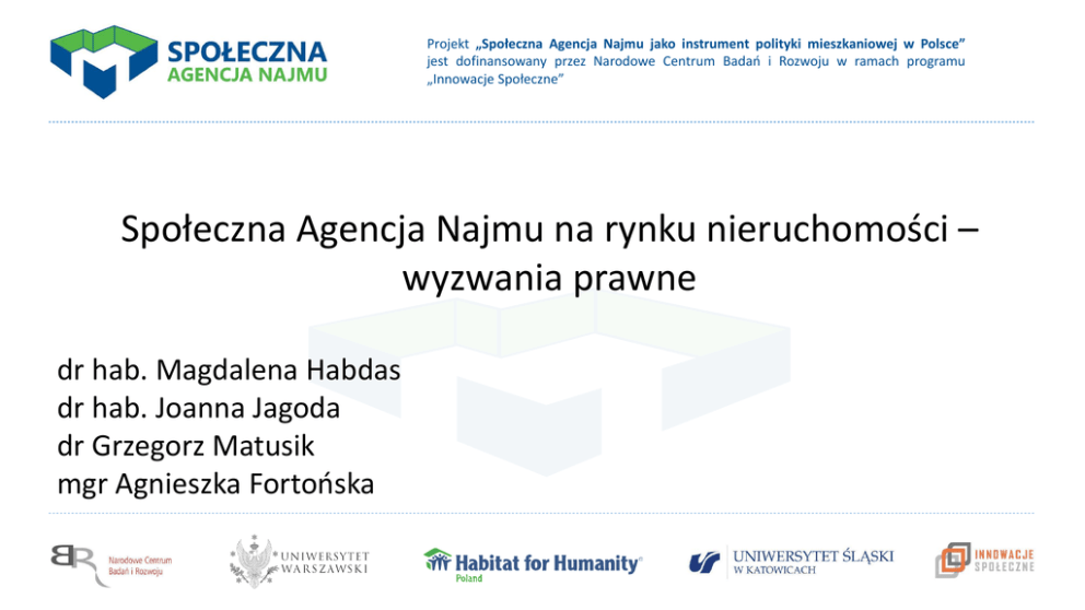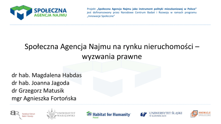 Projekt „Społeczna Agencja Najmu jako instrument polityki mieszkaniowej w Polsce” jest dofinansowany przez Narodowe Centrum Badań i Rozwoju w ramach programu „Innowacje Społeczne” Społeczna Agencja Najmu na rynku nieruchomości – wyzwania prawne dr hab. Magdalena Habdas dr hab. Joanna Jagoda dr Grzegorz Matusik mgr Agnieszka Fortońska Projekt „Społeczna Agencja Najmu jako instrument polityki mieszkaniowej w Polsce” jest dofinansowany przez Narodowe Centrum Badań i Rozwoju w ramach programu „Innowacje Społeczne” Zadanie Dokonanie oceny istniejącego stanu prawnego w zakresie dopuszczalności funkcjonowania SAN z głównym naciskiem położonym na analizę prawa cywilnego i samorządowego, a także określenie głównych barier prawnych w ich poprawnym funkcjonowaniu Zaplanowane rezultaty • Wskazanie aktualnych możliwości lub ich braku funkcjonowania SAN w oparciu o obowiązujące przepisy prawne • Identyfikacja najważniejszych barier prawnych dotyczących tworzenia i funkcjonowania SAN • Rozważenie niezbędnych zmian w ustawodawstwie umożliwiających w przyszłości tworzenie i funkcjonowanie SAN Projekt „Społeczna Agencja Najmu jako instrument polityki mieszkaniowej w Polsce” jest dofinansowany przez Narodowe Centrum Badań i Rozwoju w ramach programu „Innowacje Społeczne” Podstawowy zakres analizy prawnej • • • • • • • • najem w kodeksie cywilnym ustawa o ochronie praw lokatorów i mieszkaniowym zasobie gminy ustawa o gospodarce nieruchomościami ustawa o samorządzie gminnym ustawa o gospodarce komunalnej kodeks spółek handlowych prawo podatkowe (PIT, CIT, VAT) dodatkowo: przepisy o stowarzyszeniach, fundacjach, wolontariacie i organizacjach pożytku publicznego, niedozwolonej pomocy publicznej Projekt „Społeczna Agencja Najmu jako instrument polityki mieszkaniowej w Polsce” jest dofinansowany przez Narodowe Centrum Badań i Rozwoju w ramach programu „Innowacje Społeczne” SAN a umowa najmu 1) Najem: wynajmujący – SAN 2) Podnajem: SAN- lokator Ad. 1) Brak stosowania przepisów u.o.p.l., SAN może podnająć tylko za zgodą wynajmującego, zgoda powinna zostać zawarta w umowie i mieć charakter blankietowy. Gmina: zasady wynajmowania na czas oznaczony ponad 3 lata lub nieoznaczony określa rada gminy w uchwale. Ad. 2) Podnajemca jest lokatorem. Ochrona i wygaśnięcie najmu zgodnie z u.o.p.l. Podnajem może być najmem okazjonalnym (nie w przypadku gdy SAN tworzy gmina – art. 19 a ust. 1a oraz 20 ust. 2a u.o.p.l.) Istotne jest uregulowanie praw i obowiązków co do utrzymania lokalu w relacjach 1) i 2) Projekt „Społeczna Agencja Najmu jako instrument polityki mieszkaniowej w Polsce” jest dofinansowany przez Narodowe Centrum Badań i Rozwoju w ramach programu „Innowacje Społeczne” Modele działalności SAN • SAN prywatny: spółka z o.o. fundacja • SAN gminny: spółka z o.o. (jednoosobowa, wieloosobowa: z udziałem większościowym, lub mniejszościowym) jednostki organizacji wewnętrznej (zakład budżetowy – jeżeli uznamy, że SAN pozostaje w sferze użyteczności publicznej) zlecenie wykonywania zadań własnych podmiotowi zewnętrznemu (np. organizacji pozarządowej) Projekt „Społeczna Agencja Najmu jako instrument polityki mieszkaniowej w Polsce” jest dofinansowany przez Narodowe Centrum Badań i Rozwoju w ramach programu „Innowacje Społeczne” SAN a podatki • podatek dochodowy od osób fizycznych: wprowadzenie zwolnienia przewidującego uwolnienie przychodów z najmu lokali mieszkalnych na rzecz SAN spod opodatkowania podatkiem dochodowym od osób fizycznych • podatek dochodowy od osób prawnych wprowadzenie zwolnienia z podatku dochodowego od osób prawnych w oparciu o art. 17 ust. 1 pkt 44 u.p.d.o.p. również w stosunku do SAN, które nie są gminnymi osobami prawnymi. Wyraźne wskazanie w tym przepisie, że SAN pozwoliłoby na uniknięcie wątpliwości co do możliwości stosowania omawianego zwolnienia przez SAN Projekt „Społeczna Agencja Najmu jako instrument polityki mieszkaniowej w Polsce” jest dofinansowany przez Narodowe Centrum Badań i Rozwoju w ramach programu „Innowacje Społeczne” SAN a podatki VAT • zmiana art. 43 ust. 1 pkt 36 uVAT w sposób pozwalający na wyłączenie spod opodatkowania podatkiem od towarów i usług również wynajmu nieruchomości pośrednikom będącym SAN. Istotne jest to, że rozwiązanie takie nie naruszałoby wymogów Dyrektywy Rady 2006/112/WE z dnia 28 listopada 2006 r. w sprawie wspólnego systemu podatku od wartości dodanej (Dz. U. UE. L. z 2006 r. Nr 347, str. 1 ze zm.) • rozważenia wymaga także zwolnienie od podatku VAT wynajmu mieszkań na rzecz SAN przez osoby prawne (a nie tylko osoby fizyczne) Projekt „Społeczna Agencja Najmu jako instrument polityki mieszkaniowej w Polsce” jest dofinansowany przez Narodowe Centrum Badań i Rozwoju w ramach programu „Innowacje Społeczne” SAN a podatki • bariery: brak jest barier całkowicie uniemożliwiających funkcjonowanie SAN, natomiast wskazane wcześniej obszary problematyczne utrudniają wdrożenie SAN na rynku • wyjątkiem może być restrykcyjna interpretacja art. 43 ust. 1 pkt 36 uVAT • brak instrumentów motywujących do zakładania SAN: brak wsparcia ustawodawcy poprzez mechanizmy podatkowe, pomocowe, kampanie społeczne • istotne znaczenie pilotażu dla precyzyjnej identyfikacji przeszkód w funkcjonowaniu SAN w ujęciu prawnym, organizacyjnych, społecznym. Projekt „Społeczna Agencja Najmu jako instrument polityki mieszkaniowej w Polsce” jest dofinansowany przez Narodowe Centrum Badań i Rozwoju w ramach programu „Innowacje Społeczne” Dziękuję za uwagę dr hab. Magdalena Habdas Wydział Prawa i Administracji, Uniwersytet Śląski