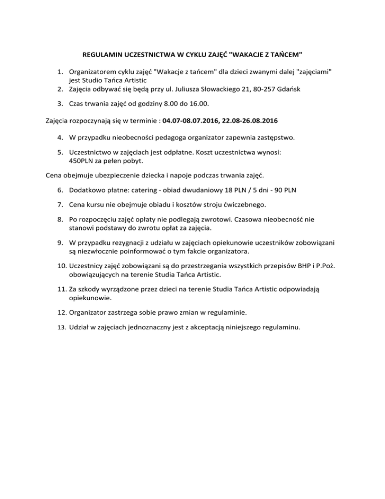 REGULAMIN UCZESTNICTWA W CYKLU ZAJĘĆ "WAKACJE Z TAŃCEM" 1. Organizatorem cyklu zajęć "Wakacje z tańcem" dla dzieci zwanymi dalej "zajęciami" jest Studio Tańca Artistic 2. Zajęcia odbywać się będą przy ul. Juliusza Słowackiego 21, 80-257 Gdańsk 3. Czas trwania zajęć od godziny 8.00 do 16.00. Zajęcia rozpoczynają się w terminie : 04.07-08.07.2016, 22.08-26.08.2016 4. W przypadku nieobecności pedagoga organizator zapewnia zastępstwo. 5. Uczestnictwo w zajęciach jest odpłatne. Koszt uczestnictwa wynosi: 450PLN za pełen pobyt. Cena obejmuje ubezpieczenie dziecka i napoje podczas trwania zajęć. 6. Dodatkowo płatne: catering - obiad dwudaniowy 18 PLN / 5 dni - 90 PLN 7. Cena kursu nie obejmuje obiadu i kosztów stroju ćwiczebnego. 8. Po rozpoczęciu zajęć opłaty nie podlegają zwrotowi. Czasowa nieobecność nie stanowi podstawy do zwrotu opłat za zajęcia. 9. W przypadku rezygnacji z udziału w zajęciach opiekunowie uczestników zobowiązani są niezwłocznie poinformować o tym fakcie organizatora. 10. Uczestnicy zajęć zobowiązani są do przestrzegania wszystkich przepisów BHP i P.Poż. obowiązujących na terenie Studia Tańca Artistic. 11. Za szkody wyrządzone przez dzieci na terenie Studia Tańca Artistic odpowiadają opiekunowie. 12. Organizator zastrzega sobie prawo zmian w regulaminie. 13. Udział w zajęciach jednoznaczny jest z akceptacją niniejszego regulaminu.