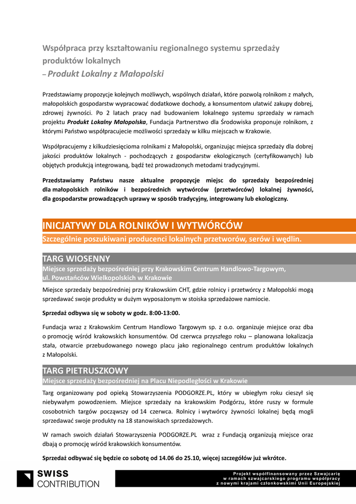Współpraca przy kształtowaniu regionalnego systemu sprzedaży produktów lokalnych – Produkt Lokalny z Małopolski Przedstawiamy propozycje kolejnych możliwych, wspólnych działań, które pozwolą rolnikom z małych, małopolskich gospodarstw wypracować dodatkowe dochody, a konsumentom ułatwić zakupy dobrej, zdrowej żywności. Po 2 latach pracy nad budowaniem lokalnego systemu sprzedaży w ramach projektu Produkt Lokalny Małopolska, Fundacja Partnerstwo dla Środowiska proponuje rolnikom, z którymi Państwo współpracujecie możliwości sprzedaży w kilku miejscach w Krakowie. Współpracujemy z kilkudziesięcioma rolnikami z Małopolski, organizując miejsca sprzedaży dla dobrej jakości produktów lokalnych - pochodzących z gospodarstw ekologicznych (certyfikowanych) lub objętych produkcją integrowaną, bądź też prowadzonych metodami tradycyjnymi. Przedstawiamy Państwu nasze aktualne propozycje miejsc do sprzedaży bezpośredniej dla małopolskich rolników i bezpośrednich wytwórców (przetwórców) lokalnej żywności, dla gospodarstw prowadzących uprawy w sposób tradycyjny, integrowany lub ekologiczny. INICJATYWY DLA ROLNIKÓW I WYTWÓRCÓW Szczególnie poszukiwani producenci lokalnych przetworów, serów i wędlin. TARG WIOSENNY Miejsce sprzedaży bezpośredniej przy Krakowskim Centrum Handlowo-Targowym, ul. Powstańców Wielkopolskich w Krakowie Miejsce sprzedaży bezpośredniej przy Krakowskim CHT, gdzie rolnicy i przetwórcy z Małopolski mogą sprzedawać swoje produkty w dużym wyposażonym w stoiska sprzedażowe namiocie. Sprzedaż odbywa się w soboty w godz. 8:00-13:00. Fundacja wraz z Krakowskim Centrum Handlowo Targowym sp. z o.o. organizuje miejsce oraz dba o promocję wśród krakowskich konsumentów. Od czerwca przyszłego roku – planowana lokalizacja stała, otwarcie przebudowanego nowego placu jako regionalnego centrum produktów lokalnych z Małopolski. TARG PIETRUSZKOWY Miejsce sprzedaży bezpośredniej na Placu Niepodległości w Krakowie Targ organizowany pod opieką Stowarzyszenia PODGORZE.PL, który w ubiegłym roku cieszył się niebywałym powodzeniem. Miejsce sprzedaży na krakowskim Podgórzu, które ruszy w formule cosobotnich targów począwszy od 14 czerwca. Rolnicy i wytwórcy żywności lokalnej będą mogli sprzedawać swoje produkty na 18 stanowiskach sprzedażowych. W ramach swoich działań Stowarzyszenia PODGORZE.PL wraz z Fundacją organizują miejsce oraz dbają o promocję wśród krakowskich konsumentów. Sprzedaż odbywać się będzie co sobotę od 14.06 do 25.10, więcej szczegółów już wkrótce. STRAGAN MAŁOPOLSKI W CARREFOUR Stoisko patronackie w Hipermarkecie Carrefour w Parku Handlowym Zakopianka w Krakowie Stała dostawa do sklepu płodów rolnych, przetworów, jaj i innych produktów dobrej jakości na stoisko patronackie projektu Produkt Lokalny Małopolska, pod nazwą Stragan Małopolski w sklepie Carrefour w Parku Handlowym Zakopianka w Krakowie. Fundacja wraz ze sklepem Carrefour będzie organizować miejsce oraz dbać o promocję wśród krakowskich konsumentów. Sklep Carrefour odda również do dyspozycji przestrzeń magazynową oraz zapewni pomoc w aranżacji stoiska. Sprzedaż odbywać się będzie na „ruchomym stoisku”, w alei głównej sklepu, od piątku do niedzieli. Dodatkowo co kwartał będzie organizowany Targ produktów Lokalnych (na większej przestrzeni), więcej szczegółów już wkrótce. SPRZEDAŻ DO SKLEPÓW, RESTAURACJI I HOTELI Stałe dostawy do obiektów handlowych i usługowych w Małopolsce Stała dostawa do obiektów handlowych i usługowych (sklepy, restauracje, hotele itp.) płodów rolnych, przetworów, jaj i innych produktów dobrej jakości Fundacja nawiązuje kontakty z różnymi punktami sprzedaży w Małopolsce za pośrednictwem swoich przedstawicieli handlowych. INICJATYWY DLA ROLNIKÓW EKOLOGICZNYCH Płody rolne i przetwory z certyfikowanych gospodarstw ekologicznych STRAGAN MAŁOPOLSKI W ECO-DELIKATESACH SOLVAY PARK Stoisko patronackie w Galerii Handlowej Solvay Park w Krakowie przy ul. Zakopiańskiej Stała dostawa do sklepu własnych ekologicznych płodów rolnych i przetworów dobrej jakości na stoisko patronacki projektu Produkt Lokalny Małopolska w Eco Delikatesach w Galerii Handlowej Solvay Park. Dostawy do Eco Delikatesów realizowane są aktualnie raz w tygodniu (w środy lub czwartki), ale możliwe są też indywidualne uzgodnienia z kierownictwem sklepu. NICJATYW 6: Przyjmowanie zgłoszeń i dodatkowe informacje: Małgorzata Rudnicka 12 430 24 43 w. 16 [email protected] Liczymy, że wspólnie uda się nam zbudować system Małopolski Produkt Lokalny, który wygeneruje korzyści dla Państwa, regionu oraz dla całej Małopolski.