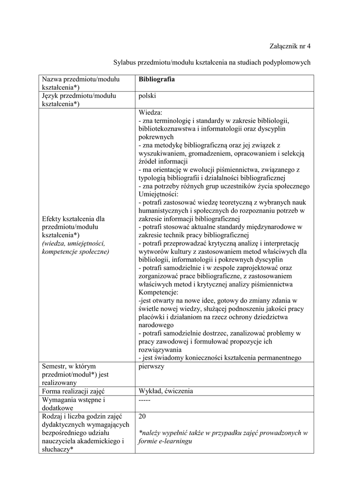 Załącznik nr 4 Sylabus przedmiotu/modułu kształcenia na studiach podyplomowych Nazwa przedmiotu/modułu kształcenia*) Język przedmiotu/modułu kształcenia*) Efekty kształcenia dla przedmiotu/modułu kształcenia*) (wiedza, umiejętności, kompetencje społeczne) Semestr, w którym przedmiot/moduł*) jest realizowany Forma realizacji zajęć Wymagania wstępne i dodatkowe Rodzaj i liczba godzin zajęć dydaktycznych wymagających bezpośredniego udziału nauczyciela akademickiego i słuchaczy* Bibliografia polski Wiedza: - zna terminologię i standardy w zakresie bibliologii, bibliotekoznawstwa i informatologii oraz dyscyplin pokrewnych - zna metodykę bibliograficzną oraz jej związek z wyszukiwaniem, gromadzeniem, opracowaniem i selekcją źródeł informacji - ma orientację w ewolucji piśmiennictwa, związanego z typologią bibliografii i działalności bibliograficznej - zna potrzeby różnych grup uczestników życia społecznego Umiejętności: - potrafi zastosować wiedzę teoretyczną z wybranych nauk humanistycznych i społecznych do rozpoznaniu potrzeb w zakresie informacji bibliograficznej - potrafi stosować aktualne standardy międzynarodowe w zakresie technik pracy bibliograficznej - potrafi przeprowadzać krytyczną analizę i interpretację wytworów kultury z zastosowaniem metod właściwych dla bibliologii, informatologii i pokrewnych dyscyplin - potrafi samodzielnie i w zespole zaprojektować oraz zorganizować prace bibliograficzne, z zastosowaniem właściwych metod i krytycznej analizy piśmiennictwa Kompetencje: -jest otwarty na nowe idee, gotowy do zmiany zdania w świetle nowej wiedzy, służącej podnoszeniu jakości pracy placówki i działaniom na rzecz ochrony dziedzictwa narodowego - potrafi samodzielnie dostrzec, zanalizować problemy w pracy zawodowej i formułować propozycje ich rozwiązywania - jest świadomy konieczności kształcenia permanentnego pierwszy Wykład, ćwiczenia ----20 *należy wypełnić także w przypadku zajęć prowadzonych w formie e-learningu Liczba punktów ECTS przypisana przedmiotowi/modułowi*) Stosowane metody dydaktyczne Sposób weryfikacji efektów kształcenia uzyskanych przez słuchaczy 4 Forma i warunki zaliczenia przedmiotu/modułu*), w tym zasady dopuszczenia do egzaminu, zaliczenia Ocena z modułu jest oceną ważoną z oceny egzaminu (70 %) i projektu (30 %), wykonanego w czasie ćwiczeń (opracowanie spisu bibliograficznego) Treści programowe przedmiotu/modułu kształcenia*) Wykład, prezentacja, ćwiczenia Egzamin ustny Zaliczenie (cwiczenia) Wykład 1. Organizacja działalności normalizacyjnej w zakresie bibliografii: międzynarodowe i narodowe instytucje normalizacyjne; prace Instytutu Bibliograficznego Biblioteki Narodowej. Uniwersalna Rejestracja Bibliograficzna (UBC), International Standard Text Code. 2. Definicja dokumentu (stary druk, druk, nagranie, dokument elektroniczny ). Rodzaje dokumentów, stanowiących przedmiot spisów bibliograficznych. 3. Bibliograficzna analiza dokumentu. Cechy wydawnicze i piśmiennicze dokumentu a spis bibliograficzny. 4. Klasyfikacja i typologia opracowań bibliograficznych: wspólne i odmienne cechy spisów bibliograficznych, kryteria podziału bibliografii 6. Rodzaje opracowań bibliograficznych ze względu na sposób doboru materiałów, stosownie do wspólnych cech, zakresu i zasięgu spisu, metody jego sporządzenia i przeznaczenia 7. Bibliografia narodowa: ewolucja terminu; bibliografia narodowa a bibliografia państwowa i bibliografia regionalna. Pojęcie bibliografii narodowej w ujęciu K. Estreichera. Egzemplarz obowiązkowy a bibliografia narodowa. Normalizacja w zakresie bibliografii narodowych. Funkcja centralnych katalogów wielkich bibliotek narodowych w zakresie informacji bibliograficznej. 8. Bieżąca i retrospektywna bibliografia polska. Zasady doboru i selekcji materiałów, charakterystyka. Geneza i ewolucja bibliografii regionalnych. 9. Polska bibliografia specjalna: najważniejsze bibliografie wielkich działów wiedzy, dziedzin i zagadnień: bibliografia historyczna, literacka, księgoznawcza. Rodzaje bibliografii bibliografii. 10. Międzynarodowa bibliografia bibliografii: początki oraz przegląd ważniejszych opracowań współczesnych Ćwiczenia 1. Charakterystyka tradycyjnych i elektronicznych źródeł informacji bibliograficznej: bibliografie, katalogi krajowe i zagraniczne, społeczne katalogi online, bazy danych, biblioteki cyfrowe, repozytoria, serwisy informacyjne 2. Bibliograficzne badanie dokumentu. Opis bibliograficzny jako wynik badania dokumentów. 3. Metodyka sporządzania opracowań bibliograficznych: Wykaz literatury obowiązkowej i uzupełniającej ustalenie założeń bibliografii, gromadzenie materiałów i ich selekcja, redagowanie opisów bibliograficznych, układy bibliografii (rzeczowe i formalne). 4. Opracowanie materiałów informacyjno-pomocniczych (indeksy, spisy skrótów i symboli, spis źródeł). Redakcja materiałów wprowadzających (przedmowa, wstęp, posłowie, zakończenie). Przygotowanie do publikacji (wg normy PN-76/N01153 Kompozycja wydawnicza i typograficzna bibliografii w układzie działowym). 5. Aparat pomocniczy bibliografa przygotowującego opracowanie bibliograficzne: normy, instrukcje wydawnicze, istniejące opracowania bibliograficzne zbliżonego typu. Literatura obowiązkowa: Bibliografia. Metodyka i organizacja. Red. Z. Żmigrodzki. Warszawa 2000, Date C.J.: Wprowadzenie do systemów baz danych. Warszawa 2000, Polska bieżąca bibliografia narodowa. Warszawa 2000, Czachowska J.: Rozwój bibliografii literackiej w Polsce. Wrocław 1979, Dembowska M.: Metoda bibliografii polskiej Karola Estreichera. Wyd. 3. Warszawa 2001, Bilikiewicz-Blanc D.: Polonika zagraniczne w polskiej bibliografii narodowej. Warszawa 2007, J. Sadowska: Ku nowym formom organizacyjnym bibliografii w Polsce. W: Od księgoznawstwa przez bibliotekoznawstwo do nauki o informacji XXI wieku. Białystok 2007, Piotrowicz G.: Int