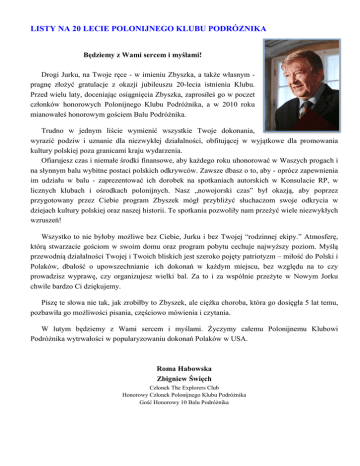 LISTY NA 20 LECIE POLONIJNEGO KLUBU PODRÓZNIKA Będziemy z Wami sercem i myślami! Drogi Jurku, na Twoje ręce - w imieniu Zbyszka, a także własnym pragnę złożyć gratulacje z okazji jubileuszu 20-lecia istnienia Klubu. Przed wielu laty, doceniając osiągnięcia Zbyszka, zaprosiłeś go w poczet członków honorowych Polonijnego Klubu Podróżnika, a w 2010 roku mianowałeś honorowym gościem Balu Podróżnika. Trudno w jednym liście wymienić wszystkie Twoje dokonania, wyrazić podziw i uznanie dla niezwykłej działalności, obfitującej w wyjątkowe dla promowania kultury polskiej poza granicami kraju wydarzenia. Ofiarujesz czas i niemałe środki finansowe, aby każdego roku uhonorować w Waszych progach i na słynnym balu wybitne postaci polskich odkrywców. Zawsze dbasz o to, aby - oprócz zapewnienia im udziału w balu - zaprezentować ich dorobek na spotkaniach autorskich w Konsulacie RP, w licznych klubach i ośrodkach polonijnych. Nasz „nowojorski czas” był okazją, aby poprzez przygotowany przez Ciebie program Zbyszek mógł przybliżyć słuchaczom swoje odkrycia w dziejach kultury polskiej oraz naszej historii. Te spotkania pozwoliły nam przeżyć wiele niezwykłych wzruszeń! Wszystko to nie byłoby możliwe bez Ciebie, Jurku i bez Twojej “rodzinnej ekipy.” Atmosferę, którą stwarzacie gościom w swoim domu oraz program pobytu cechuje najwyższy poziom. Myślą przewodnią działalności Twojej i Twoich bliskich jest szeroko pojęty patriotyzm – miłość do Polski i Polaków, dbałość o upowszechnianie ich dokonań w każdym miejscu, bez względu na to czy prowadzisz wyprawę, czy organizujesz wielki bal. Za to i za wspólnie przeżyte w Nowym Jorku chwile bardzo Ci dziękujemy. Piszę te słowa nie tak, jak zrobiłby to Zbyszek, ale ciężka choroba, która go dosięgła 5 lat temu, pozbawiła go możliwości pisania, częściowo mówienia i czytania. W lutym będziemy z Wami sercem i myślami. Życzymy całemu Polonijnemu Klubowi Podróżnika wytrwałości w popularyzowaniu dokonań Polaków w USA. Roma Habowska Zbigniew Święch Członek The Explorers Club Honorowy Członek Polonijnego Klubu Podróżnika Gość Honorowy 10 Balu Podróżnika