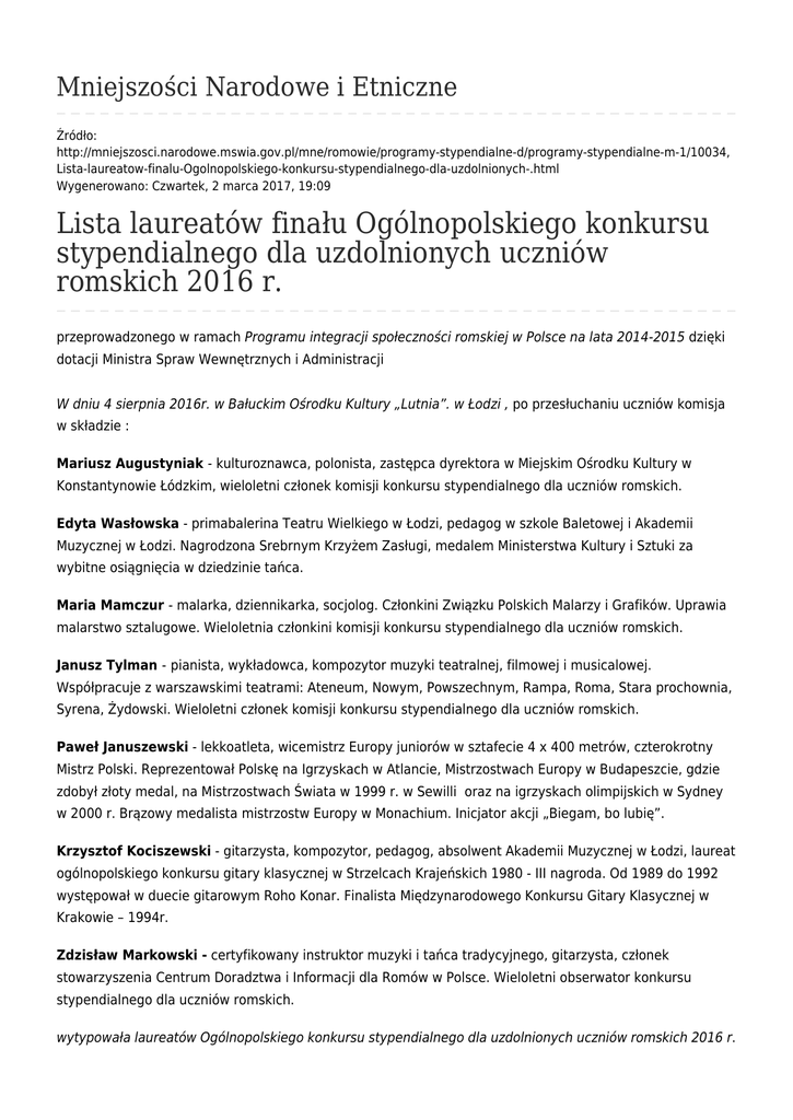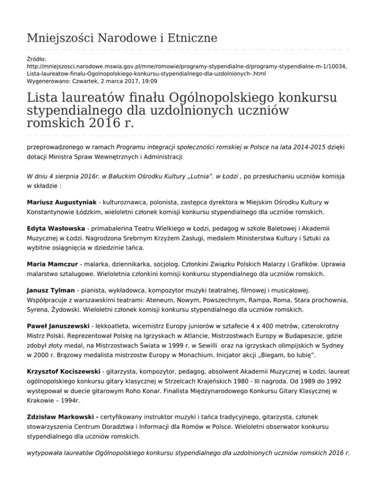 Mniejszości Narodowe i Etniczne Źródło: http://mniejszosci.narodowe.mswia.gov.pl/mne/romowie/programy-stypendialne-d/programy-stypendialne-m-1/10034, Lista-laureatow-finalu-Ogolnopolskiego-konkursu-stypendialnego-dla-uzdolnionych-.html Wygenerowano: Czwartek, 2 marca 2017, 19:09 Lista laureatów finału Ogólnopolskiego konkursu stypendialnego dla uzdolnionych uczniów romskich 2016 r. przeprowadzonego w ramach Programu integracji społeczności romskiej w Polsce na lata 2014-2015 dzięki dotacji Ministra Spraw Wewnętrznych i Administracji W dniu 4 sierpnia 2016r. w Bałuckim Ośrodku Kultury „Lutnia”. w Łodzi , po przesłuchaniu uczniów komisja w składzie : Mariusz Augustyniak - kulturoznawca, polonista, zastępca dyrektora w Miejskim Ośrodku Kultury w Konstantynowie Łódzkim, wieloletni członek komisji konkursu stypendialnego dla uczniów romskich. Edyta Wasłowska - primabalerina Teatru Wielkiego w Łodzi, pedagog w szkole Baletowej i Akademii Muzycznej w Łodzi. Nagrodzona Srebrnym Krzyżem Zasługi, medalem Ministerstwa Kultury i Sztuki za wybitne osiągnięcia w dziedzinie tańca. Maria Mamczur - malarka, dziennikarka, socjolog. Członkini Związku Polskich Malarzy i Grafików. Uprawia malarstwo sztalugowe. Wieloletnia członkini komisji konkursu stypendialnego dla uczniów romskich. Janusz Tylman - pianista, wykładowca, kompozytor muzyki teatralnej, filmowej i musicalowej. Współpracuje z warszawskimi teatrami: Ateneum, Nowym, Powszechnym, Rampa, Roma, Stara prochownia, Syrena, Żydowski. Wieloletni członek komisji konkursu stypendialnego dla uczniów romskich. Paweł Januszewski - lekkoatleta, wicemistrz Europy juniorów w sztafecie 4 x 400 metrów, czterokrotny Mistrz Polski. Reprezentował Polskę na Igrzyskach w Atlancie, Mistrzostwach Europy w Budapeszcie, gdzie zdobył złoty medal, na Mistrzostwach Świata w 1999 r. w Sewilli oraz na igrzyskach olimpijskich w Sydney w 2000 r. Brązowy medalista mistrzostw Europy w Monachium. Inicjator akcji „Biegam, bo lubię”. Krzysztof Kociszewski - gitarzysta, kompozytor, pedagog, absolwent Akademii Muzycznej w Łodzi, laureat ogólnopolskiego konkursu gitary klasycznej w Strzelcach Krajeńskich 1980 - III nagroda. Od 1989 do 1992 występował w duecie gitarowym Roho Konar. Finalista Międzynarodowego Konkursu Gitary Klasycznej w Krakowie – 1994r. Zdzisław Markowski - certyfikowany instruktor muzyki i tańca tradycyjnego, gitarzysta, członek stowarzyszenia Centrum Doradztwa i Informacji dla Romów w Polsce. Wieloletni obserwator konkursu stypendialnego dla uczniów romskich. wytypowała laureatów Ogólnopolskiego konkursu stypendialnego dla uzdolnionych uczniów romskich 2016 r. NAGRODY MINISTRA SPRAW WEWNĘTRZNYCH I ADMINISTRACJI Miejsce I otrzymali: 1. Santiago Gil - kategoria taniec 2. Sebastian Lubecki - kategoria sport 3. Oliwia Szadkowska - kategoria sport 4. Erwin Brzeziński - kategoria sztuki plastyczne 5. Andżelo Andrzej Ciuraja - kategoria śpiew 6. Emilia Leśniak - kategoria muzyka instrumentalna NAGRODY MINISTRA SPRAW WEWNĘTRZNYCH I ADMINISTRACJI Miejsce II otrzymali: 1. Dariusz Bołdyzer - kategoria taniec 2. Wanessa Mirga - kategoria sztuki plastyczne 3. Nikol Linder - kategoria sztuki plastyczne 4. Ewelina Gil - kategoria śpiew 5. Wiktor Dymitrak - kategoria muzyka instrumentalna NAGRODY MINISTRA SPRAW WEWNĘTRZNYCH I ADMINISTRACJI Miejsce III otrzymali: 1. Patrycja Mirga - kategoria taniec 2. Wiktoria Gil - kategoria taniec 3. Bianka Łakatosz - kategoria sport 4. Samanta Paczkowska - kategoria sztuki plastyczne 5. Gracjan Andrasz - kategoria muzyka instrumentalna NAGRODY motywacyjne MINISTRA SPRAW WEWNĘTRZNYCH I ADMINISTRACJI otrzymali: 1. Karolina Mirga - kategoria taniec 2. Natalia Mirga - kategoria sztuki plastyczne 3. Angelika Zimnicka - kategoria śpiew 4. Mikołaj Jaworski - kategoria muzyka instrumentalna 5. Olga Szafira Głowacka - kategoria muzyka instrumentalna Wstecz Drukuj Generuj PDF Powiadom znajomego