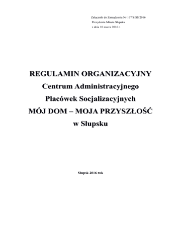 Załącznik do Zarządzenia Nr 167/ZiSS/2016 Prezydenta Miasta Słupska z dnia 10 marca 2016 r. REGULAMIN ORGANIZACYJNY Centrum Administracyjnego Placówek Socjalizacyjnych MÓJ DOM – MOJA PRZYSZŁOŚĆ w Słupsku Słupsk 2016 rok Rozdział I Postanowienia ogólne §1. Regulamin Organizacyjny Centrum Administracyjnego Placówek Socjalizacyjnych MÓJ DOM – MOJA PRZYSZŁOŚĆ, zwany dalej Regulaminem Centrum, określa jego organizację i zasady działania. §2. Ilekroć w regulaminie jest mowa: 1) Centrum - należy przez to rozumieć jednostkę organizacyjną prowadzącą wspólną obsługę ekonomiczno Socjalizacyjnych MÓJ - administracyjną DOM – MOJA i organizacyjną PRZYSZŁOŚĆ Placówek prowadzonych przez Miasto Słupsk 2) Dyrektorze – należy przez to rozumieć Dyrektora Centrum Administracyjnego Placówek Socjalizacyjnych MÓJ DOM – MOJA PRZYSZŁOŚĆ w Słupsku. 3) Koordynatorze - należy przez to rozumieć osobę wychowawcy pełniącego funkcję koordynatora, kierującego i organizującego pracę w określonej Placówce, 4) Placówce - należy przez to rozumieć Placówkę Socjalizacyjną MÓJ DOM – MOJA PRZYSZŁOŚĆ w Słupsku, obsługiwaną przez Centrum. Rozdział II Struktura organizacyjna i szczegółowy zakres działania Centrum §3. 1. W ramach struktury organizacyjnej w Centrum funkcjonują następujące działy oraz samodzielne stanowiska o następujących nazwach i symbolach literowych: 1) Dyrektor – DR 2) Dział Ekonomiczno – Administracyjny – DEA a) Główna Księgowa – GK b) Starszy Referent Administracyjno - Księgowy – SR 2 3) 4) Dział Opieki Specjalistycznej- DOS a) Psycholog – P b) Pracownik Socjalny – PS Placówki prowadzą swoją działalność w wyodrębnionej formie organizacyjnej zgodnie z regulaminami organizacyjnymi Placówek stanowiącymi załączniki do Regulaminu Organizacyjnego Centrum mają określone następujące nazwy i symbole literowe: 2. a) Placówka Socjalizacyjna przy ul. Lutosławskiego 21/2 – PSL, b) Placówka Socjalizacyjna przy ul. Mickiewicza 38/7 i 7a – PSM, c) Placówka Socjalizacyjna przy ul. Tuwima 21a/7 – PST. Do zadań Działu Ekonomiczno - Administracyjnego w szczególności należy: 1) prowadzenie księgowości Centrum zgodnie z obowiązującymi przepisami, 2) prowadzenie kontroli wewnętrznej polegającej na badaniu legalności, rzetelności i prawidłowości, a szczególności dokumentowanie obrotu środkami pieniężnymi, 3) sporządzenie listy płac stosownie do stanu zatrudnienia i obowiązujących zasad wynagradzania oraz dokonywania potrąceń zgodnie z obowiązującymi przepisami, 4) prowadzenie kart wynagrodzeń, 5) zapewnienie należytego przechowywania i zabezpieczania środków finansowych, dowodów księgowych i innych dokumentów finansowych, 6) terminowe i zgodne z przepisami dokonywanie rozliczeń z tytułu wykonywanych na rzecz Centrum dostaw, robót i usług, 7) udział w opracowywaniu planu wydatków Centrum, 8) sporządzanie sprawozdań finansowych, 9) prowadzenie księgowości syntetycznej i analitycznej zgodnie z Zakładowym Planem Kont, 10) terminowe sporządzanie i przesyłanie obowiązujących sprawozdań statystycznych, 11) opracowywanie analiz stanu majątkowego i wyników finansowych zgodnie z Zakładowym Planem Kont i obowiązującymi przepisami, 12) zorganizowanie sporządzania, przyjmowania, obiegu i kontroli dokumentów w sposób zapewniający właściwy przebieg operacji gospodarczych, sprawne przeprowadzanie rachunkowości Centrum, 3 13) kierowanie pracą komisji inwentaryzacyjnej oraz rozliczanie inwentaryzacji, 14) prowadzenie na bieżąco ksiąg „przedmiotów w użytkowaniu” i księgi środków trwałych, 15) odprowadzanie podatku od osób fizycznych, 16) przechowywanie poszczególnych rodzajów akt księgowych zgodnie z oznaczoną Kategorią „B” w archiwum Centrum oraz ich likwidowanie po upływie ustalonego okresu przechowywania w trybie ustalonym odrębnymi przepisami, 17) prowadzenie z Dyrektorem lub osobą przez niego wyznaczoną kontroli wewnętrznej, 18) kontrolowanie wspólnie z Dyrektorem wykonywania obowiązków przez pracowników administracji i obsługi, 19) prowadzenie dokumentacji dzieci oraz pracowników dotyczącej składek ZUS, 20) sporządzanie deklaracji rozliczeniowych do właściwego Urzędu Skarbowego dotyczących podatku dochodowego od osób fizycznych, 21) organizowanie i prowadzenie zakupów, remontów, inwestycji oraz zlecanie wykonywania usług, 22) organizowanie obiegu dokumentów i przepływu informacji, 23) utrzymywanie obiektów i pomieszczeń, instalacji, maszyn i urządzeń w należytym stanie technicznym, 24) zapewnienie właściwego transportu i komunikacji. 3. Do zadań Działu Opieki Specjalistycznej w szczególności należy: 1) rozpoznawanie sytuacji wychowawczej, opiekuńczej, prawnej i osobistej dzieci, koordynowanie spraw związanych z ich kształceniem i edukacją, 2) opracowanie indywidualnej diagnozy dziecka, 3) poradnictwo psychologiczne dla rodziców dzieci przebywających w Placówkach, 4) prowadzenie zajęć terapeutycznych, rekompensujących brak wychowania w środowisku rodzinnym i przygotowanie do życia społecznego, 5) współudział w opracowaniu indywidualnego planu pracy z dzieckiem, 6) prowadzenie całościowych badań psychologicznych służących poznaniu każdego dziecka zgodnie z przydziałem obowiązków, 4 7) wykrywanie źródeł niepowodzeń szkolnych zaburzeń rozwojowych i trudności wychowawczych oraz ustalenie właściwych metod oddziaływania na dziecko, 8) ukierunkowanie działań podejmowanych przez wychowawców wobec dzieci przebywających w Placówce, 9) sprawowanie indywidualnej opieki psychopedagogicznej nad dziećmi sprawiającymi szczególne trudności wychowawcze, 10) prowadzenie z dziećmi zajęć grupowych i indywidualnych o charakterze psychoterapeutycznym oraz korekcyjnym, 11) współpraca z rodzicami, szkołami, sądami, policją, służbą zdrowia, poradniami wychowaw