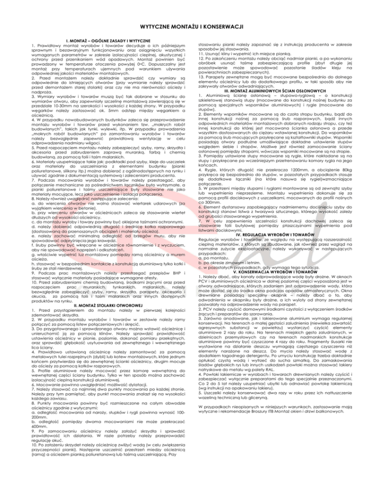 WYTYCZNE MONTAŻU I KONSERWACJI I. MONTAŻ – OGÓLNE ZASADY I WYTYCZNE 1. Prawidłowy montaż wyrobów i towarów decyduje o ich późniejszym sprawnym i bezawaryjnym funkcjonowaniu oraz osiągnięciu wszystkich wymaganych parametrów w zakresie izolacyjności cieplnej, akustycznej i ochrony przed przenikaniem wód opadowych. Montaż powinien być prowadzony w temperaturze otoczenia powyżej 0oC. Dopuszczalny jest montaż przy temperaturach ujemnych pod warunkiem używania odpowiedniej jakości materiałów montażowych. 2. Przed montażem należy dokładnie sprawdzić czy wymiary są odpowiednie do istniejących otworów (przy wymianie należy sprawdzić przed demontażem starej stolarki) oraz czy nie ma nierówności ościeży i nadproża. 3. Wymiary wyrobów i towarów muszą być tak dobrane w stosunku do wymiarów otworu, aby zapewniały szczelinę montażową zawierającą się w przedziale 10-30mm na szerokości i wysokości z każdej strony. W przypadku węgarków należy zastosować ok. 5mm odstęp między węgarkiem a ościeżnicą. 4. W przypadku nowobudowanych budynków zaleca się przeprowadzenie montażu wyrobów i towarów przed wykonaniem tzw. „mokrych robót budowlanych”, takich jak tynki, wylewki, itp. W przypadku prowadzenia „mokrych robót budowlanych” po zamontowaniu wyrobów i towarów należy bezwzględnie zapewnić prawidłową wentylację w celu odprowadzenia nadmiaru wilgoci. 5. Przed rozpoczęciem montażu należy zabezpieczyć szyby, ramy, skrzydła i akcesoria przed zabrudzeniem zaprawą murarską, farbą i chemią budowlaną, za pomocą folii i taśm malarskich. 6. Materiały uzupełniające takie jak: podkładki pod szyby, kleje do uszczelek oraz materiały do uszczelniania z elementami budynku (pianki poliuretanowe, silikony itp.) można dobierać z ogólnodostępnych na rynku i używać zgodnie z dokumentacją systemową i zaleceniami producenta. 7. Podczas mocowania wyrobów i towarów należy przestrzegać, aby połączenie mechaniczne za pośrednictwem łączników było wytrzymałe, a pianki poliuretanowe i taśmy uszczelniające były stosowane nie jako materiały mocujące, lecz jako uszczelnienie i izolacja połączenia. 8. Należy również uwzględnić następujące zalecenia: a. do wiercenia otworów nie wolno stosować wiertarek udarowych (za wyjątkiem wiercenia w betonie). b. przy wierceniu otworów w ościeżnicach zaleca się stosowanie wierteł dłuższych od wysokości ościeżnicy. c. do montażu wyroby i towary powinny być oklejone taśmami ochronnymi. d. należy dobierać odpowiednią długość i średnicę kołka rozporowego (dostosowaną do przenoszonych obciążeń i materiału ościeża). e. należy zachować minimalną odległość od brzegów muru, aby nie spowodować odpryśnięcia jego krawędzi. f. śruby powinny być wkręcane w ościeżnice równomiernie i z wyczuciem, aby nie spowodować naprężeń i odkształceń. g. właściwie wypełnić luz montażowy pomiędzy ramą ościeżnicy a murem ościeża. h. stosować w bezpośrednim kontakcie z konstrukcją aluminiową tylko kołki i śruby ze stali nierdzewnej. 9. Podczas prac montażowych należy przestrzegać przepisów BHP i stosować wyłącznie materiały posiadające wymagane atesty. 10. Przed zabrudzeniami chemią budowlaną, środkami żrącymi oraz przed rozpoczęciem prac murarskich, tynkarskich, malarskich, należy bezwzględnie zabezpieczyć szyby, ramy, skrzydła, parapety, akcesoria i okucia, za pomocą folii i taśm malarskich oraz innych dostępnych produktów na rynku. II. MONTAŻ STOLARKI OTWOROWEJ 1. Przed przystąpieniem do montażu należy w pierwszej kolejności zdemontować skrzydła. 2. W przypadku montażu wyrobów i towarów w zestawie należy ramy połączyć za pomocą listew połączeniowych i skręcić. 3. Do przygotowanego i sprawdzonego otworu można wstawić ościeżnicę i unieruchomić ją za pomocą klinów. Należy sprawdzić prawidłowość ustawienia ościeżnicy w pionie, poziomie, dokonać pomiaru przekątnych, oraz sprawdzić głębokość usytuowania od zewnętrznego i wewnętrznego lica ściany. 4. Prawidłowo ustawioną ościeżnicę należy zamontować za pomocą metalowych tulei rozprężnych (dybli) lub kotew montażowych, które jednym końcem przytwierdza się do zewnętrznej ścianki ościeżnicy, drugim mocuje do ościeży za pomocą kołków rozporowych. 5. Profile aluminiowe należy mocować przez komorę wewnętrzną do wewnętrznej części ściany budynku. Tylko w ten sposób można zachować izolacyjność cieplną konstrukcji aluminiowej. 6. Mocowanie powinno uwzględniać możliwość dylatacji. 7. Należy stosować co najmniej dwa punkty mocowania po każdej stronie. Należy przy tym pamiętać, aby punkt mocowania znalazł się na wysokości każdego zawiasu. 8. Punkty mocowania powinny być rozmieszczone na całym obwodzie ościeżnicy zgodnie z wytycznymi: a. odległość mocowania od naroży, słupków i rygli powinna wynosić 100200mm. b. odległość pomiędzy dwoma mocowaniami nie może przekraczać 600mm. 9. Po zamocowaniu ościeżnicy należy założyć skrzydła i sprawdzić prawidłowość ich działania. W razie potrzeby należy przeprowadzić regulację okuć. 10. Po założeniu skrzydeł należy ościeżnicę zwilżyć wodą (w celu zwiększenia przyczepności pianki). Następnie uszczelnić przestrzeń miedzy ościeżnicą (ramą) a ościeżem pianką poliuretanową lub taśmą uszczelniającą. Przy stosowaniu pianki należy zapoznać się z instrukcją producenta w zakresie sposobów jej stosowania. 11. Usunąć kliny i wypełnić ich miejsce pianką. 12. Po zakończeniu montażu należy obciąć nadmiar pianki, a po wykonaniu obróbek usunąć taśmę zabezpieczającą profile (zbyt długie jej pozostawienie może spowodować pozostanie śladów kleju na powierzchniach zabezpieczanych). 13. Parapety zewnętrzne mogą być mocowane bezpośrednio do dolnego elementu ościeżnicy lub do 
