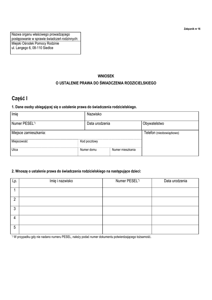 Załącznik nr 16 Nazwa organu właściwego prowadzącego postępowanie w sprawie świadczeń rodzinnych: Miejski Ośrodek Pomocy Rodzinie ul. Langego 6, 08-110 Siedlce WNIOSEK O USTALENIE PRAWA DO ŚWIADCZENIA RODZICIELSKIEGO Część I 1. Dane osoby ubiegającej się o ustalenie prawa do świadczenia rodzicielskiego. Imię Nazwisko Numer PESEL*) Data urodzenia Obywatelstwo Miejsce zamieszkania: Telefon (nieobowiązkowo) Miejscowość Kod pocztowy Ulica Numer domu Numer mieszkania 2. Wnoszę o ustalenie prawa do świadczenia rodzicielskiego na następujące dzieci: Lp. Imię i nazwisko Numer PESEL*) 1 2 3 4 5 *) W przypadku gdy nie nadano numeru PESEL, należy podać numer dokumentu potwierdzającego tożsamość. Data urodzenia Część II Oświadczenie służące ustaleniu prawa do świadczenia rodzicielskiego Oświadczam, że: a) powyższe dane są prawdziwe, b) zapoznałam/zapoznałem*) się z warunkami uprawniającymi do świadczenia rodzicielskiego, c) nie otrzymuję zasiłku macierzyńskiego lub uposażenia za okres ustalony przepisami Kodeksu pracy jako okres urlopu macierzyńskiego, okres urlopu na warunkach urlopu macierzyńskiego lub okres urlopu rodzicielskiego, d) drugi z rodziców nie otrzymuje zasiłku macierzyńskiego lub uposażenia za okres ustalony przepisami Kodeksu pracy jako okres urlopu macierzyńskiego, okres urlopu na warunkach urlopu macierzyńskiego lub okres urlopu rodzicielskiego, e) osoba będąca rodziną zastępczą lub opiekunem faktycznym dziecka nie otrzymuje zasiłku macierzyńskiego lub uposażenia za okres ustalony przepisami Kodeksu pracy jako okres urlopu macierzyńskiego, okres urlopu na warunkach urlopu macierzyńskiego lub okres urlopu rodzicielskiego**); f) dziecko nie zostało umieszczone w pieczy zastępczej, ***) g) w związku z wychowywaniem tego samego dziecka lub w związku z opieką nad tym samym dzieckiem nie ma ustalonego prawa do świadczenia rodzicielskiego, dodatku do zasiłku rodzinnego z tytułu opieki nad dzieckiem w okresie korzystania z urlopu wychowawczego, świadczenia pielęgnacyjnego, specjalnego zasiłku opiekuńczego lub zasiłku dla opiekuna, o którym mowa w ustawie z dnia 4 kwietnia 2014 r. o ustaleniu i wypłacie zasiłków dla opiekunów, h) nie przysługuje mi za granicą świadczenie o podobnym charakterze do świadczenia rodzicielskiego chyba, że przepisy o koordynacji systemów zabezpieczenia społecznego lub dwustronne umowy o zabezpieczeniu społecznym stanowią, że przysługujące za granicą świadczenie o podobnym charakterze do świadczenia rodzicielskiego nie wyłącza prawa do takiego świadczenia na podstawie ustawy, i) nie podjęłam/nie podjąłem*) ani nie kontynuuję zatrudnienia lub innej pracy zarobkowej, która uniemożliwia mi sprawowanie osobistej opieki nad dzieckiem, j) nie mam ustalonego prawa do świadczenia pielęgnacyjnego, specjalnego zasiłku opiekuńczego, dodatku do zasiłku rodzinnego z tytułu opieki nad dzieckiem w okresie korzystania z urlopu wychowawczego lub zasiłku dla opiekuna, o którym mowa w ustawie z dnia 4 kwietnia 2014 r. o ustaleniu i wypłacie zasiłków dla opiekunów, k) matka dziecka urodziła dziecko/nie urodziła dziecka*), którego dotyczy wniosek w okresie pobierania zasiłku dla bezrobotnych lub w ciągu miesiąca po jego zakończeniu, lub w okresie przedłużenia pobierania zasiłku dla bezrobotnych na podstawie art. 73 ust. 3 ustawy z dnia 20 kwietnia 2004 r. o promocji zatrudnienia i instytucjach rynku pracy (Dz. U. z 2015 r. poz. 149, z późn. zm.)****), l) przebywam/nie przebywam*) poza granicami Rzeczypospolitej Polskiej*****) w państwie, w którym mają zastosowanie przepisy o koordynacji systemów zabezpieczenia społecznego*****), m) członek mojej rodziny, w rozumieniu art. 3 pkt 16 ustawy z dnia 28 listopada 2003 r. o świadczeniach rodzinnych, przebywa/nie przebywa*) poza granicami Rzeczypospolitej Polskiej*****) w państwie, w którym mają zastosowanie przepisy o koordynacji systemów zabezpieczenia społecznego******). *) **) ***) ****) *****) *****) Niepotrzebne skreślić. Dotyczy osób, o których mowa w art. 17c ust. 1 pkt 2 i 3 ustawy (opiekuna faktycznego dziecka i rodziny zastępczej). Nie dotyczy osób, o których mowa w art. 17c ust. 1 pkt 2 i 3 ustawy (opiekuna faktycznego dziecka i rodziny zastępczej). Nie dotyczy osób, o których mowa w art. 17c ust. 1 pkt 2- 4 ustawy (opiekuna faktycznego dziecka, rodziny zastępczej, osoby, która przysposobiła dziecko). Nie dotyczy wyjazdu lub pobytu turystycznego, leczniczego lub związanego z podjęciem przez dziecko kształcenia poza granicami Rzeczypospolitej Polskiej. Przepisy o koordynacji systemów zabezpieczenia społecznego mają zastosowanie na terenie: Austrii, Belgii, Danii, Finlandii, Francji, Grecji, Hiszpanii, Holandii, Irlandii, Luksemburga, Niemiec, Portugalii, Szwecji, Włoch, Wielkiej Brytanii, Cypru, Czech, Estonii, Litwy, Łotwy, Malty, Polski, Słowacji, Słowenii, Węgier, Bułgarii, Rumunii. Norwegii, Islandii, Liechtensteinu, Szwajcarii oraz od 1 lipca 2013 r. Chorwacji. ................................................................ (data, podpis osoby ubiegającej się) W przypadku zmian mających wpływ na prawo do świadczenia rodzicielskiego, w szczególności zaistnienia okoliczności wymienionych powyżej, w tym również w przypadku wyjazdu osoby uprawnionej lub członka rodziny tej osoby poza granicę Rzeczypospolitej Polskiej, osoba ubiegająca się jest obowiązana niezwłocznie powiadomić o tych zmianach podmiot realizujący świadczenia rodzinne. Niepoinformowanie organu właściwego prowadzącego postępowanie w sprawie świadczeń rodzinnych o zmianach, o których mowa powyżej, może skutkować powstaniem nienależnie pobranych świadczeń rodzinnych, a w konsekwencji − koniecznością ich zwrotu wraz z odsetkami ustawowymi za opóźnienie. ................................................................ (data, podpis osoby ubiegającej się) Do 
