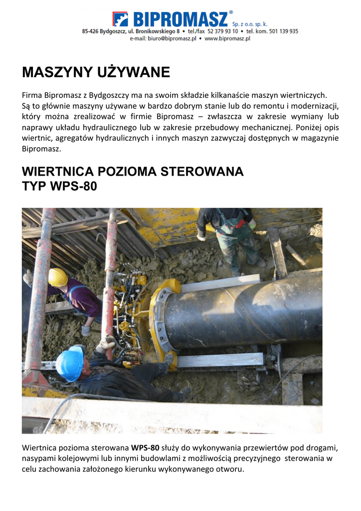 MASZYNY UŻYWANE FirmaBipromaszzBydgoszczymanaswoimskładziekilkanaściemaszynwiertniczych. Sątogłówniemaszynyużywanewbardzodobrymstanielubdoremontuimodernizacji, który można zrealizować w firmie Bipromasz – zwłaszcza w zakresie wymiany lub naprawyukładuhydraulicznegolubwzakresieprzebudowymechanicznej.Poniżejopis wiertnic,agregatówhydraulicznychiinnychmaszynzazwyczajdostępnychwmagazynie Bipromasz. WIERTNICA POZIOMA STEROWANA TYP WPS-80 WiertnicapoziomasterowanaWPS-80służydowykonywaniaprzewiertówpoddrogami, nasypamikolejowymilubinnymibudowlamizmożliwościąprecyzyjnegosterowaniaw celuzachowaniazałożonegokierunkuwykonywanegootworu. Wiertnicasłużydowykonywaniarurociągówwzakresieśredniczewnętrznychod190 do813mmodługoścido60m.Dowierceniaużywasięnarzędziirurodługości roboczej1m,2mlub3m–wzależnościoddostępnejprzestrzeninawykonaniekomory startowej. Komorą startową wiertnicy jest standardowo wykop prostokątny zabezpieczony ścianami rozporowymi i larsenami z zagęszczonym gruntem za ścianą oporową: szerokośćmin2,5m,długośćmin2,8m. WiertnicaWPS-80jestprzeznaczonaprzedewszystkimdopracywtechnologiiwiercenia nasuchowgruntachlekkichiśredniospoistych.Wpierwszymetapiewciskanajestżerdź kontrolowana systemem teleoptycznym. Drugim etapem jest wiercenie ślimakiem w stalowych rurach osłonowych. Główne zastosowanie standardowej technologii to wykonywanie przewiertów o niewielkich spadkach i instalowanie rurociągów kanalizacyjnych. Wiertnica może być również wykorzystywana do pracy w innych technologiach.Obszarpracywiertnicynacałymodcinkuprzewiertunależyodwodnić. WiertnicaWPS-80powinnabyćzasilanazagregatuhydraulicznegotypuHAS-90lub120. Dostępna wiertnica używana WPS-80 (produkcja Wamet 2013) i agregat hydrauliczny spalinowyHAS-80(produkcjaBipromasz2012)(1kpl.): Technologiawykonywaniaprzewiertuzapomocąwiertnicpoziomej sterowanejWSP-50S Przeciskaniezobrotemżerdzipilotowej(sterowaniezpodglądemteleoptycznym) Wiercenieślimakiemiwciskanierurosłonowychstalowych(wgruntachlekkichiśrednio zwięzłych) Wierceniegłowicąznożamiodchylnymiiwciskanierurosłonowychstalowych(w gruntachzwięzłych) Wiercenieślimakiemnawlekanymnażerdź(przewiertbezkomorywyjściowej) Wciskanierurinstalacyjnychprzeciskowychiwypychanierurosłonowych WyciąganierurosłonowychiwciąganierurPE Wiercenieposzerzaczemzwłasnymnapędemhydraulicznym-wypychaniestalowejrury osłonowej, wciskanierurinstalacyjnychprzeciskowychośrednicyØD.