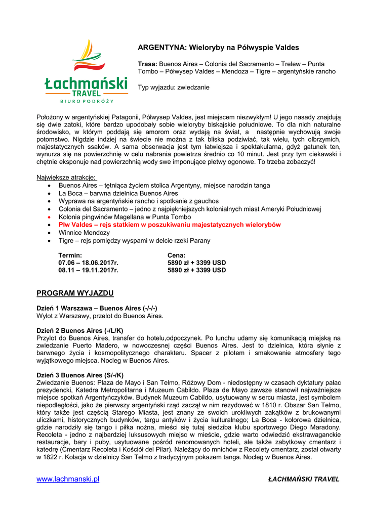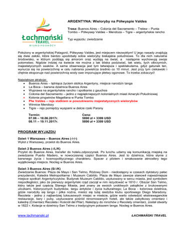 ARGENTYNA: Wieloryby na Półwyspie Valdes Trasa: Buenos Aires – Colonia del Sacramento – Trelew – Punta Tombo – Półwysep Valdes – Mendoza – Tigre – argentyńskie rancho Typ wyjazdu: zwiedzanie Położony w argentyńskiej Patagonii, Półwysep Valdes, jest miejscem niezwykłym! U jego nasady znajdują się dwie zatoki, które bardzo upodobały sobie wieloryby biskajskie południowe. To dla nich naturalne środowisko, w którym poddają się amorom oraz wydają na świat, a następnie wychowują swoje potomstwo. Nigdzie indziej na świecie nie można z tak bliska podziwiać, tak wielu, tych olbrzymich, majestatycznych ssaków. A sama obserwacja jest tym łatwiejsza i spektakularna, gdyż gatunek ten, wynurza się na powierzchnię w celu nabrania powietrza średnio co 10 minut. Jest przy tym ciekawski i chętnie eksponuje nad powierzchnią wody swe imponujące płetwy ogonowe. To trzeba zobaczyć! Największe atrakcje: Buenos Aires – tętniąca życiem stolica Argentyny, miejsce narodzin tanga La Boca – barwna dzielnica Buenos Aires Wyprawa na argentyńskie rancho i spotkanie z gauchos Colonia del Sacramento – jedno z najpiękniejszych kolonialnych miast Ameryki Południowej Kolonia pingwinów Magellana w Punta Tombo Płw Valdes – rejs statkiem w poszukiwaniu majestatycznych wielorybów Winnice Mendozy Tigre – rejs pomiędzy wyspami w delcie rzeki Parany Termin: 07.06 – 18.06.2017r. 08.11 – 19.11.2017r. Cena: 5890 zł + 3399 USD 5890 zł + 3399 USD PROGRAM WYJAZDU Dzień 1 Warszawa – Buenos Aires (-/-/-) Wylot z Warszawy, przelot do Buenos Aires. Dzień 2 Buenos Aires (-/L/K) Przylot do Buenos Aires, transfer do hotelu,odpoczynek. Po lunchu udamy się komunikacją miejską na zwiedzanie Puerto Madero, w nowoczesnej części Buenos Aires. Jest to dzielnica, która słynie z barwnego życia i kosmopolitycznego charakteru. Spacer z pilotem i smakowanie atmosfery tego wyjątkowego miejsca. Nocleg w Buenos Aires. Dzień 3 Buenos Aires (S/-/K) Zwiedzanie Buenos: Plaza de Mayo i San Telmo, Różowy Dom - niedostępny w czasach dyktatury pałac prezydencki, Katedra Metropolitarna i Muzeum Cabildo. Plaza de Mayo zawsze stanowił najważniejsze miejsce spotkań Argentyńczyków. Budynek Muzeum Cabildo, usytuowany w sercu miasta, jest symbolem niepodległości, jako że pierwszy argentyński rząd zaczął w nim rezydować w 1810 r. Obszar San Telmo, który także jest częścią Starego Miasta, jest znany ze swoich urokliwych zakątków z brukowanymi uliczkami, historycznych budynków, targu antyków i życia kulturalnego; La Boca - kolorowa dzielnica, gdzie narodziły się tango i piłka nożna, mieści się tutaj siedziba klubu sportowego Diego Maradony. Recoleta - jedno z najbardziej luksusowych miejsc w mieście, gdzie warto odwiedzić ekstrawaganckie restauracje, bary i puby, usytuowane pośród renomowanych hoteli, ale także zabytkowy cmentarz i katedrę (Cmentarz Recoleta i Kościół del Pilar). Należący do mnichów z Recolety cmentarz, został otwarty w 1822 r. Kolacja w dzielnicy San Telmo z tradycyjnym pokazem tanga. Nocleg w Buenos Aires. www.lachmanski.pl ŁACHMAŃSKI TRAVEL Dzień 4 Colonia del Sacramento (S/L/K) Rejs statkiem po wodach La Platy, do Colonia del Sacramento w Urugwaju. Jest to jedno z piękniejszych, kolonialnych miast Ameryki Południowej, w którym podziwiać można zwłaszcza Stare Miasto, założone przez Portugalczyków w XVII w. (UNESCO), w którego skład wchodzą: mury obronne, bazylika, oryginalne ulice budowane przez portugalskich osadników. Nocleg w Buenos Aires. Dzień 5 Trelew – Punta Tombo – Puerto Madryn (S/-/K) Wcześnie rano transfer na lotnisko i przelot do Trelew. Po przylocie przejazd do Punta Tombo. Podczas tej wycieczki zawitamy do największej w Ameryce Południowej kolonii pingwinów Magellana. Będzie okazja do obserwowania wspólnego życia nie tylko pingwinów, ale także mew, wydrzyków, petreli i kormoranów. Następnie przejazd do Puerto Madryn. Nocleg w Puerto Madryn. Dzień 6 Półwysep Valdes (S/-/K) Wyruszymy na zwiedzanie Półwyspu Valdes (UNESCO) – najsłynniejszego półwyspu argentyńskiego wybrzeża. Na Półwyspie żyje wiele gatunków zwierząt: słonie morskie, pingwiny Magellana, guanako, lwy morskie, mary patagońskie, etc. Jednak rejon dwóch zatok wcinających się w półwysep, upodobały sobie w sposób szczególny, wieloryby. W programie wycieczki: Istmo Ameghino – małe muzeum poświęcone dzikiej przyrodzie półwyspu, Puerto Piramides – mała wioska, skąd wypłyniemu w rejs statkiem na obsewrację wielorybów, orek oraz szarych delfinów. Udamy się także na Playa Doradilla, a także odwiedzimy kilka pozostałych punktów panoramicznych, skąd można obserwować wieloryby eksponujące swe ogromne płetwy ogonowe ponad powierzchnią wody, a także kolonie słoni morskich, lwów morskich oraz pingwinów Magellana. Nocelg w Puerto Madryn. Dzień 7 Mendoza (S/-/K) Przelot do Mendozy. Po przylocie - transfer do hotelu, zakwaterowanie. Mendoza to kraina słońca, położona u podnóża górujących szczytów Andów. Jest stolicą argentyńskiego wina. W okolicy zlokalizowanych jest ok. 2 000 winnic. Niemal 90 % argentyńskiego wina pochodzi z rejonu Mendozy. Tego dnia czeka nas city tour w formie spaceru po mieście, zobaczymy m.in.: Plac Niepodległości, Plac Hiszpański, Kościół Jezuitów. Nocleg Mendozie. Dzień 8 Mendoza – winnice (S/L/K) Całodniowa wycieczka po winnicach Mendozy. Zwiedzanie rozpoczniemy od przejazdu do Maipu, gdzie znajduje się Krajowe Muzeum Wina. Następnie będziemy podróżować po żyznych równinach regionu, poprzecinanych sieciami kanałów nawadniających, z których część powstała jeszcze w czasach prekolumbijskich. Ukształtowanie powierzchni, żyzne gleby oraz suchy, umiarkowany klimat, uwarunkowały rozwój upraw winorośli i przemysłu winiarskiego w tym regionie. Odwiedzimy kilka uznanych winnic. Nocleg w Mendozie. Dzień 9 Mendoz