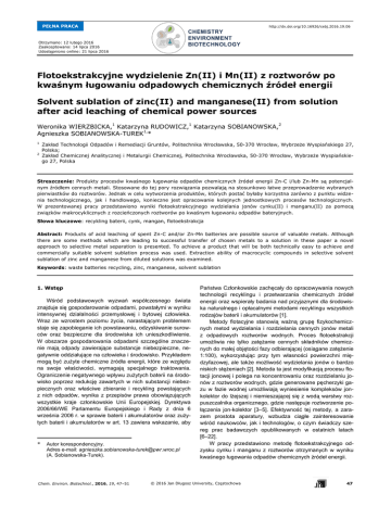 PEŁNA PRACA http://dx.doi.org/10.16926/cebj.2016.19.06 Otrzymano: 12 lutego 2016 Zaakceptowano: 14 lipca 2016 Udostępniono online: 21 lipca 2016 Flotoekstrakcyjne wydzielenie Zn(II) i Mn(II) z roztworów po kwaśnym ługowaniu odpadowych chemicznych źródeł energii Solvent sublation of zinc(II) and manganese(II) from solution after acid leaching of chemical power sources Weronika WIERZBICKA,1 Katarzyna RUDOWICZ,1 Katarzyna SOBIANOWSKA,2 Agnieszka SOBIANOWSKA-TUREK1,* 1 2 Zakład Technologii Odpadów i Remediacji Gruntów, Politechnika Wrocławska, 50-370 Wrocław, Wybrzeże Wyspiańskiego 27, Polska; Zakład Chemicznej Analitycznej i Metalurgii Chemicznej, Politechnika Wrocławska, 50-370 Wrocław, Wybrzeże Wyspiańskiego 27, Polska Streszczenie: Produkty procesów kwaśnego ługowania odpadów chemicznych źródeł energii Zn-C i/lub Zn-Mn są potencjalnym źródłem cennych metali. Stosowane do tej pory rozwiązania pozwalają na stosunkowo łatwe przeprowadzenie wybranych pierwiastków do roztworów. Jednak w celu wytworzenia produktów, których postać byłaby korzystna zarówno z punktu widzenia technologicznego, jak i handlowego, konieczne jest opracowanie kolejnych jednostkowych procesów technologicznych. W prezentowanej pracy przedstawiono wyniki flotoekstrakcyjnego wydzielania jonów cynku(II) i manganu(II) za pomocą związków makrocyklicznych z rozcieńczonych roztworów po kwaśnym ługowaniu odpadów bateryjnych. Słowa kluczowe: recykling baterii, cynk, mangan, flotoekstrakcja Abstract: Products of acid leaching of spent Zn-C and/or Zn-Mn batteries are possible source of valuable metals. Although there are some methods which are leading to successful transfer of chosen metals to a solution in these paper a novel approach to selective metal separation is presented. To achieve a product that will be both technically easy to achieve and commercially suitable solvent sublation process was used. Extraction ability of macrocyclic compounds in selective solvent sublation of zinc and manganese from diluted solutions was examined. Keywords: waste batteries recycling, zinc, manganese, solvent sublation 1. Wstęp 1 Wśród podstawowych wyzwań współczesnego świata znajduje się gospodarowanie odpadami, powstałymi w wyniku intensywnej działalności przemysłowej i bytowej człowieka. Wraz ze wzrostem poziomu życia, narastającym problemem staje się zapobieganie ich powstawaniu, odzyskiwanie surowców oraz bezpieczne dla środowiska ich unieszkodliwienie. W obszarze gospodarowania odpadami szczególne znaczenie mają odpady zawierające substancje niebezpieczne, negatywnie oddziałujące na człowieka i środowisko. Przykładem mogą być zużyte chemiczne źródła energii, które ze względu na swoje właściwości, wymagają specjalnego traktowania. Ograniczenie negatywnego wpływu zużytych baterii na środowisko poprzez redukcję zawartych w nich substancji niebezpiecznych oraz właściwe zbieranie i recykling powstających z nich odpadów, wynika z przepisów prawa obowiązujących wszystkie kraje członkowskie Unii Europejskiej. Dyrektywa 2006/66/WE Parlamentu Europejskiego i Rady z dnia 6 września 2006 r. w sprawie baterii i akumulatorów oraz zużytych baterii i akumulatorów w art. 13 zawiera wskazanie, aby * Autor korespondencyjny. Adres e-mail: [email protected] (A. Sobianowska-Turek). Chem. Environ. Biotechnol., 2016, 19, 47–51 Państwa Członkowskie zachęcały do opracowywania nowych technologii recyklingu i przetwarzania chemicznych źródeł energii oraz wspierały badania nad przyjaznymi dla środowiska naturalnego i opłacalnymi metodami recyklingu wszystkich rodzajów baterii i akumulatorów [1]. Metody flotacyjne stanowią ważną grupę fizykochemicznych metod wydzielania i rozdzielania cennych jonów metali z odpadowych roztworów wodnych. Proces flotoekstrakcji umożliwia nie tylko zatężanie cennych składników chemicznych do małej objętości fazy odbierającej (osiągane zatężenie 1:100), wykorzystując przy tym własności powierzchni międzyfazowej, ale także możliwość wydzielania jonów o bardzo niskich stężeniach [2]. Metoda ta jest modyfikacją procesu flotacji jonowej i polega na koncentrowaniu oraz rozdzielaniu jonów z roztworów wodnych, gdzie generowane pęcherzyki gazu w fazie wodnej umożliwiają wyniesienie kompleksów jonkolektor do lżejszej i niemieszającej się z wodą warstwy rozpuszczalnika organicznego, gdzie następuje roztworzenie połączenia jon-kolektor [3–5]. Efektywność tej metody, a zarazem prostota aparatury, wzbudza ciągłe zainteresowanie wśród naukowców, jak i technologów, o czym świadczy szereg prac badawczych opublikowanych w ostatnich latach [6–22]. W pracy przedstawiono metodę flotoekstrakcyjnego odzysku cynku i manganu z roztworów otrzymanych w wyniku kwaśnego ługowania odpadów chemicznych źródeł energii. © 2016 Jan Długosz University, Częstochowa 47 Flotoekstrakcyjne wydzielenie Zn(II) i Mn(II) z roztworów po kwaśnym ługowaniu odpadowych... W. Wierzbicka, K. Rudowicz, K. Sobianowska, A. Sobianowska-Turek* 2. Część eksperymentalna 2.3. Badane roztwory 2.1. Metodyka pomiarów flotoekstrakcji Badaniom wstępnym został poddany modelowy roztwór wodny zawierający 0.428 mg/l jonów Zn(II) oraz 0.200 mg/l jonów Mn(II), poprzez rozpuszczenie odpowiedniej naważki ZnSO4∙7H2O i MnSO4∙5H2O o czystości analitycznej (Alchem) w wodzie demineralizowanej. Stosunek wagowy Zn:Mn wynoszący 2.14:1.00 odpowiadał proporcji tych metali w roztworze rzeczywistym. Procedury przygotowania roztworu rzeczywistego zawierającego 55.0 g/dm3 jonów Zn(II) i 25.7 g/dm3 jonów Mn(II) szczegółowo opisano w pracy [23]. Efektywność wydzielenia i/lub rozdzielenia jonów cynku(II) i manganu(II) z rozcieńczonych roztworów wodnych badano w odniesieniu do głównych czynników wpływających na proces flotoekstrakcji, tj. odczynu flotowanego roztworu oraz rodzaju zastosowanego związku makr